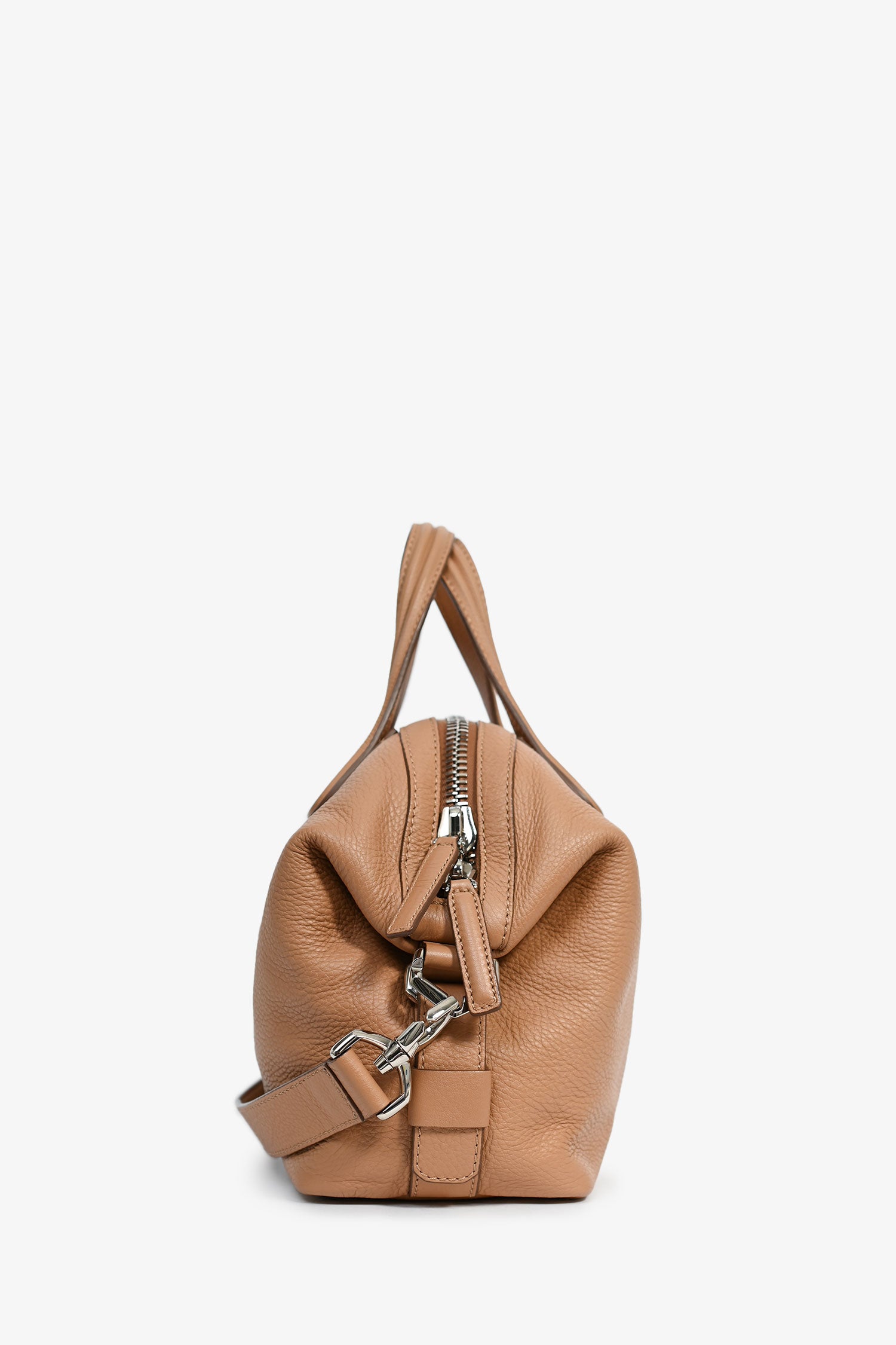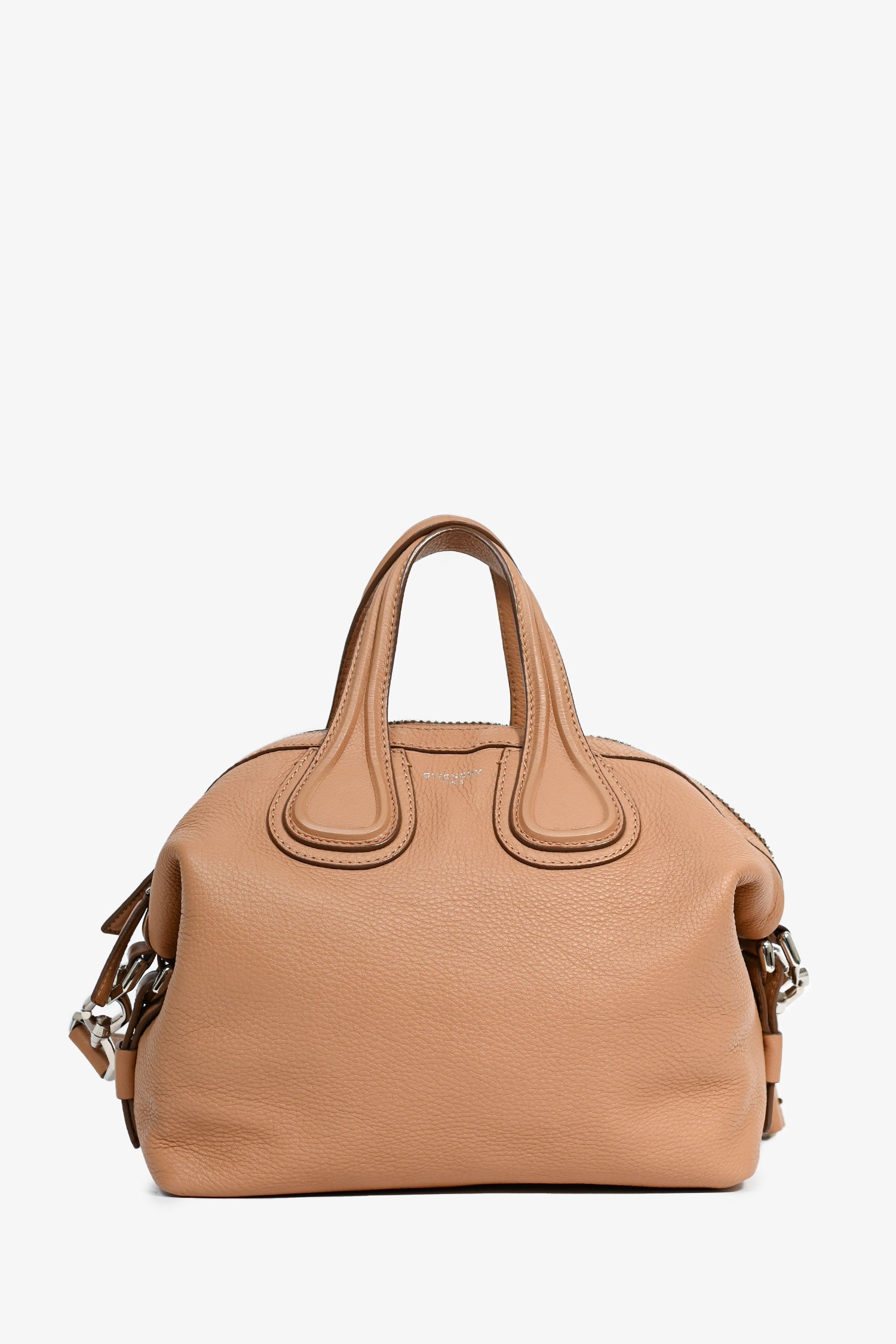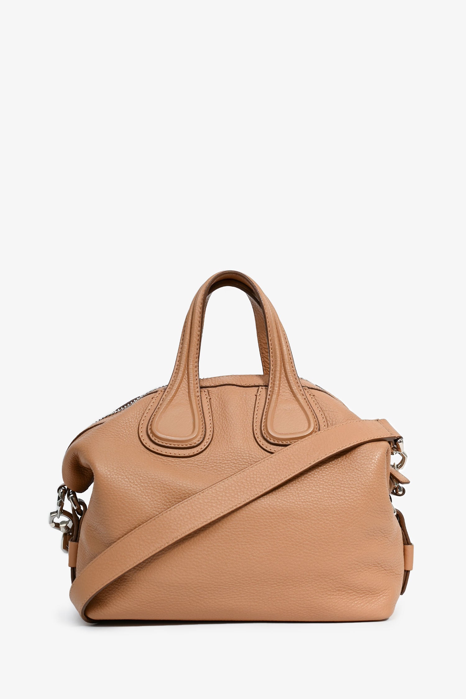 Refresh availabilityGivenchy Beige Leather Nightingale Crossbody Bag. Dual top handles. Silver-tone hardware. Lined interior with a zipped compartment and 2 pockets. Single crossbody strap. Coated trimming. Tonal stitching.