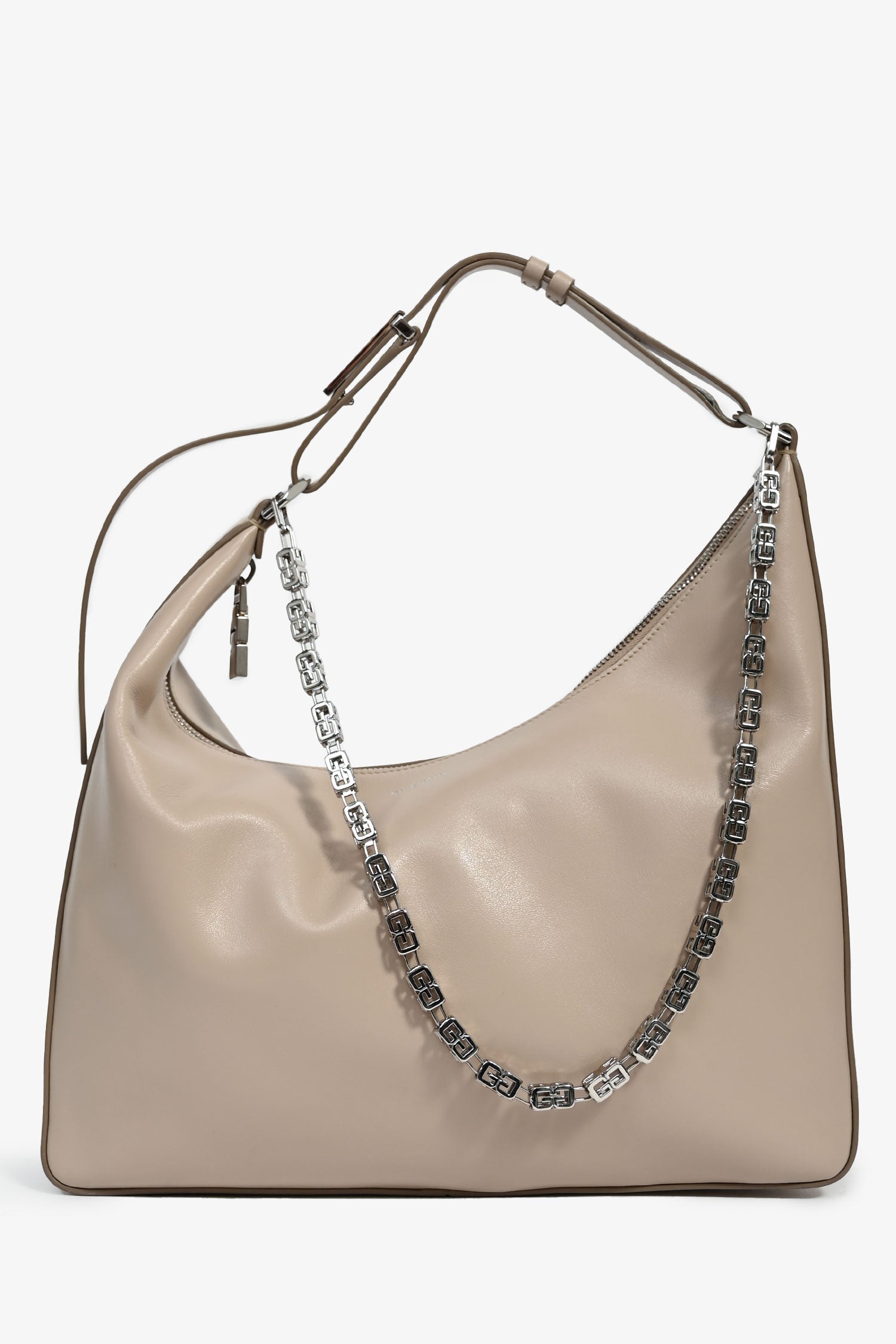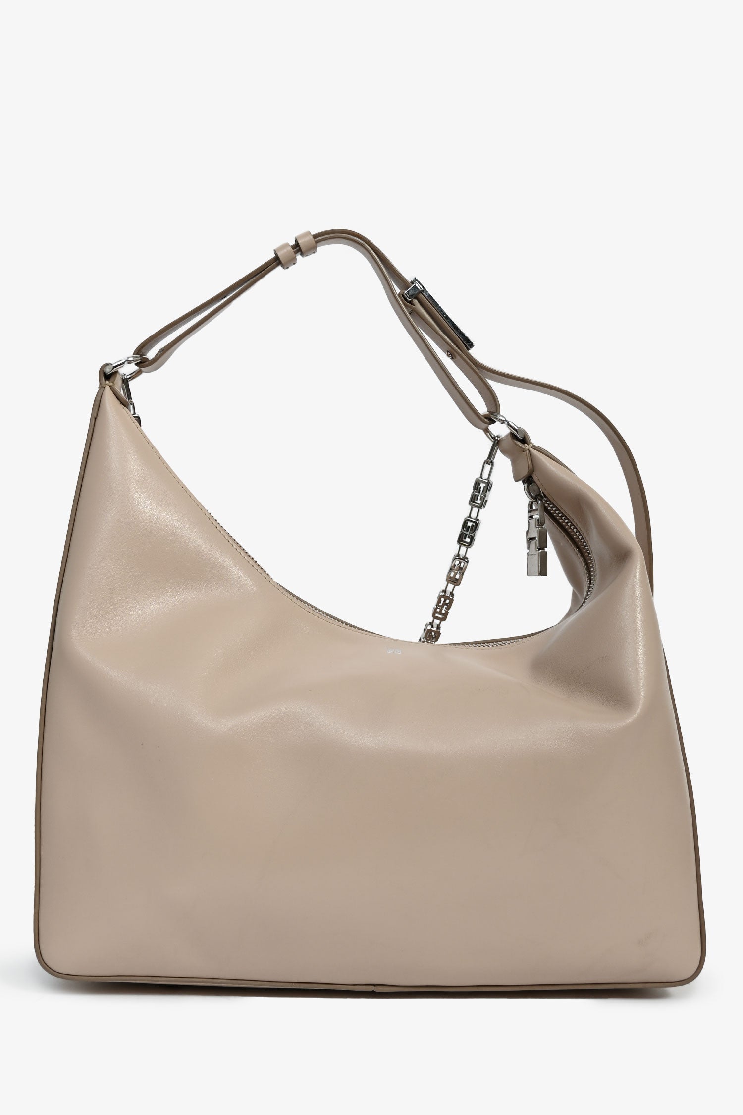 Refresh availabilityGivenchy Beige Medium Moon Cut-Out Leather Shoulder Bag with Chain. Top zipper closure. Single compartment with a wall slip pocket. Silver-tone hardware. Tonal stitching.