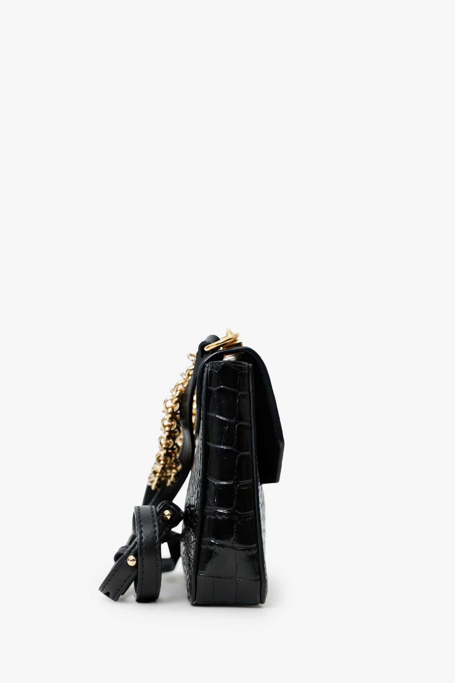 Refresh availabilityGivenchy Black Croc Embossed Crossbody. Front fold-over flap with turn-lock closure. Chain link top handle. Leather crossbody strap with adjustable pull-through push-pin closure. Lined interior with 3 pockets; 2 slip, and 1 rear card slot. Gold-tone hardware. Tonal stitching.