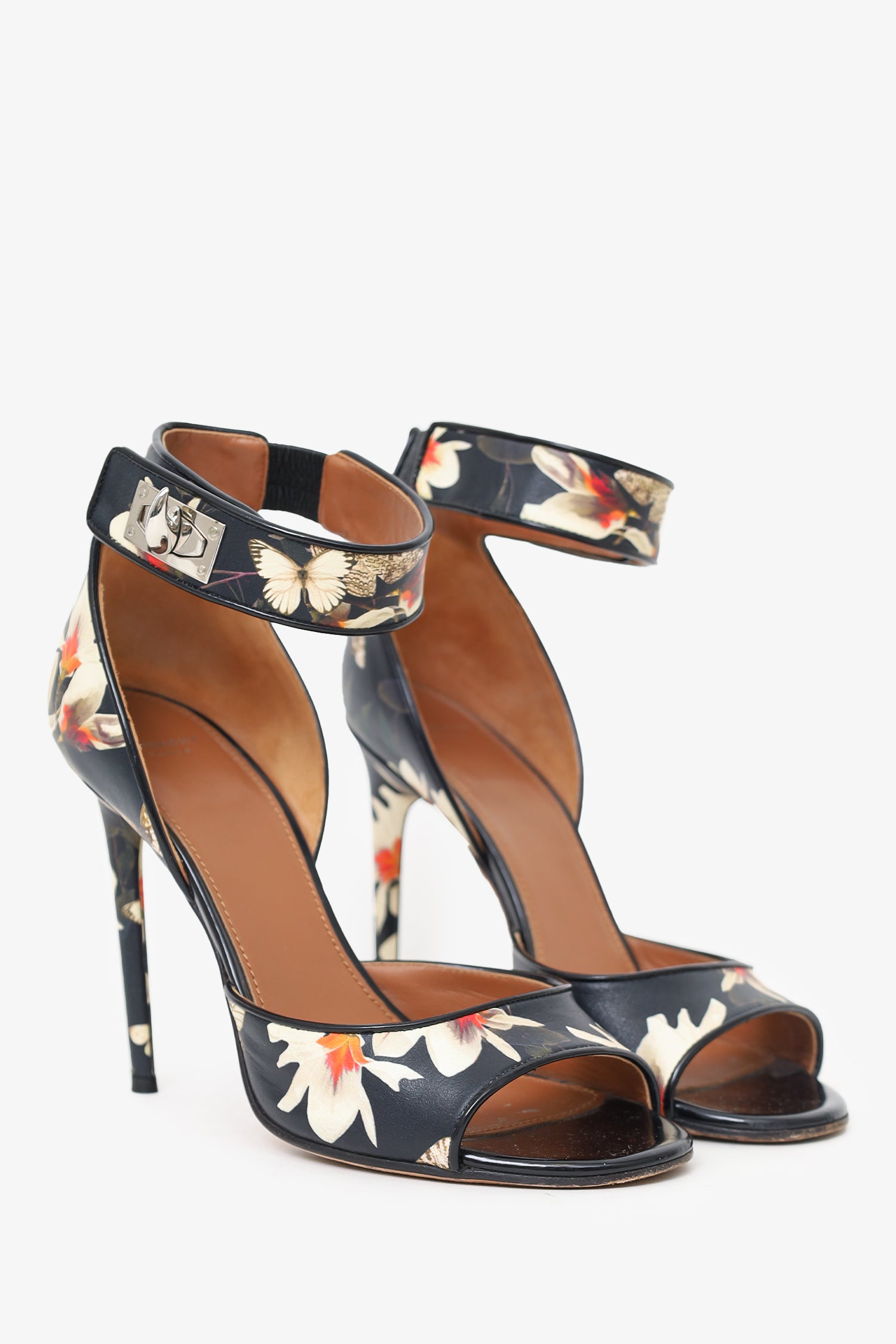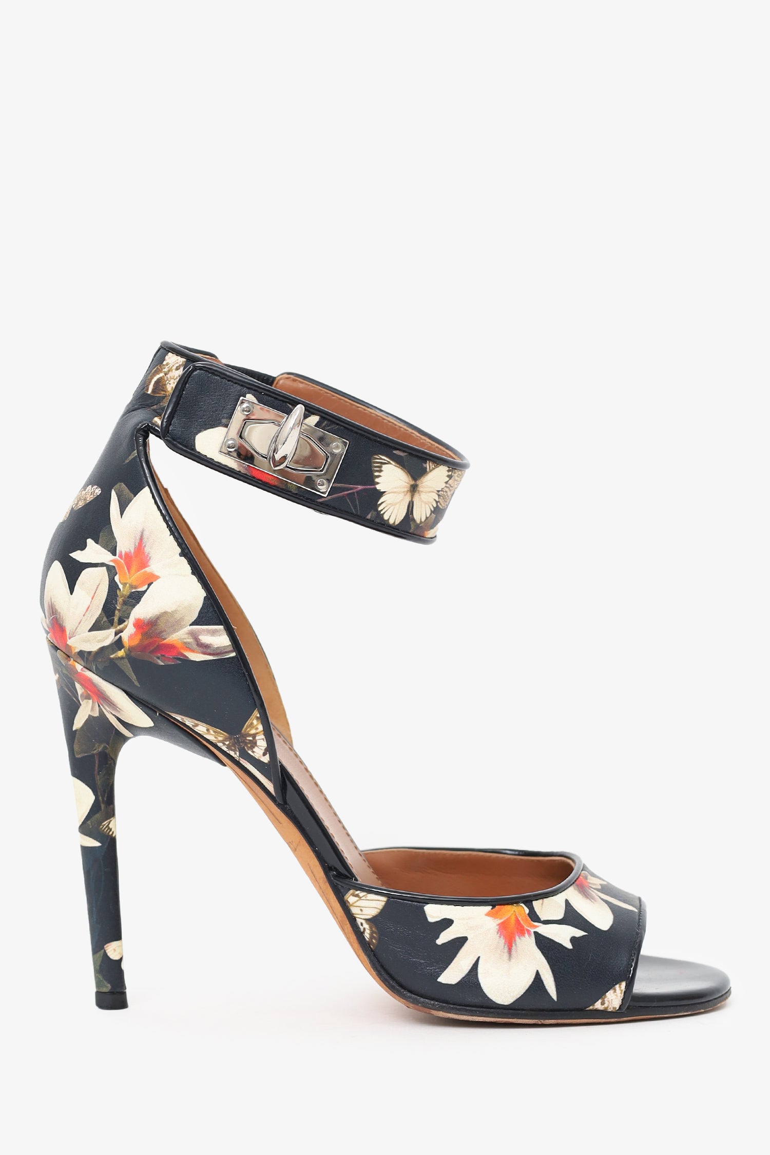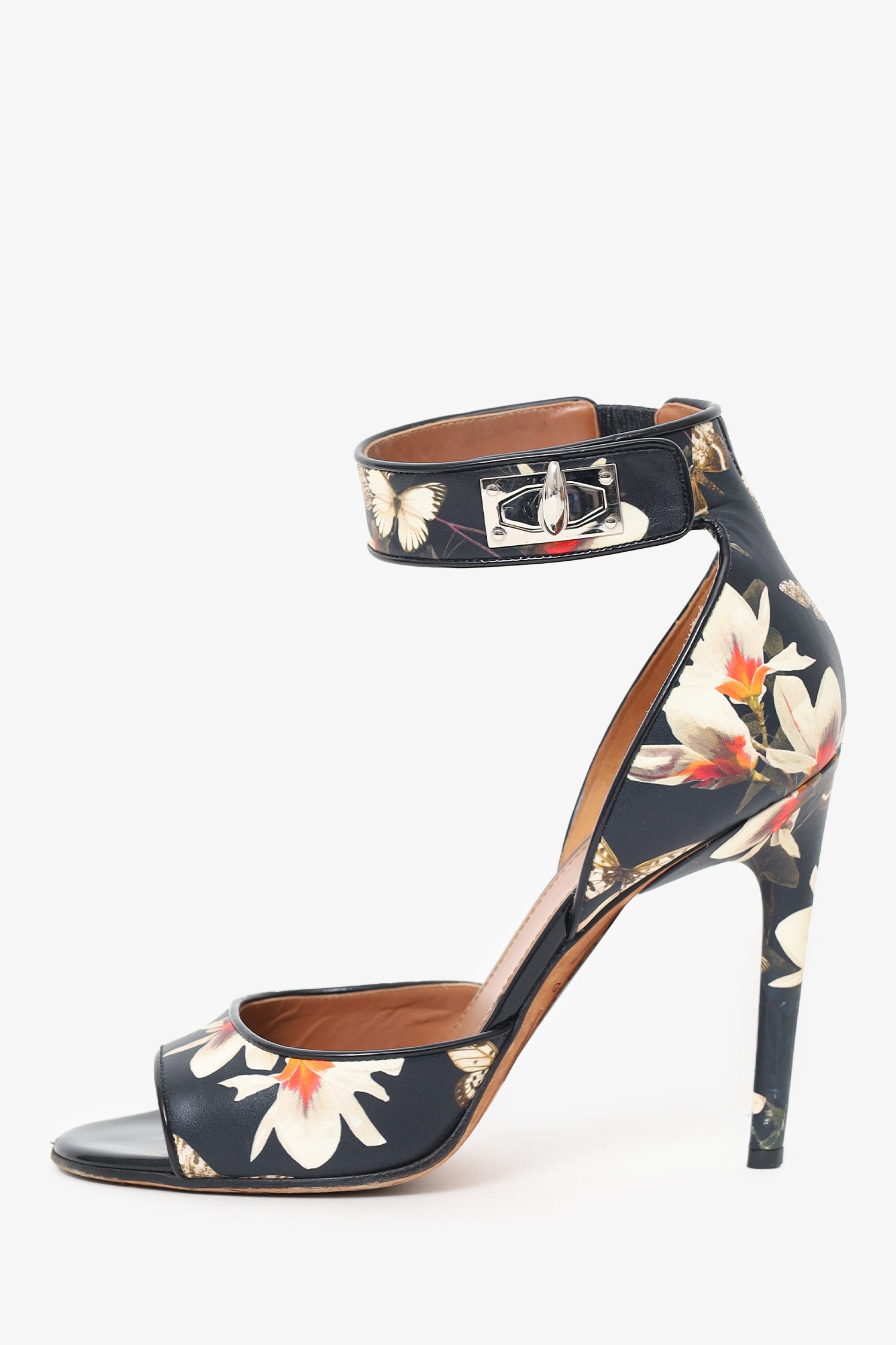 Refresh availabilityGivenchy Black Leather Floral Print Strappy Heels. Slip on with turn-lock ankle strap closure. Round open toe. Silver tone hardware. Tonal stitching.