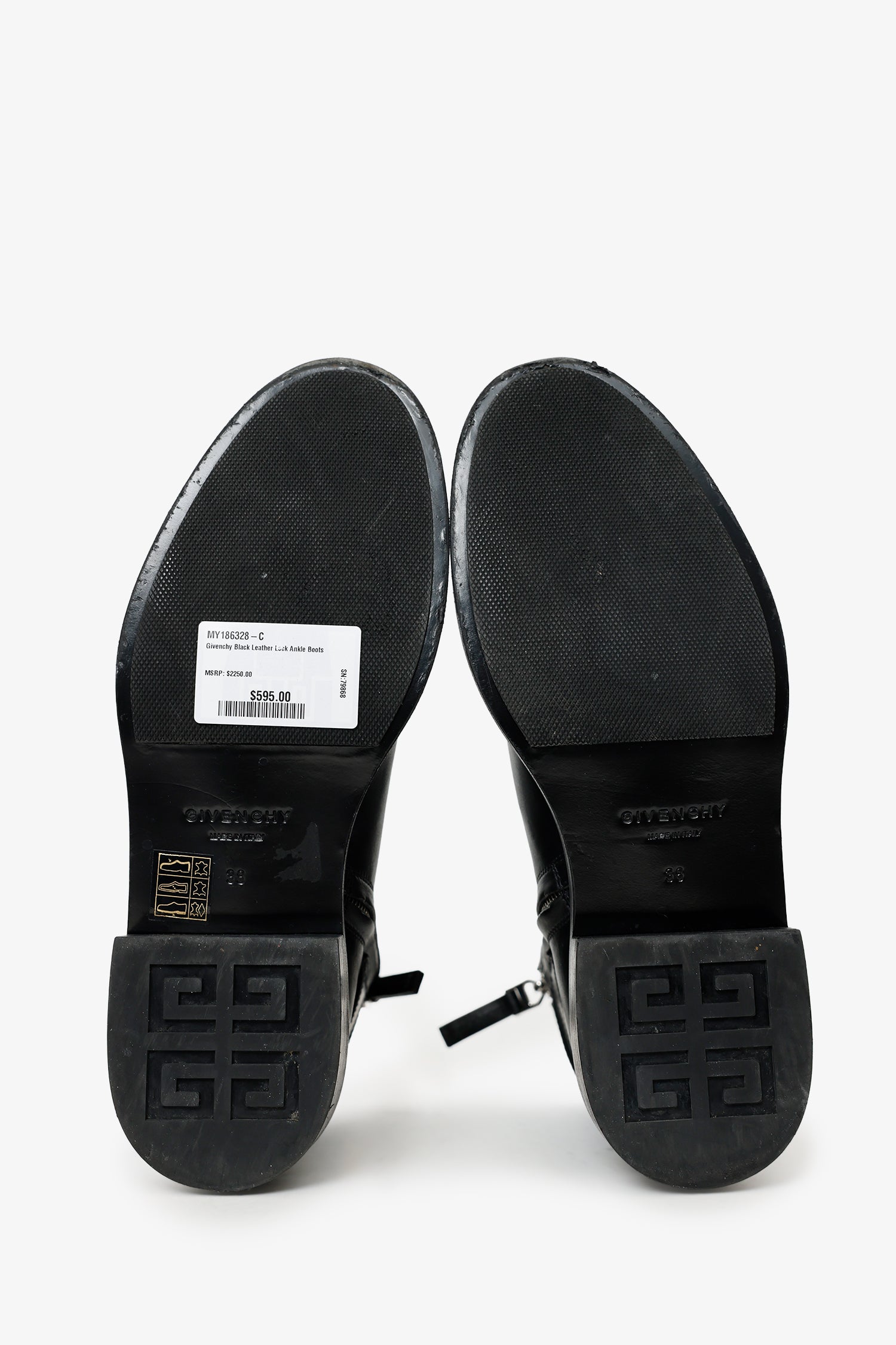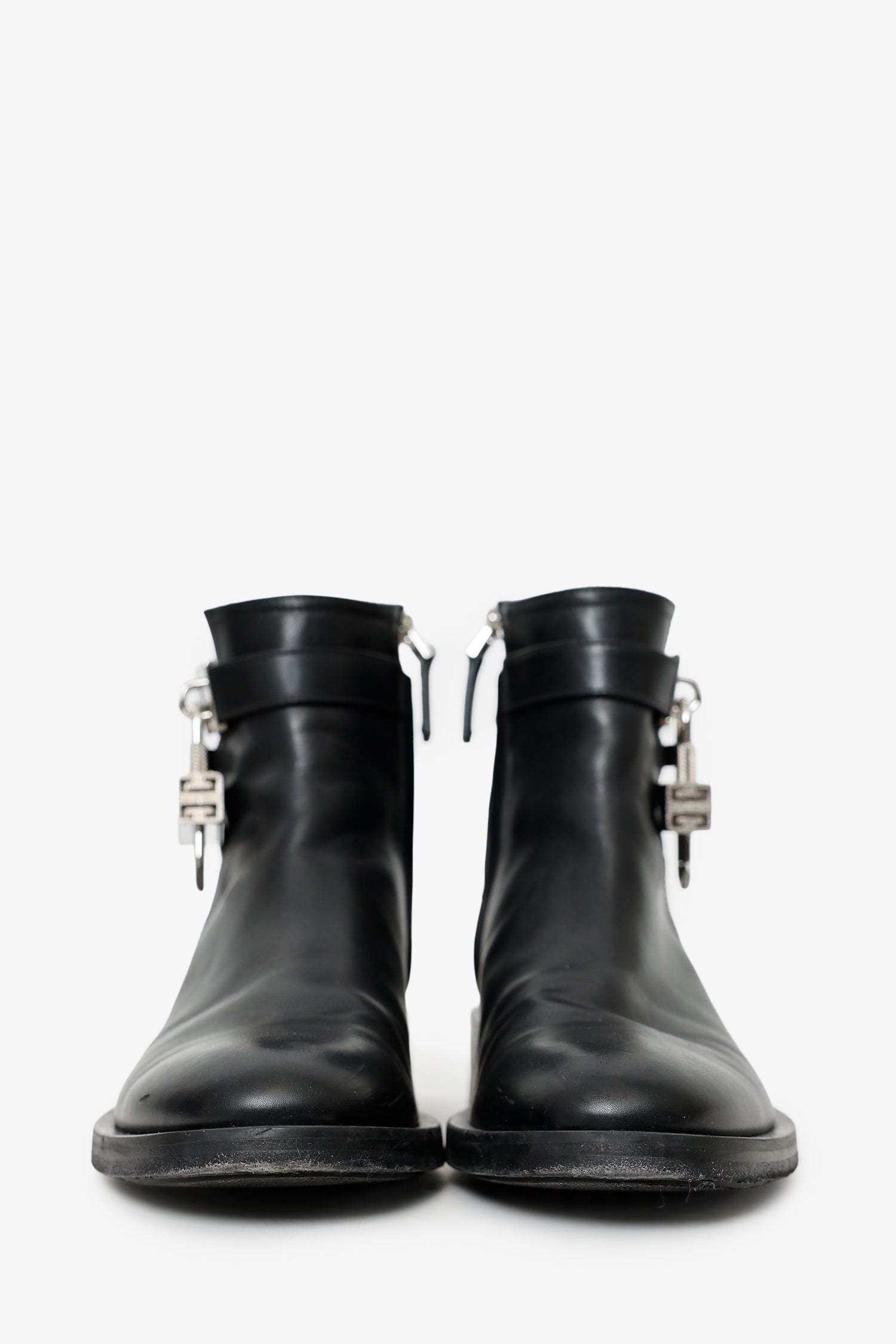 Refresh availabilityGivenchy Black Leather Lock Ankle Boots. Round toe. Side zip-up closure. Rear pull tab. Block heel. Leather-lined interior. Silver-tone hardware. Tonal stitching.