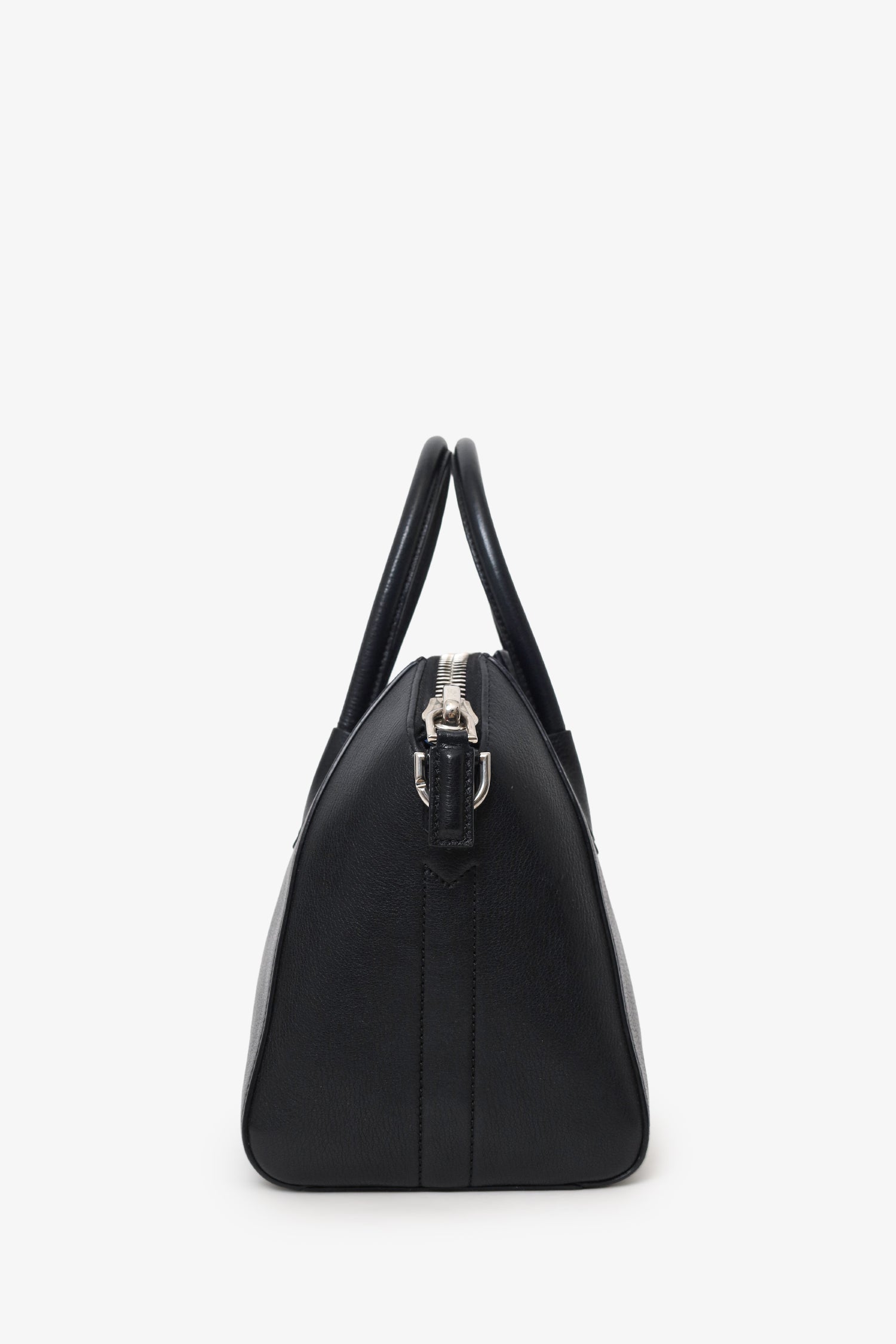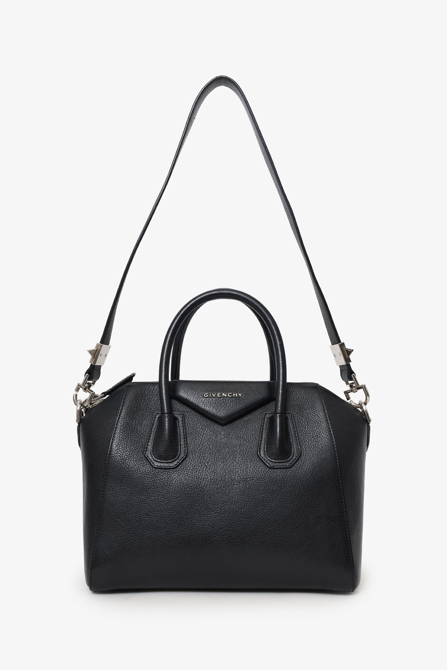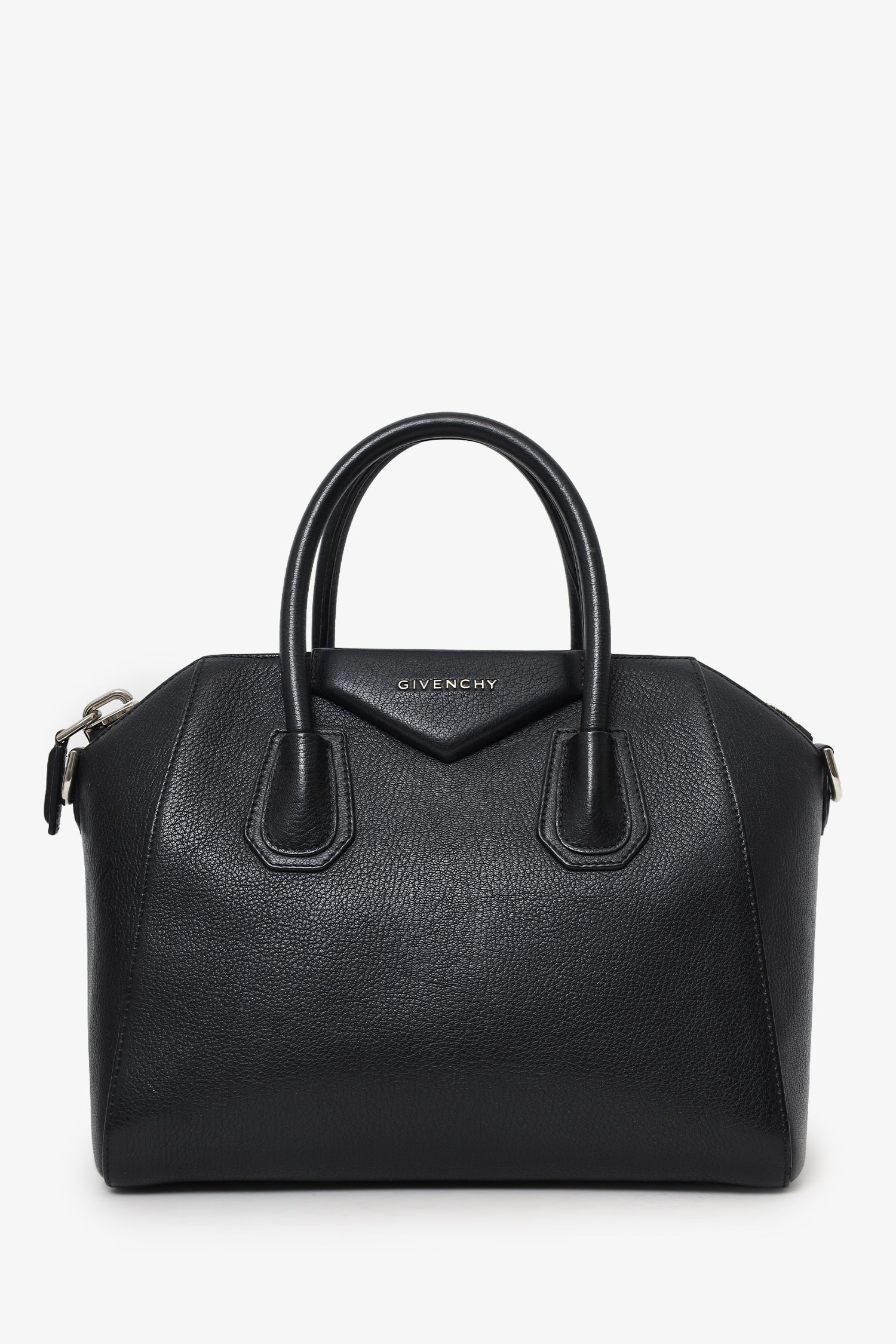 Refresh availabilityGivenchy Black Leather Small Antigona Bag with Strap. Top zip closure. Twin top leather handles. Removable leather shoulder strap. Canvas-lined interior. Single interior zip pocket. Silver-tone hardware. Tonal stitching.