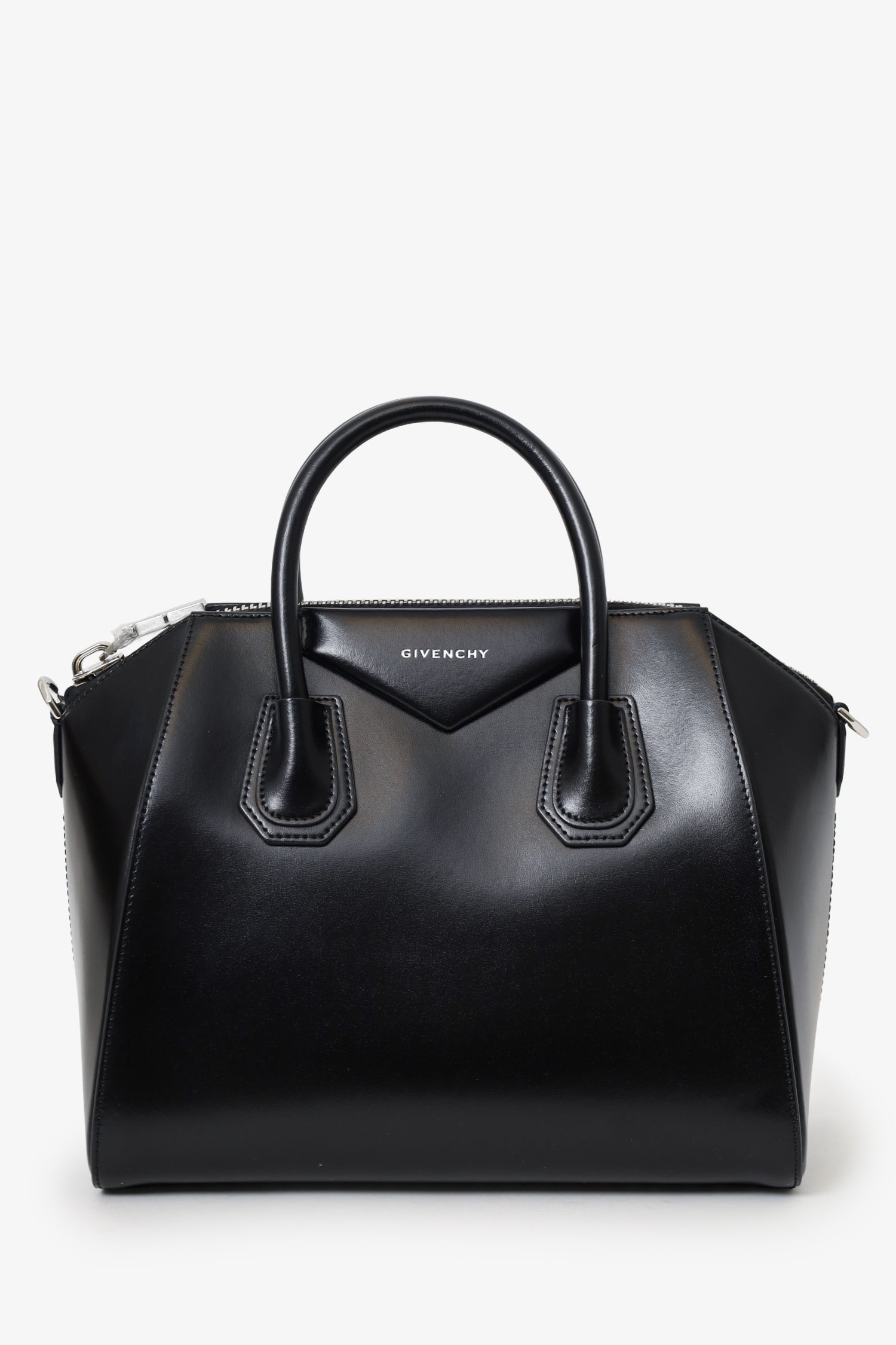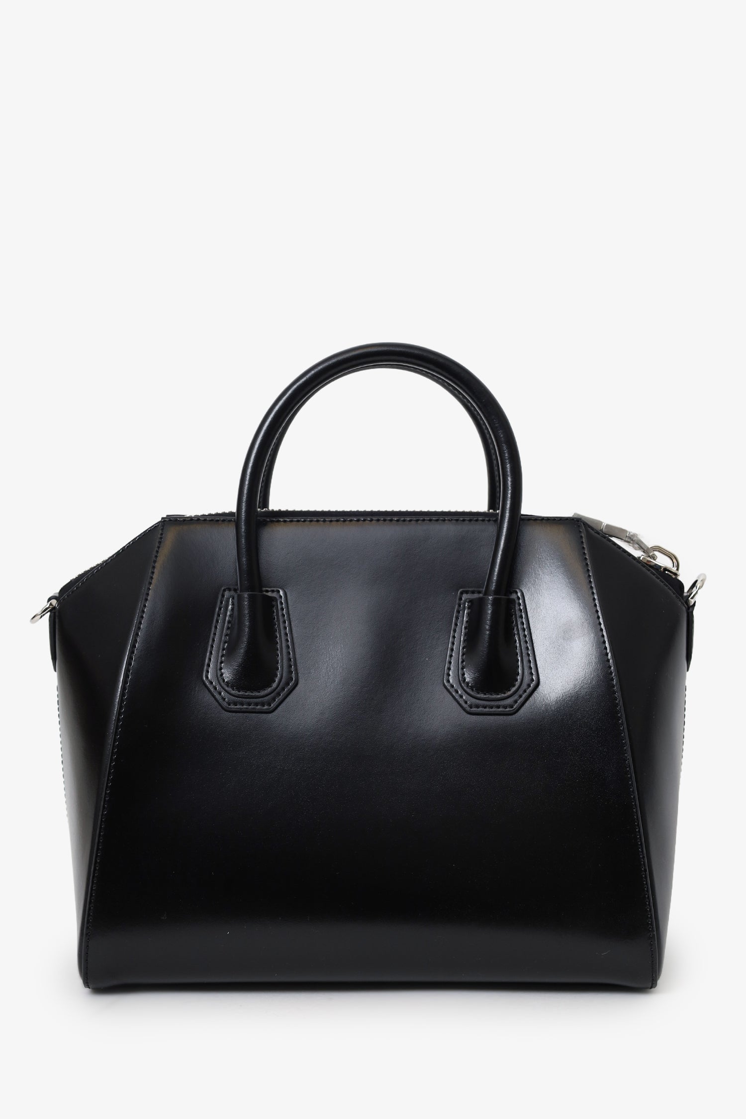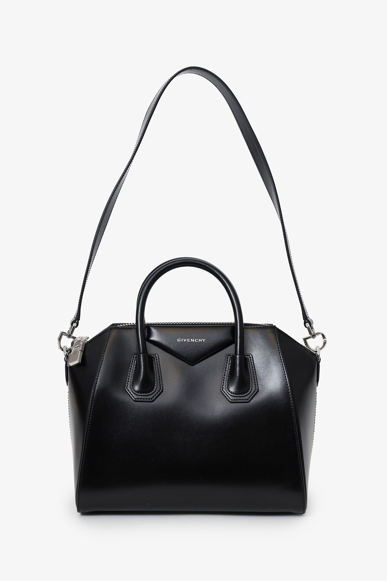 Refresh availabilityGivenchy Black Leather Small Antigona Top Handle With Strap. Top zip closure. Twin top handle. Removable shoulder strap. 2 interior pockets; 1 zip and 1 slip. Silver-tone hardware. Tonal stitching.