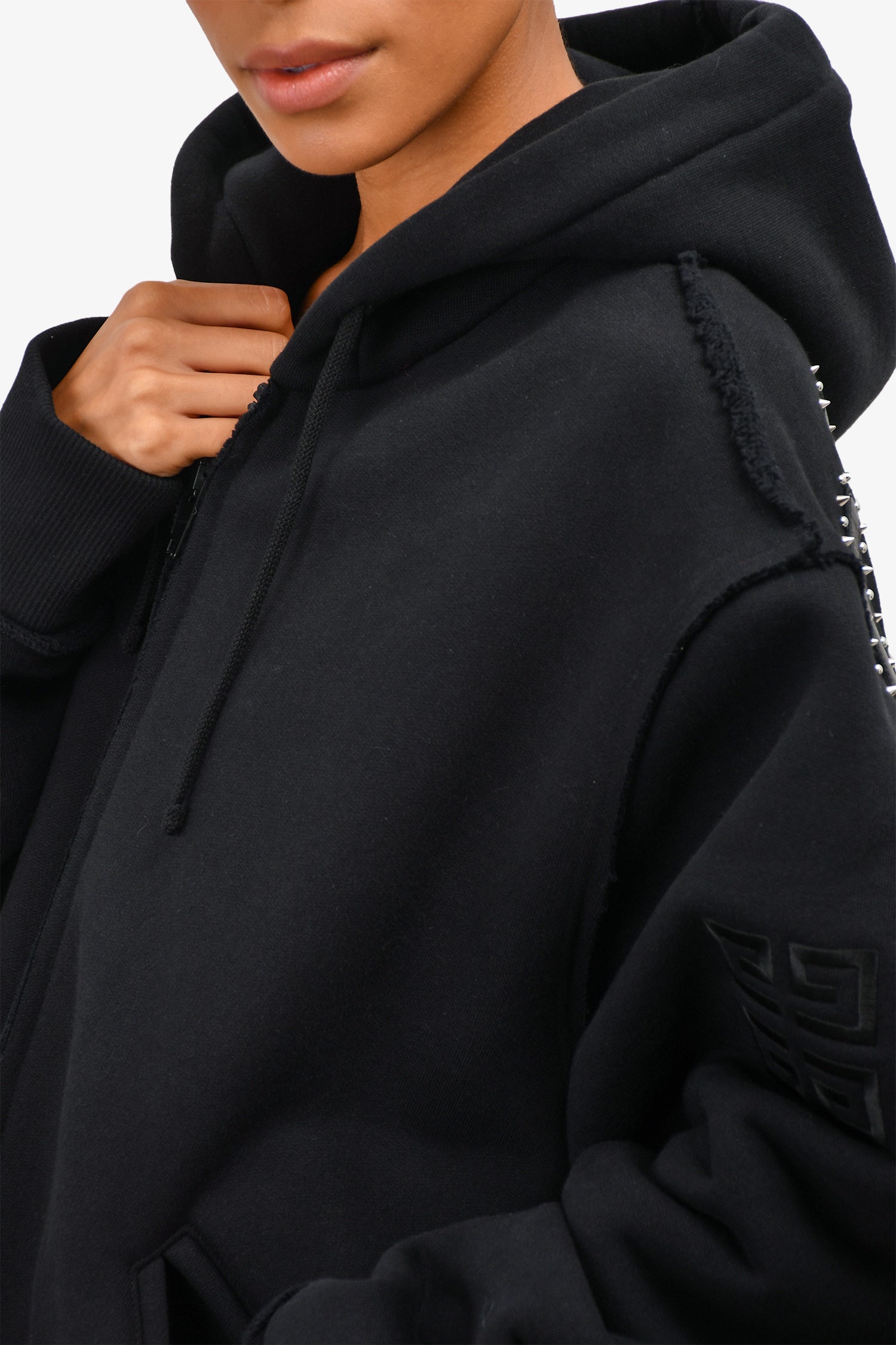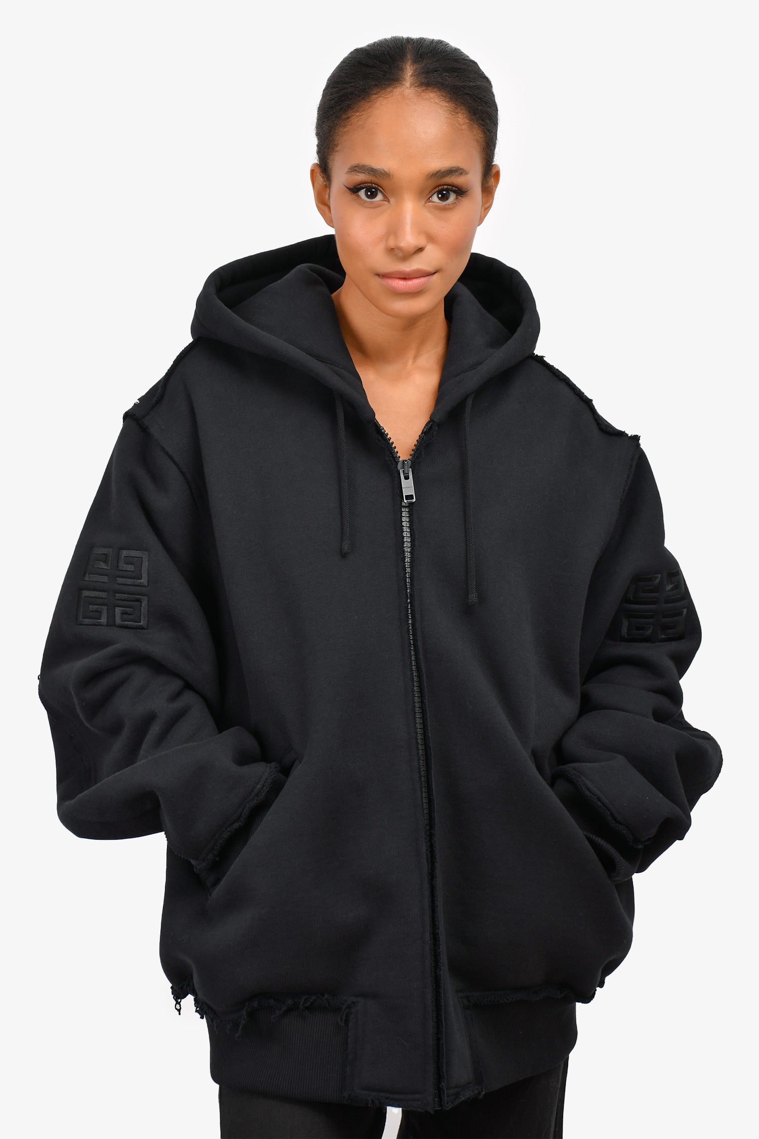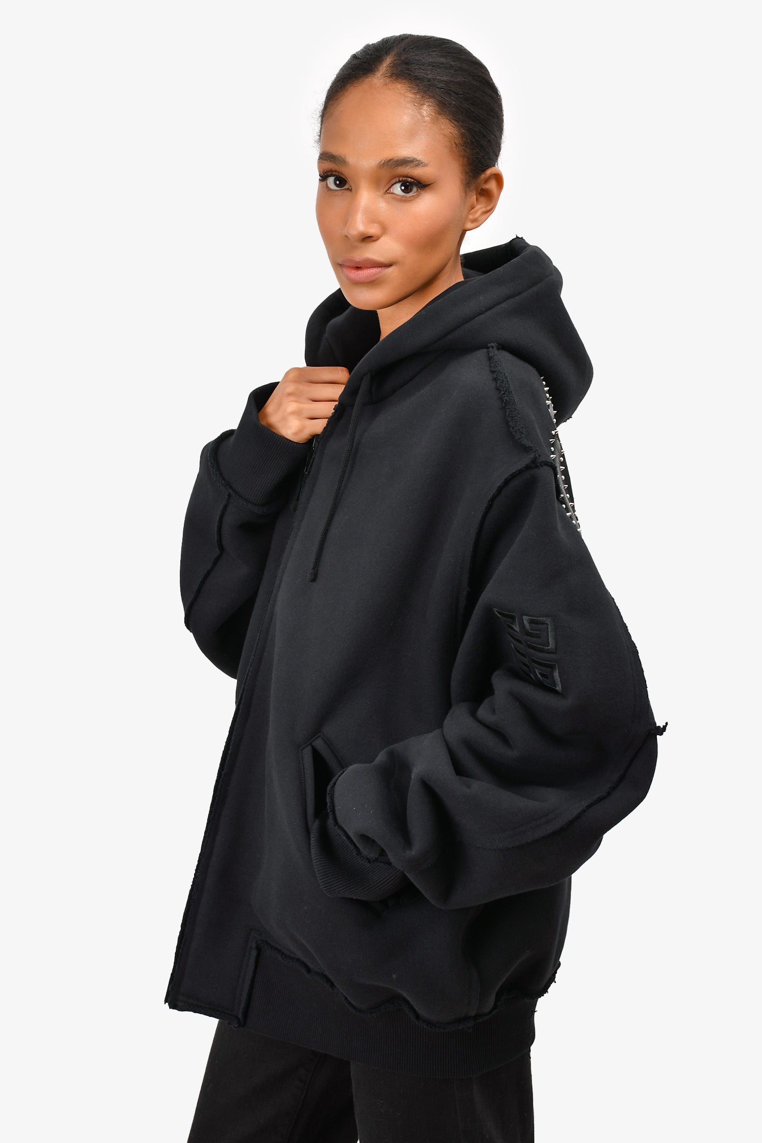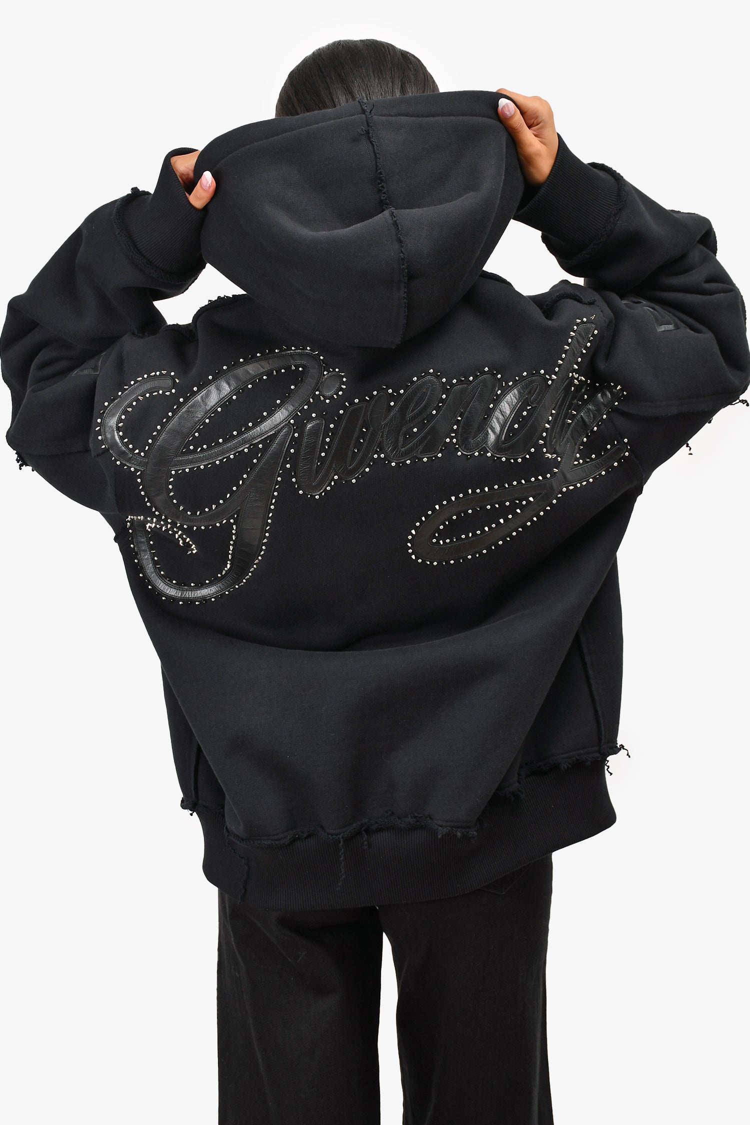 Refresh availabilityGivenchy Black Zip-Up Heavyweight Hoodie with Silver Studded Logo. Front zipped closure. Intentional distressing.