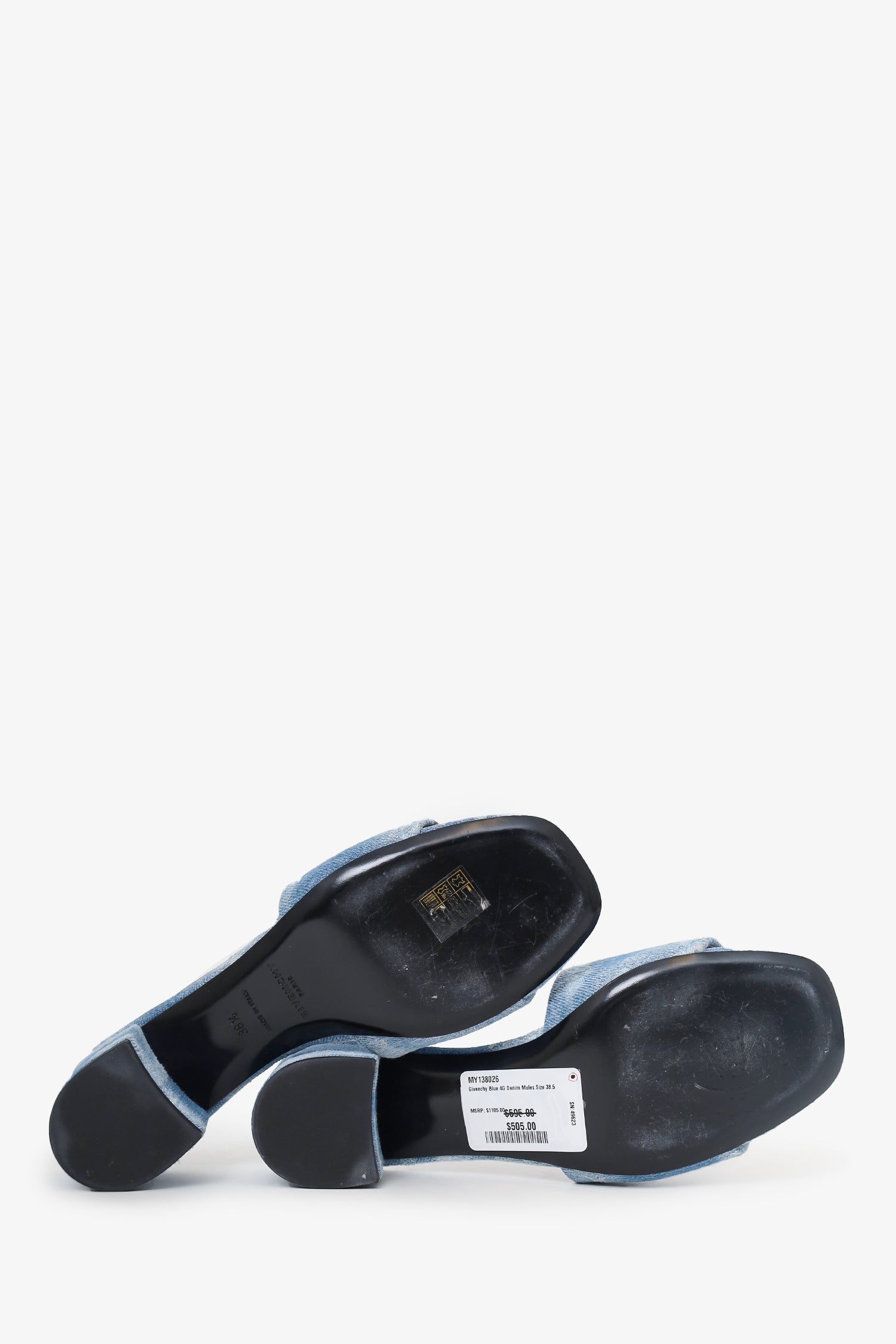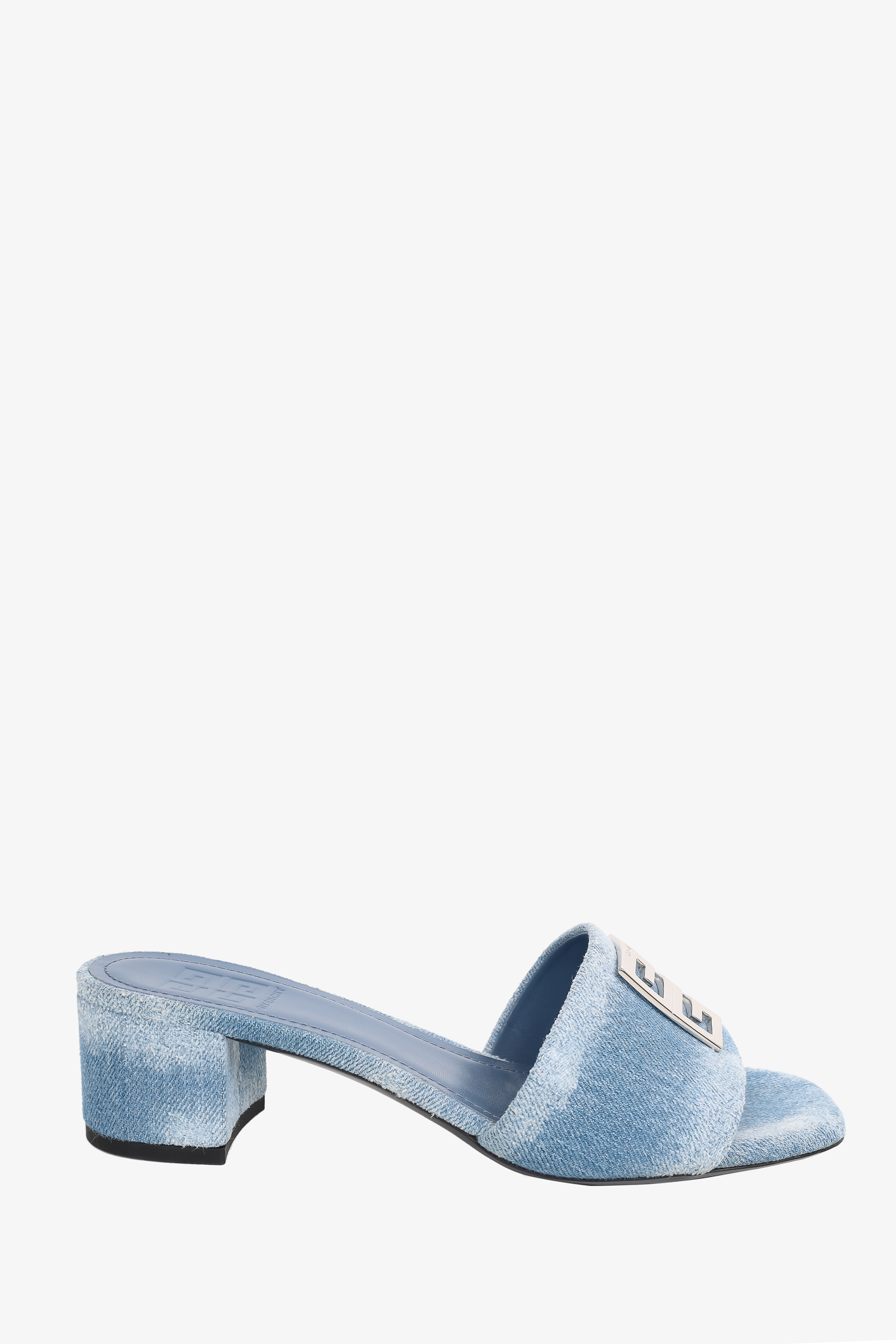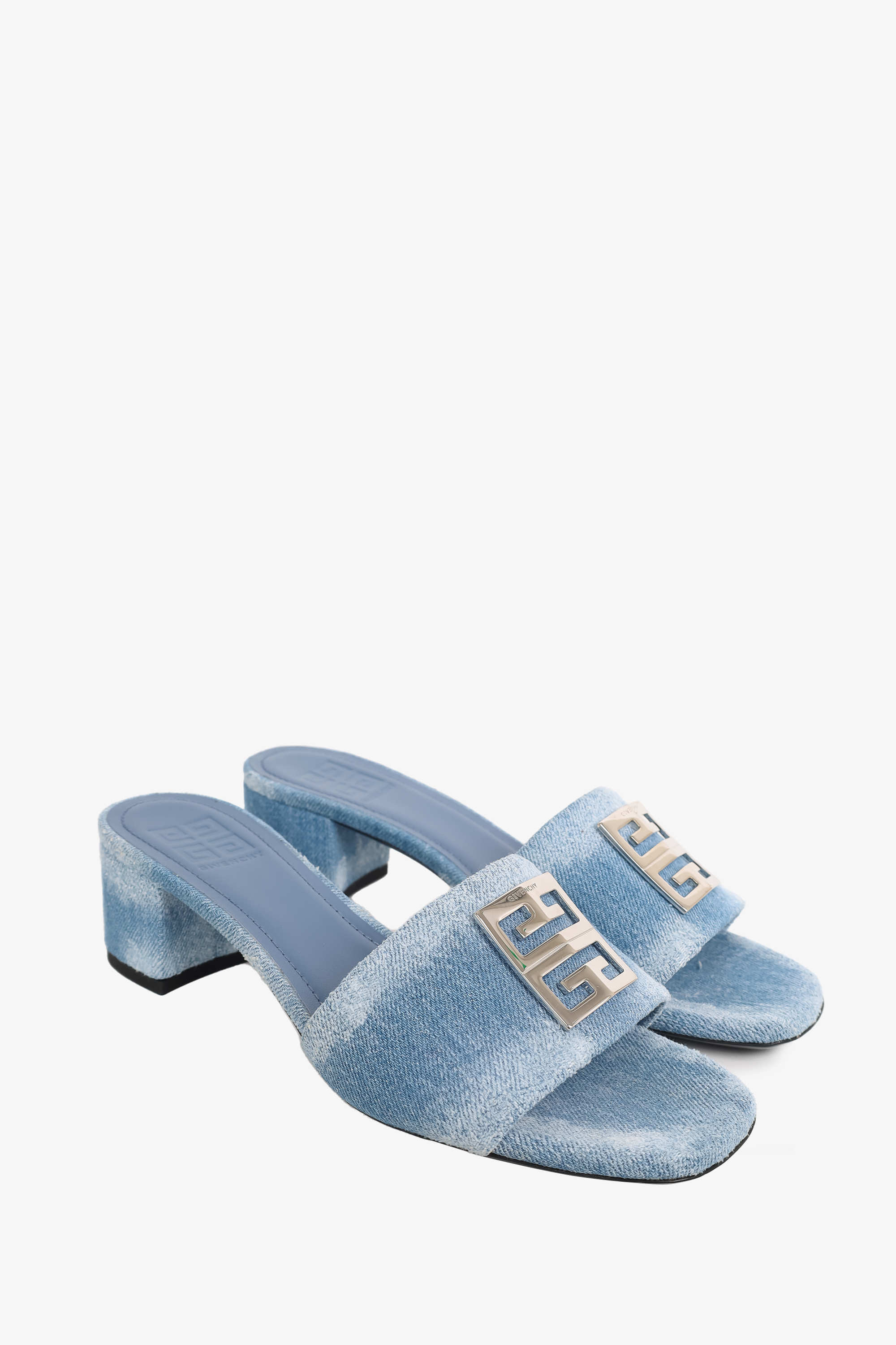 Refresh availabilityGivenchy Blue 4G Denim Mules. Slip-on. Open-square toe. Distressed denim style. Silver-tone hardware logo. Tonal stitching.