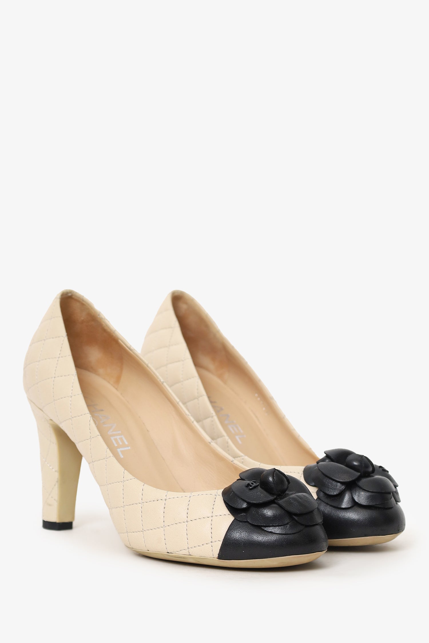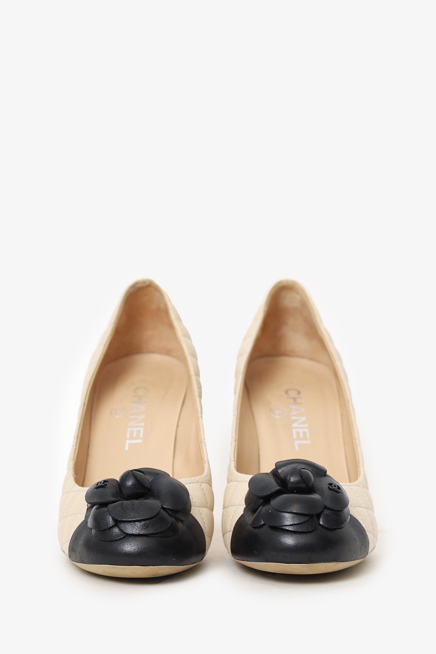 Refresh availabilityPre-Loved Chanel™ Beige/Black Leather Camellia CC Cap Toe Pumps. Slip-on. Round-toe. Floral decor at toe. Tonal stitching.