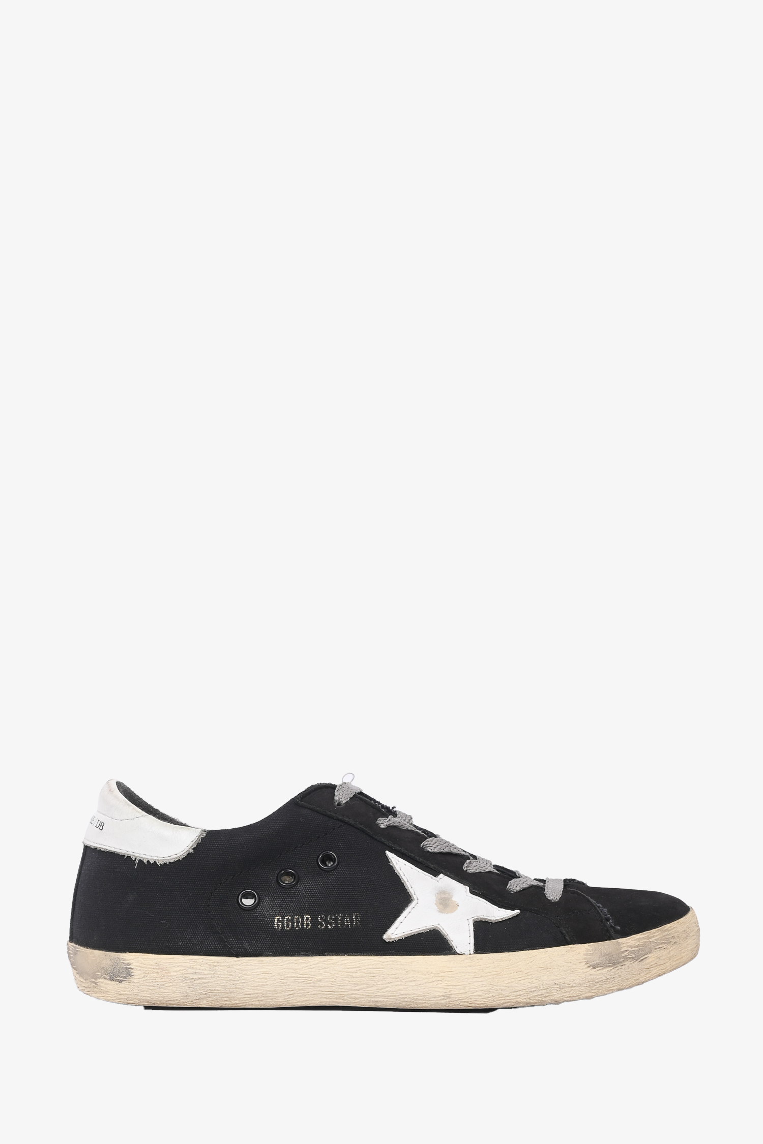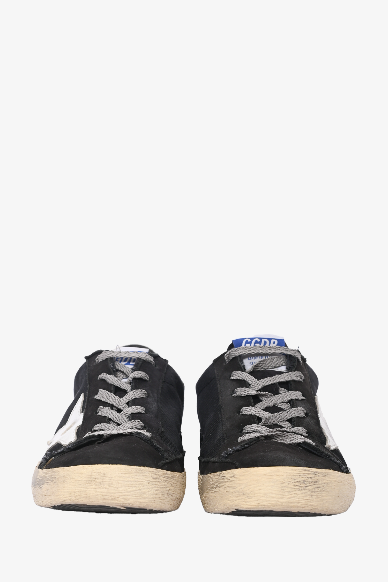 Refresh availabilityGolden Goose Black Suede Printed Superstar Sneakers. Round toe. Lace-up closure. Star detail on the outer. Tonal stitching.