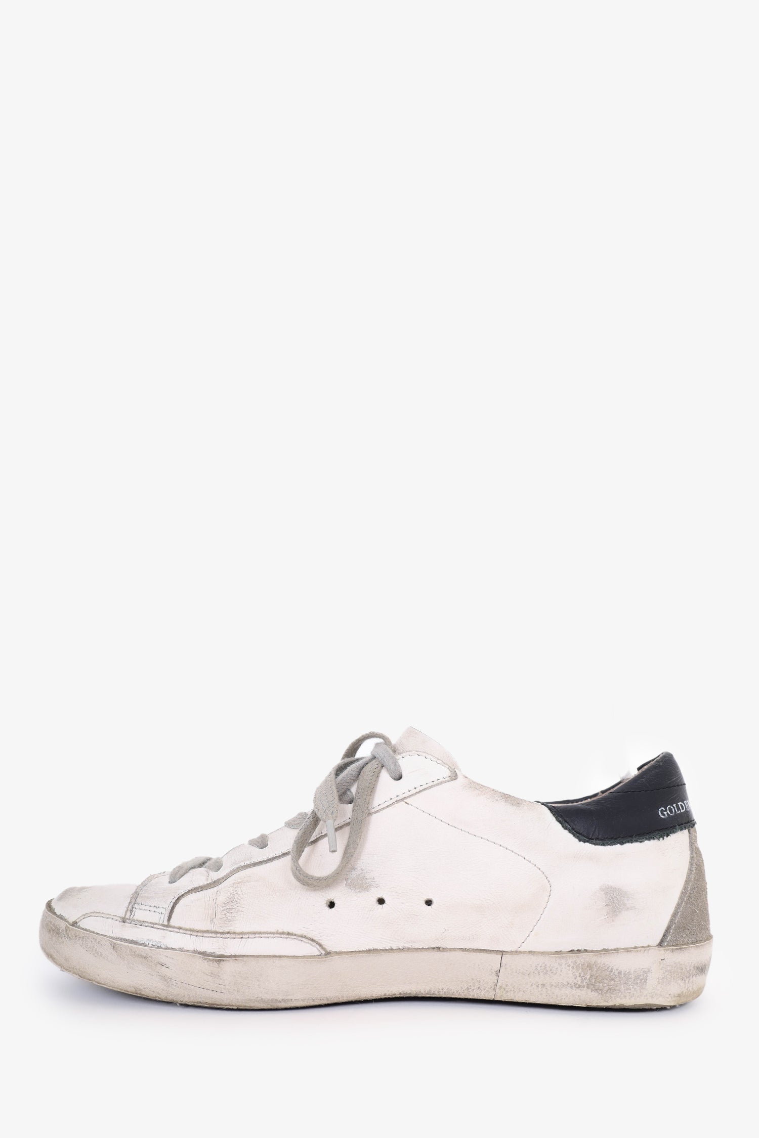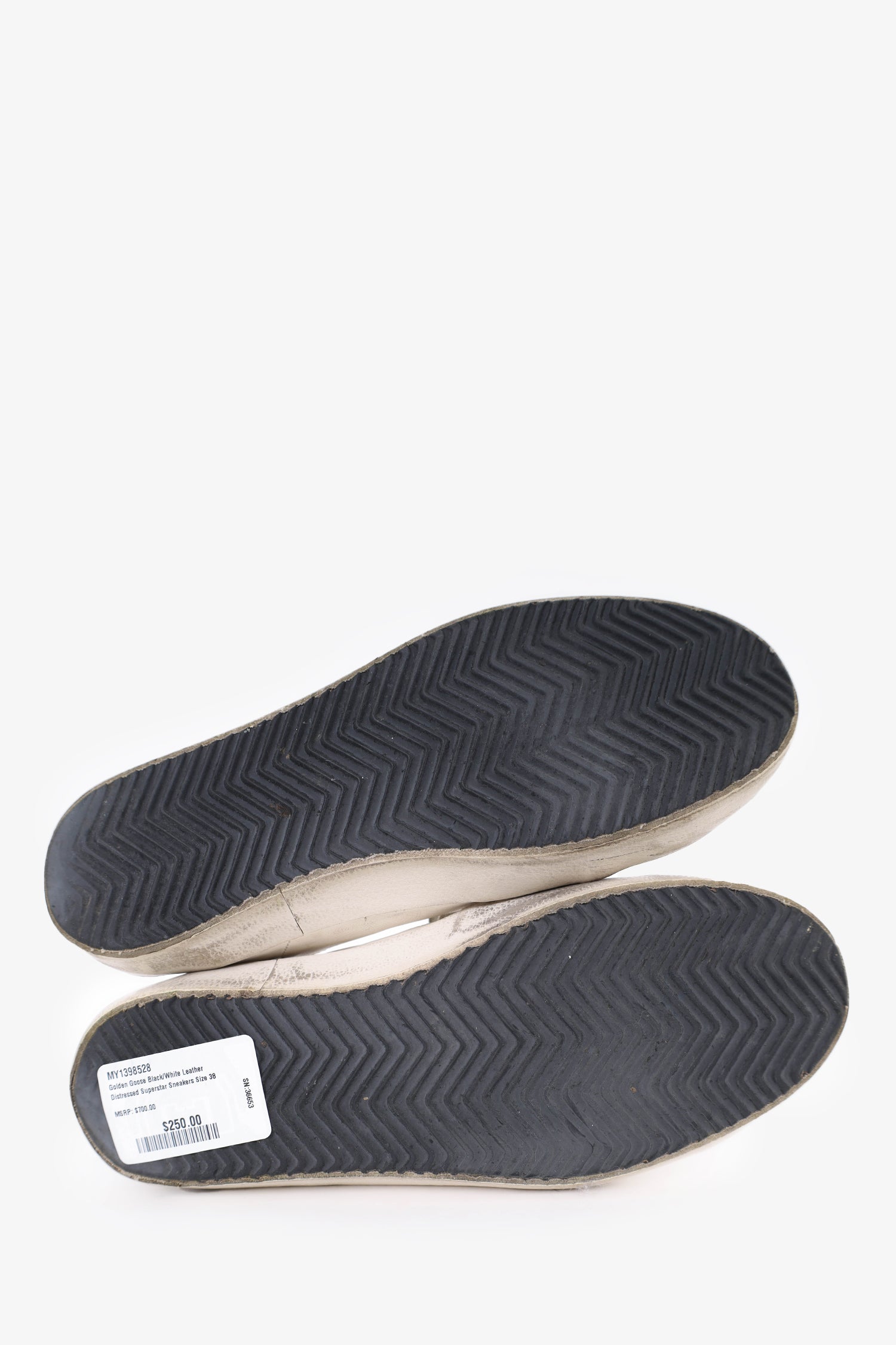 Refresh availabilityGolden Goose Black/White Leather Distressed Superstar Sneakers. Slip-on. Front lace-up closure. Round toe. Intentional wear and distressing throughout. Tonal stitching.