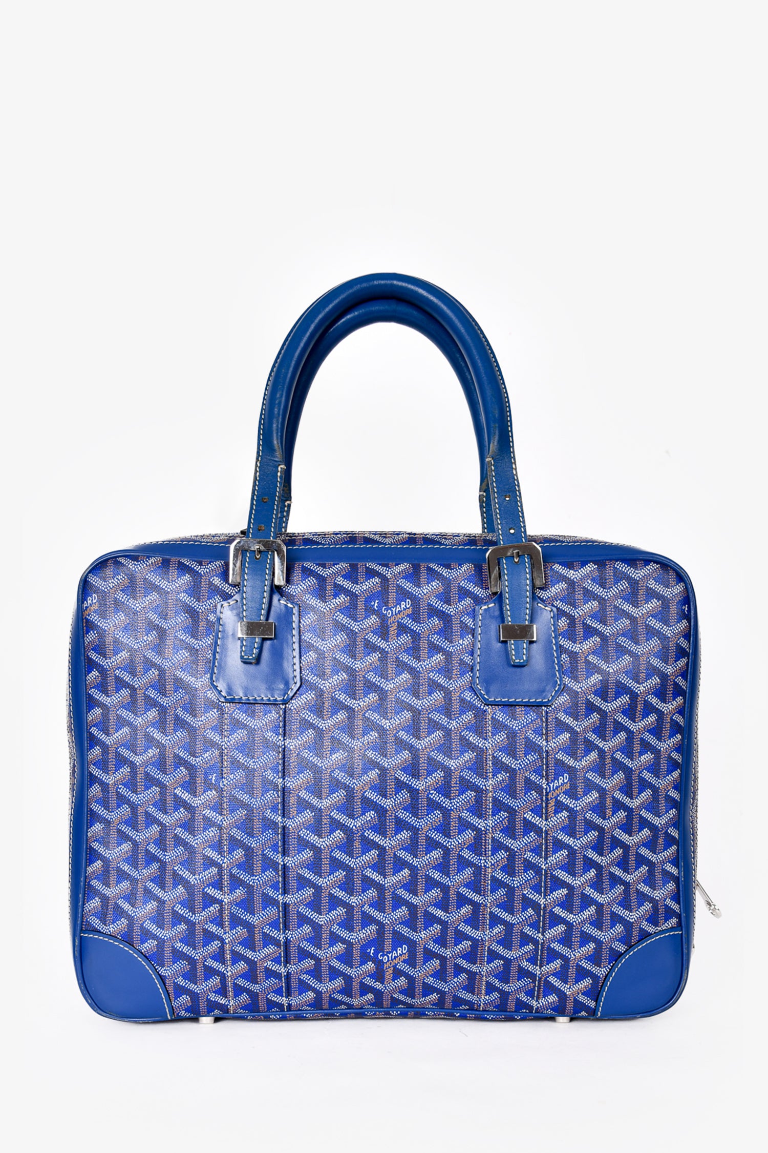 Goyard Vintage Blue Ambassade PM Briefcase With Snowflakes. Top zip closure. 1 interior slip pocket with push tab closure. 1 interior zip pocket. Silver-toned hardware. Contrast stitching.