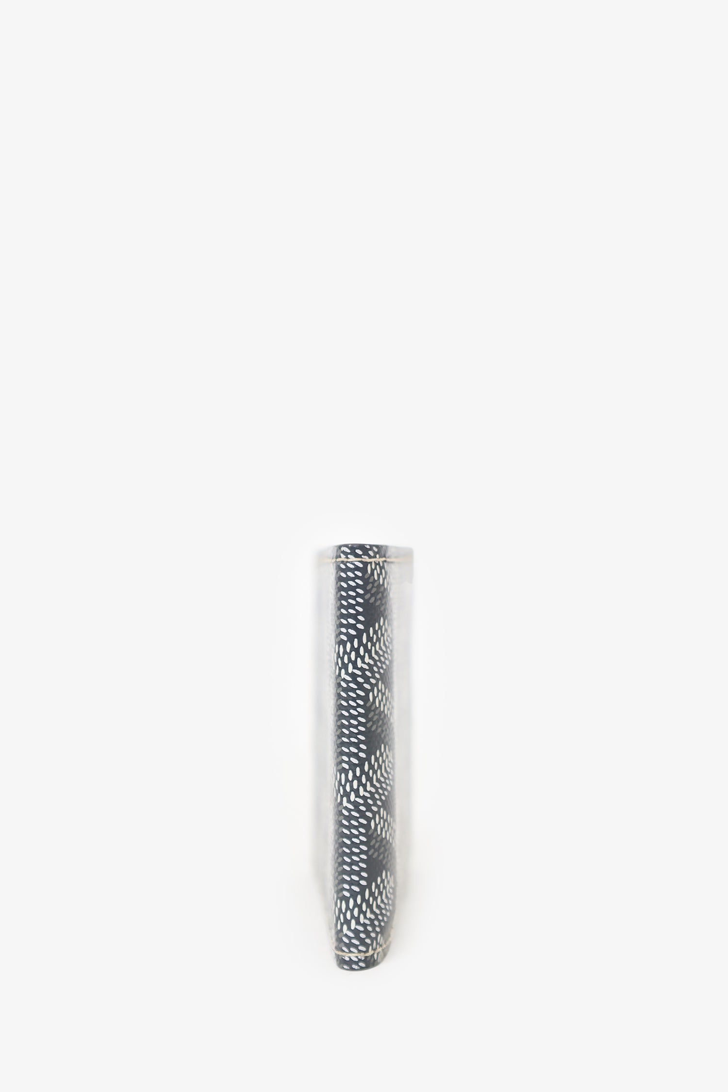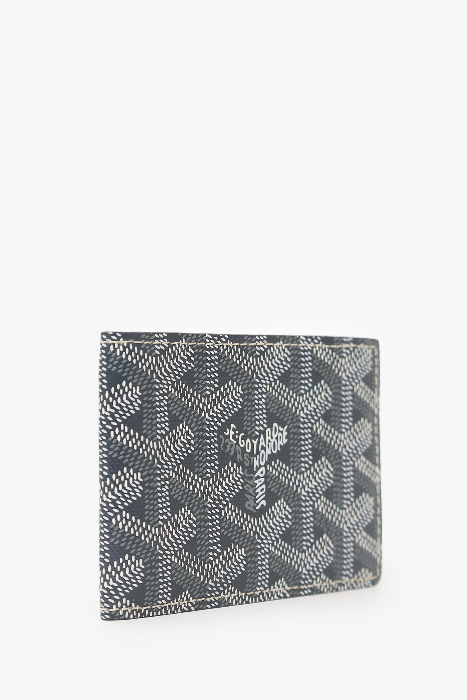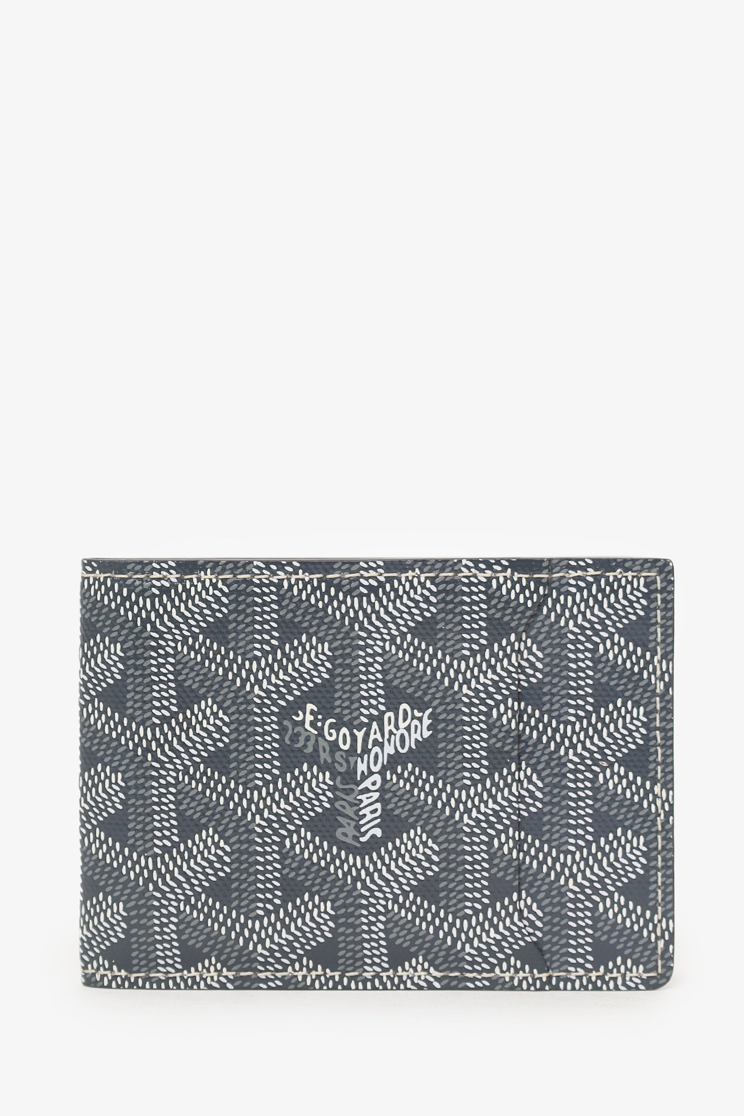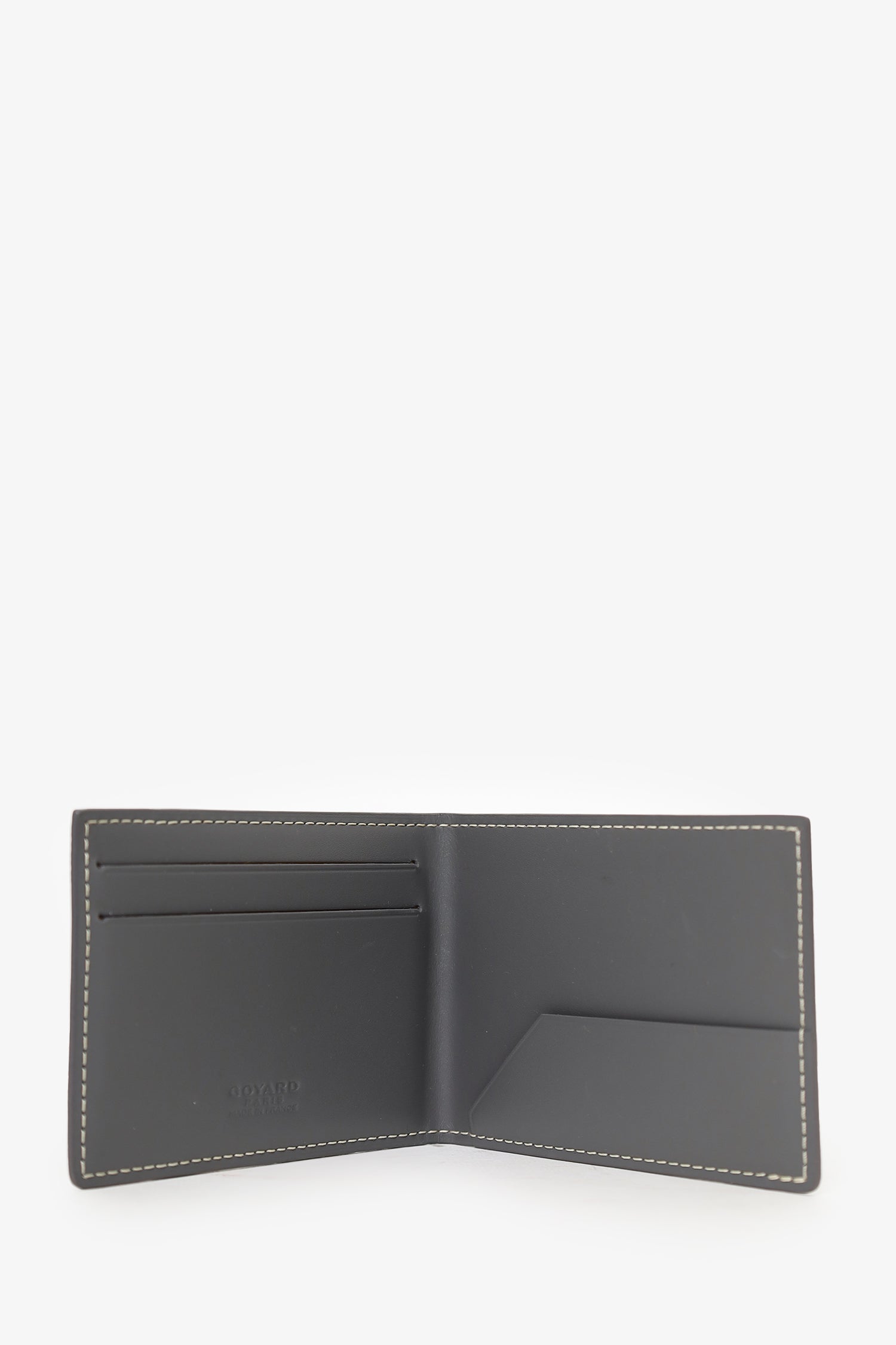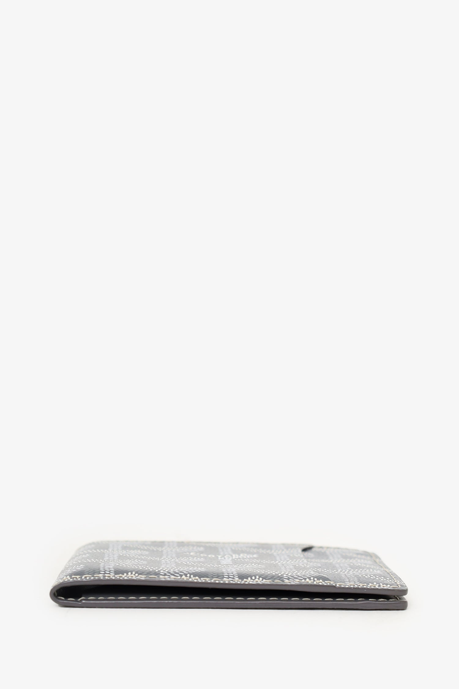 Refresh availabilityGoyard Grey Goyardine Victoire Companion Card Holder Bifold Wallet. 1 exterior slip pocket. 3 card slots inside bifold. Contrast stitching.