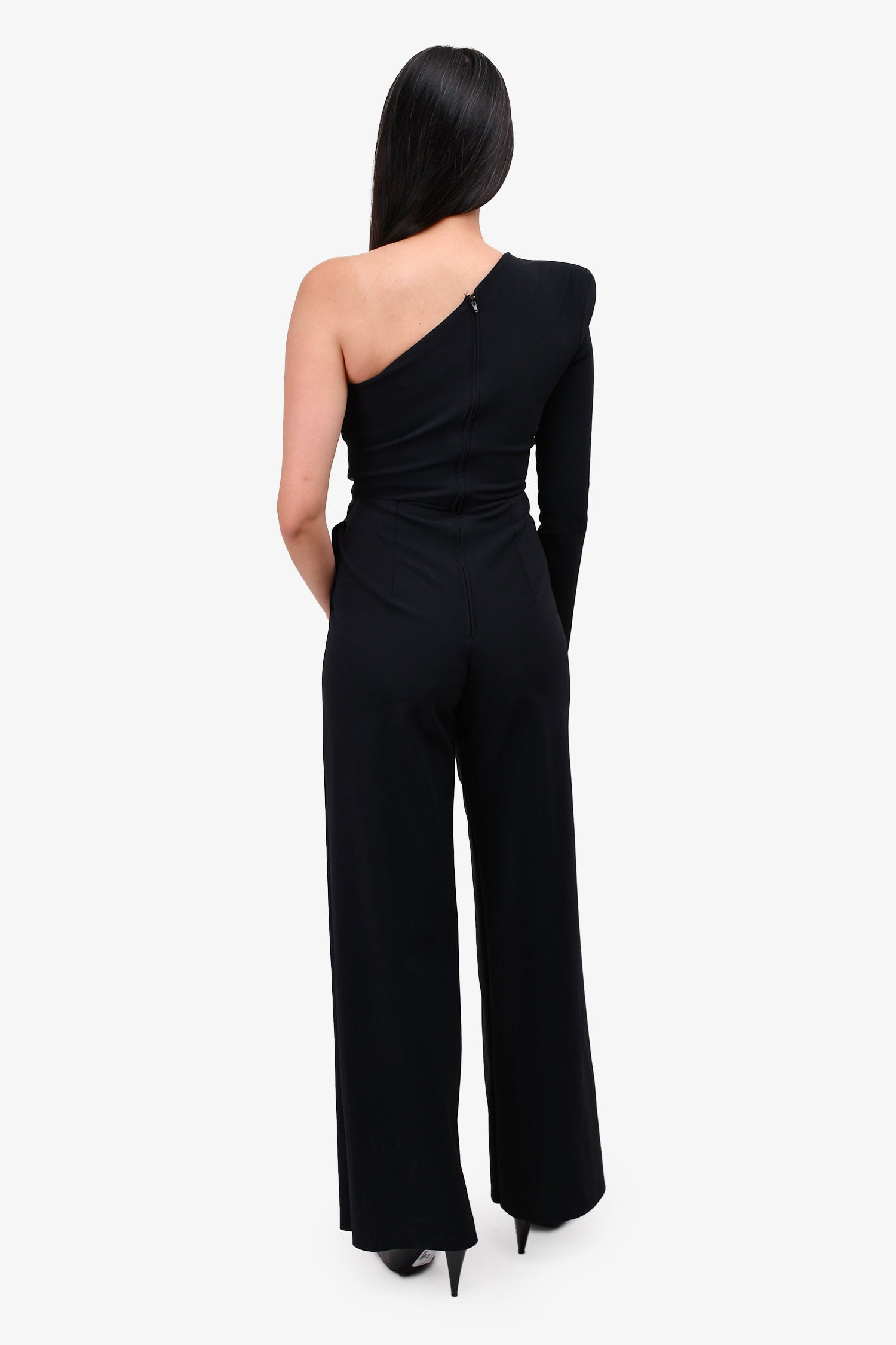 Refresh availabilityGreta Constantine Black/White Asymmetrical Pant Jumpsuit. Padded Shoulder. Back zip closure. One shoulder Sleeve. Rubber band around the bust. Tonal stitching.
