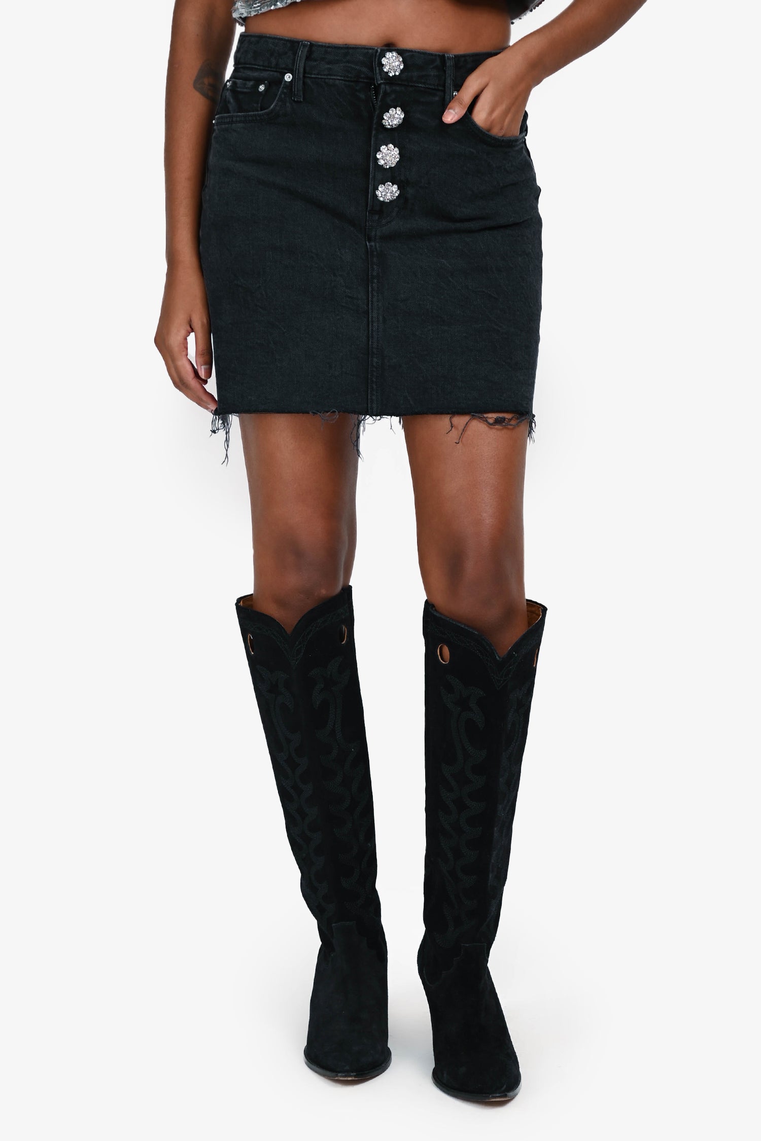 Refresh availabilityGRLFRND Black Denim Embellished Button 'Reese' Mini Skirt. Fly zipper closure with a hook. Waistband belt loops. Classic five-pocket style. Fringe hemline. Silver-tone hardware. Tonal stitching.