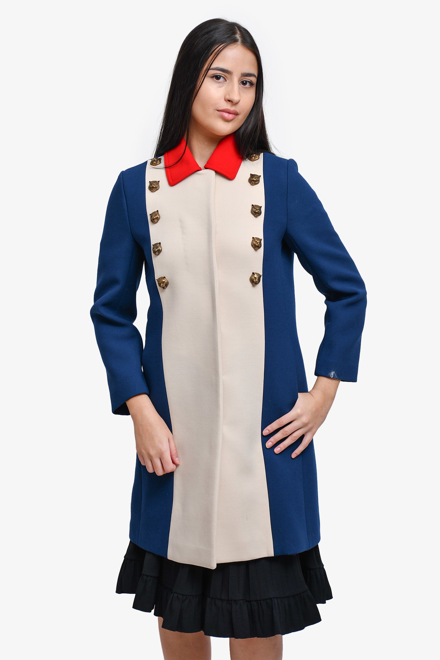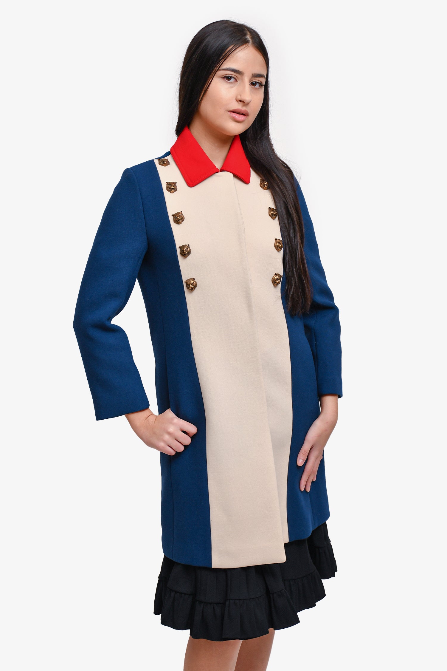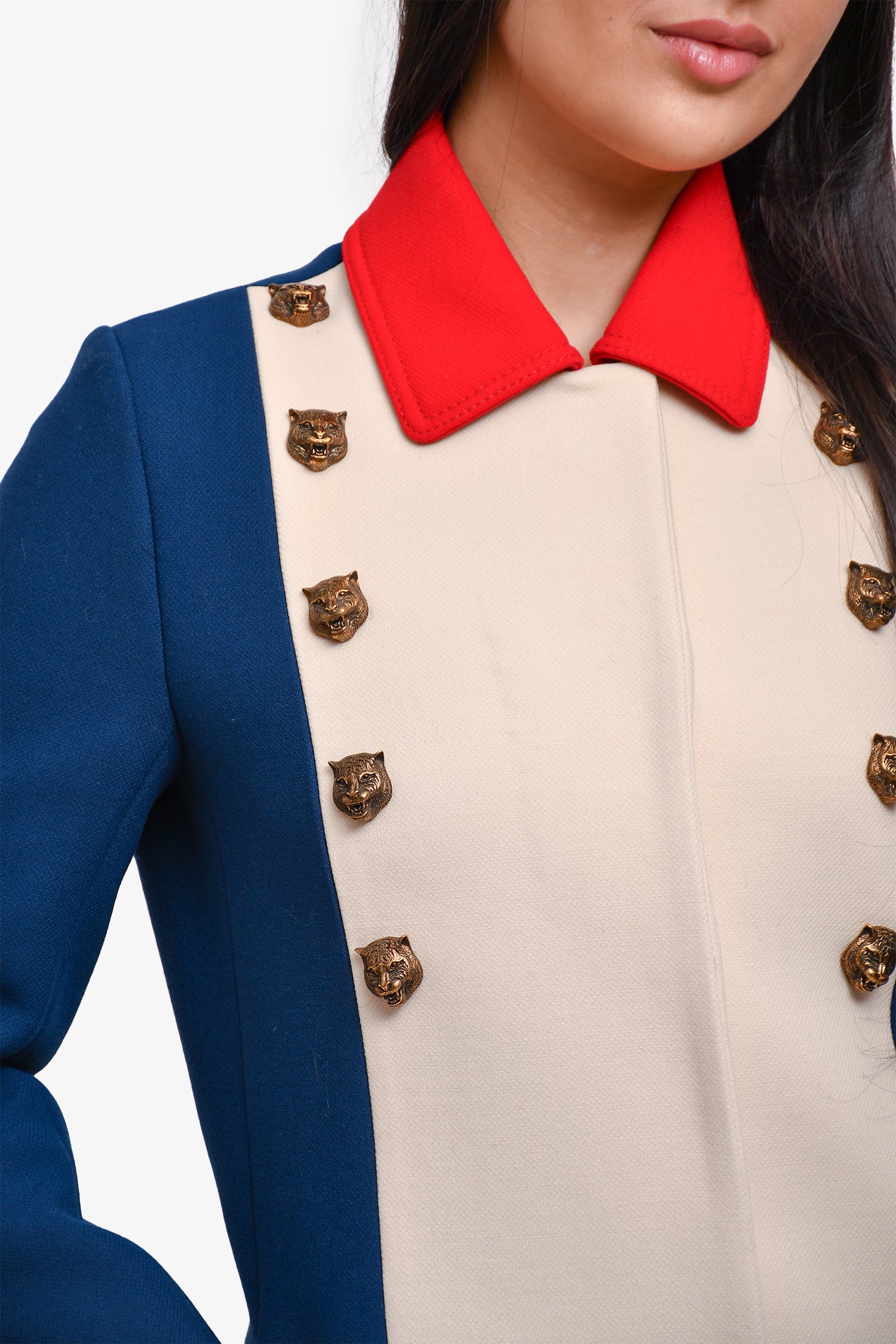 Refresh availabilityGucci 2016 Blue/Cream Tricolour Wool Coat with Gold Tiger Head Buttons. Front snap closures. Lined interior. Concealed front pockets. Tonal stitching.