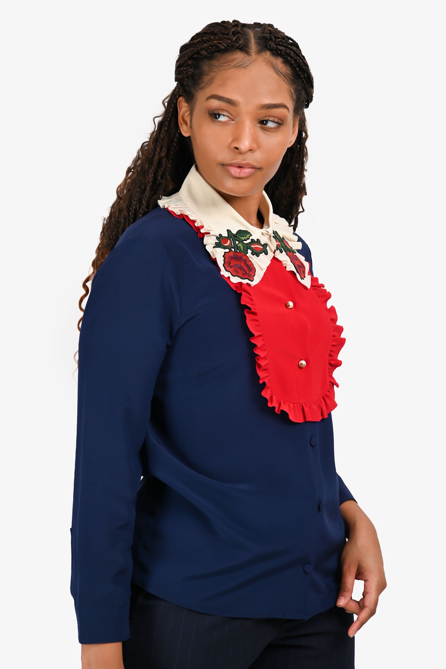 Refresh availabilityGucci 2016 Navy/Red/White Silk Rose Embroidered Long Sleeve Shirt. Slip-on. Front button-up closure. Collared neckline. Cuffs with button-up closure. Gold-tone hardware. Tonal stitching.