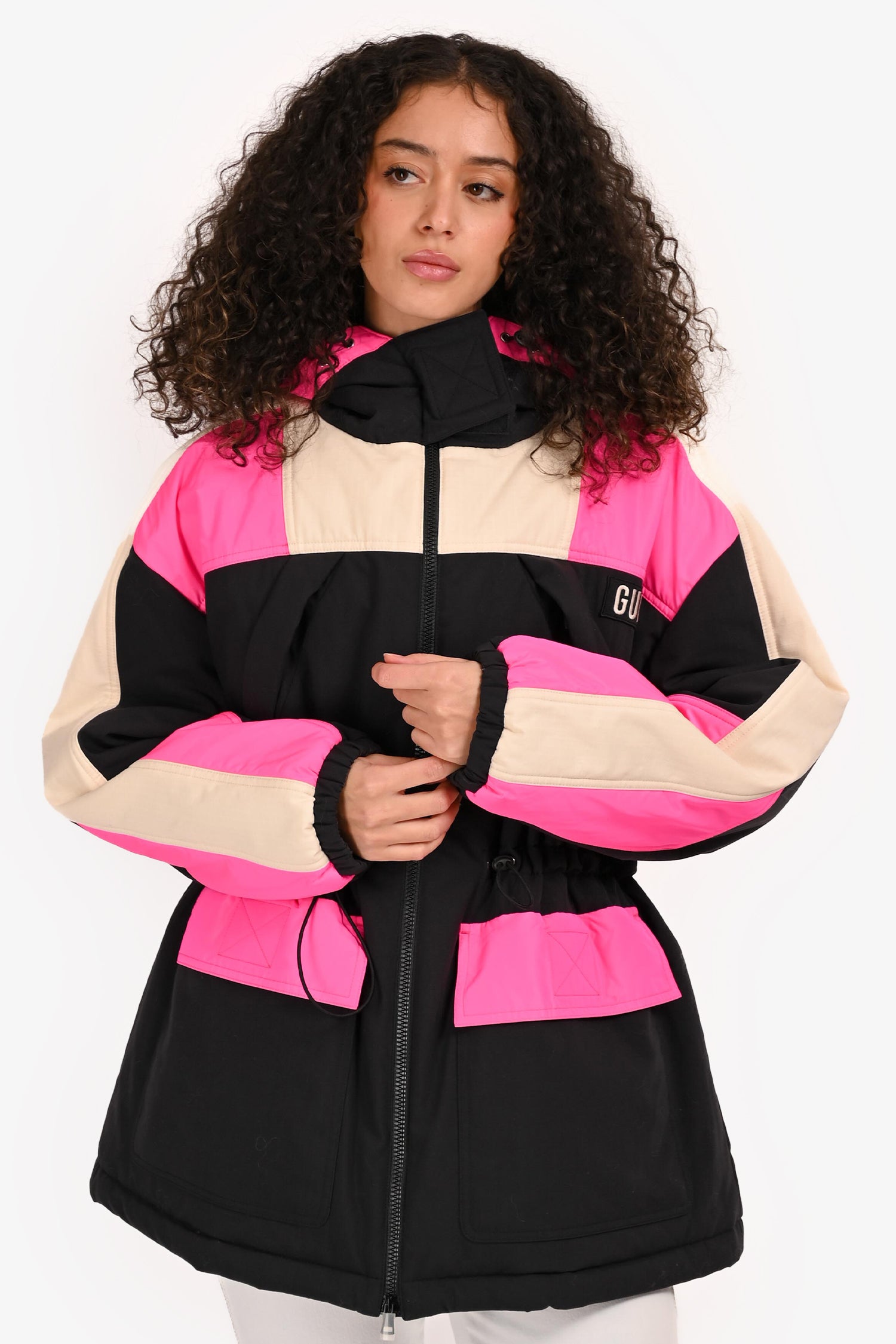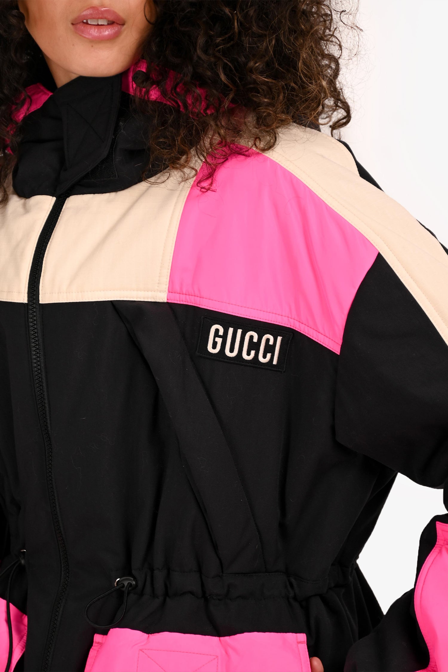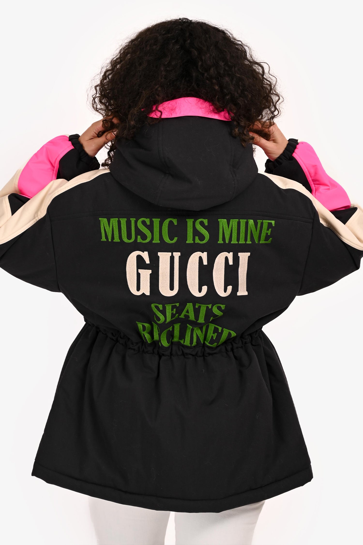 Refresh availabilityGucci 2021 Black/Pink Cinched Waist Hooded 'Music Is Mine' Ski Jacket. Front zip closure with velcro neckline strap.. Drawstring hood and adjustable cinched waist. 2 exterior velcro pockets. Elasticized cuffs. Interior zip pocket. Silver-tone hardware. Tonal stitching.