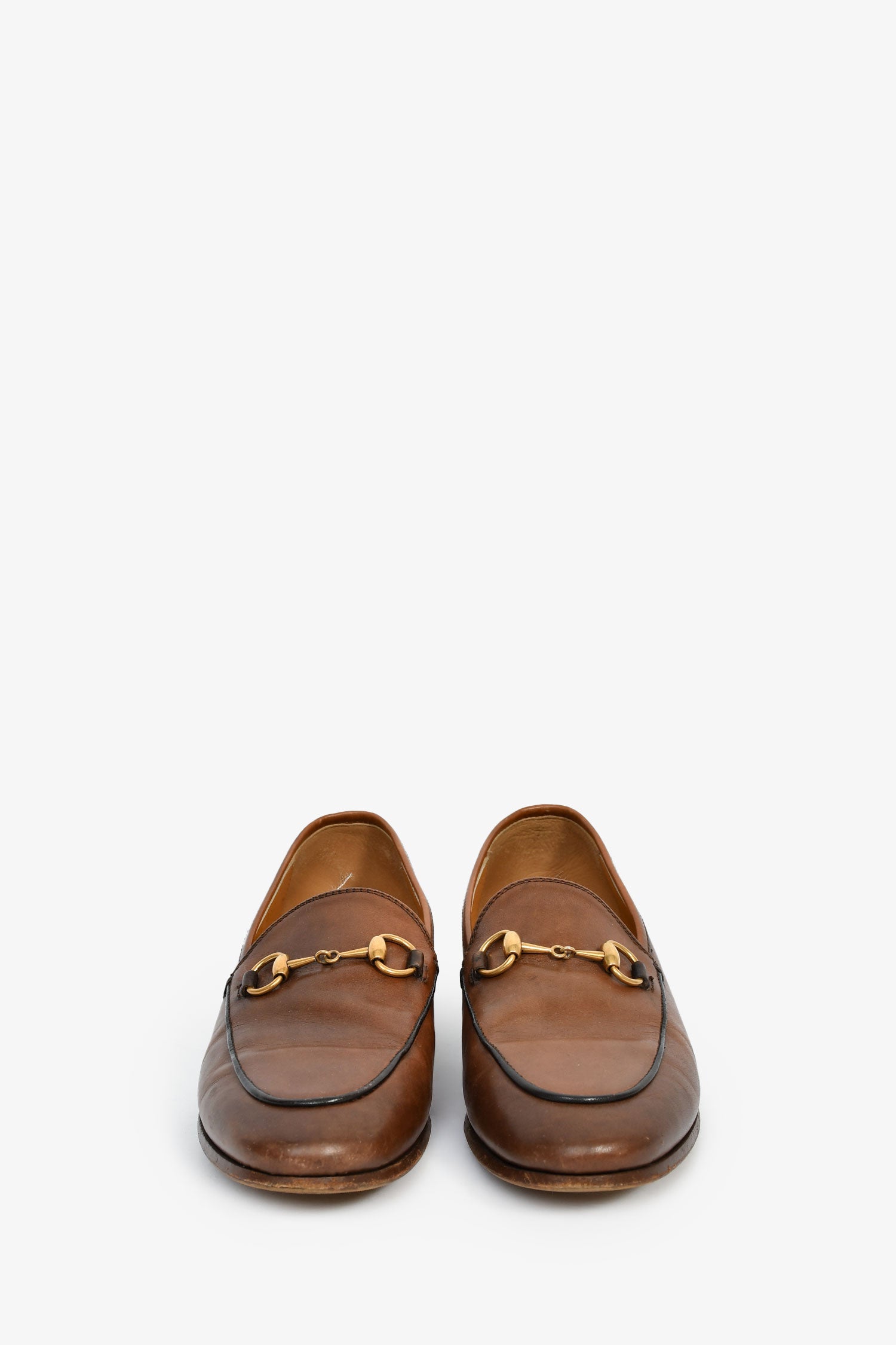 Refresh availabilityGucci Aged Brown Leather Jordaan Horsebit Loafers. Slip-on. Round toe. Gold-tone hardware. Tonal stitching.
