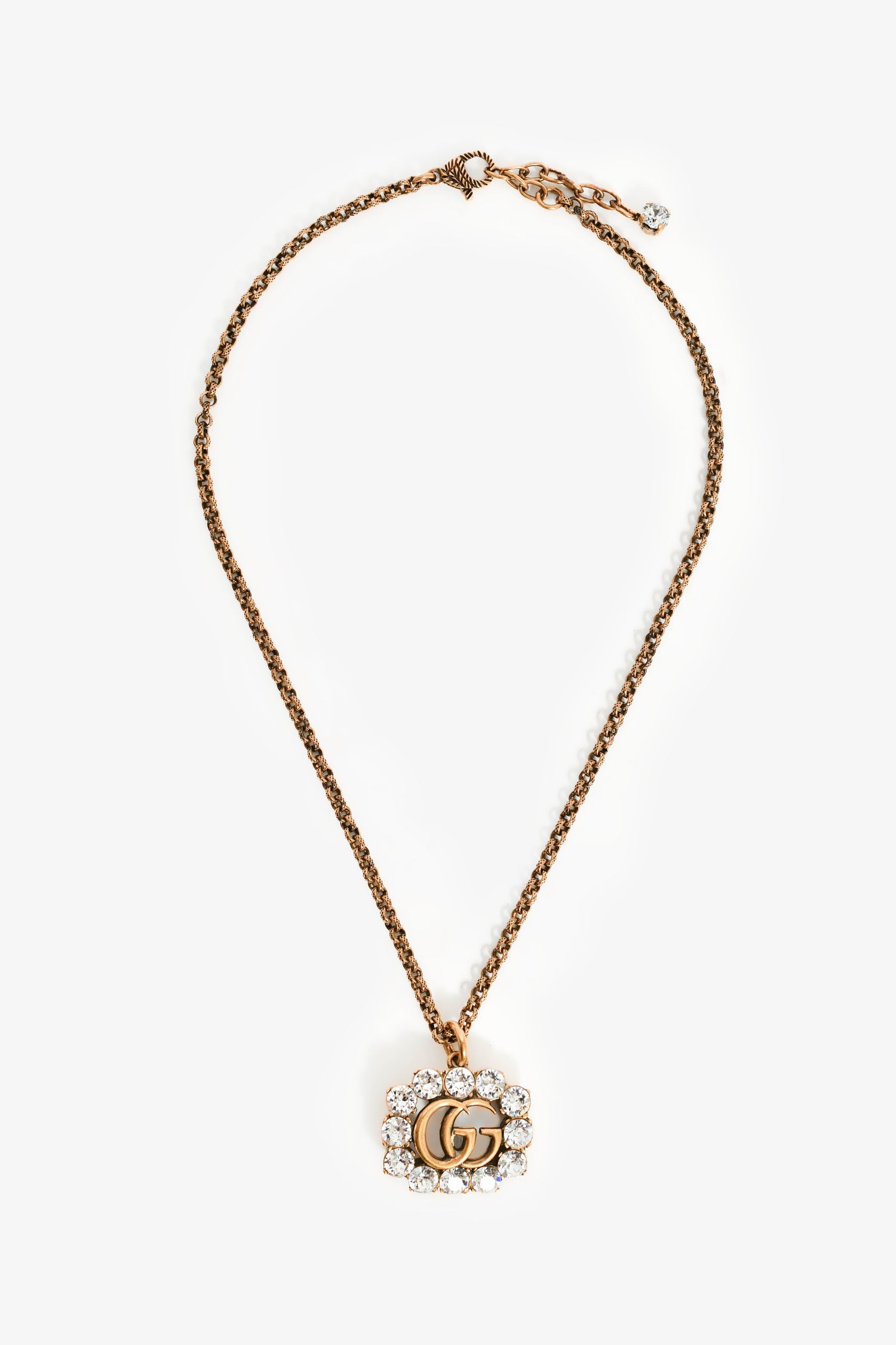 Refresh availabilityGucci Aged Gold Toned Crystal GG Necklace. Lobster clasp closure.