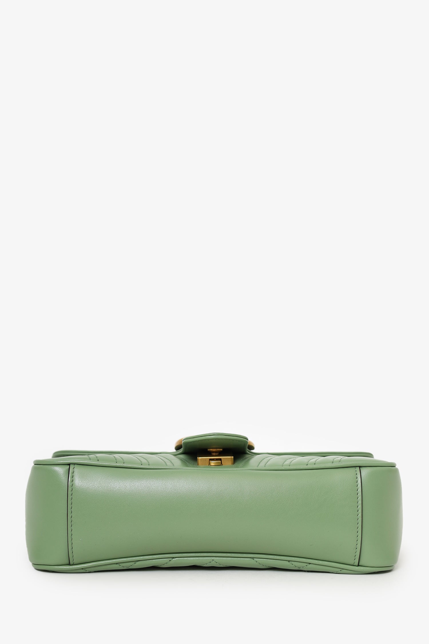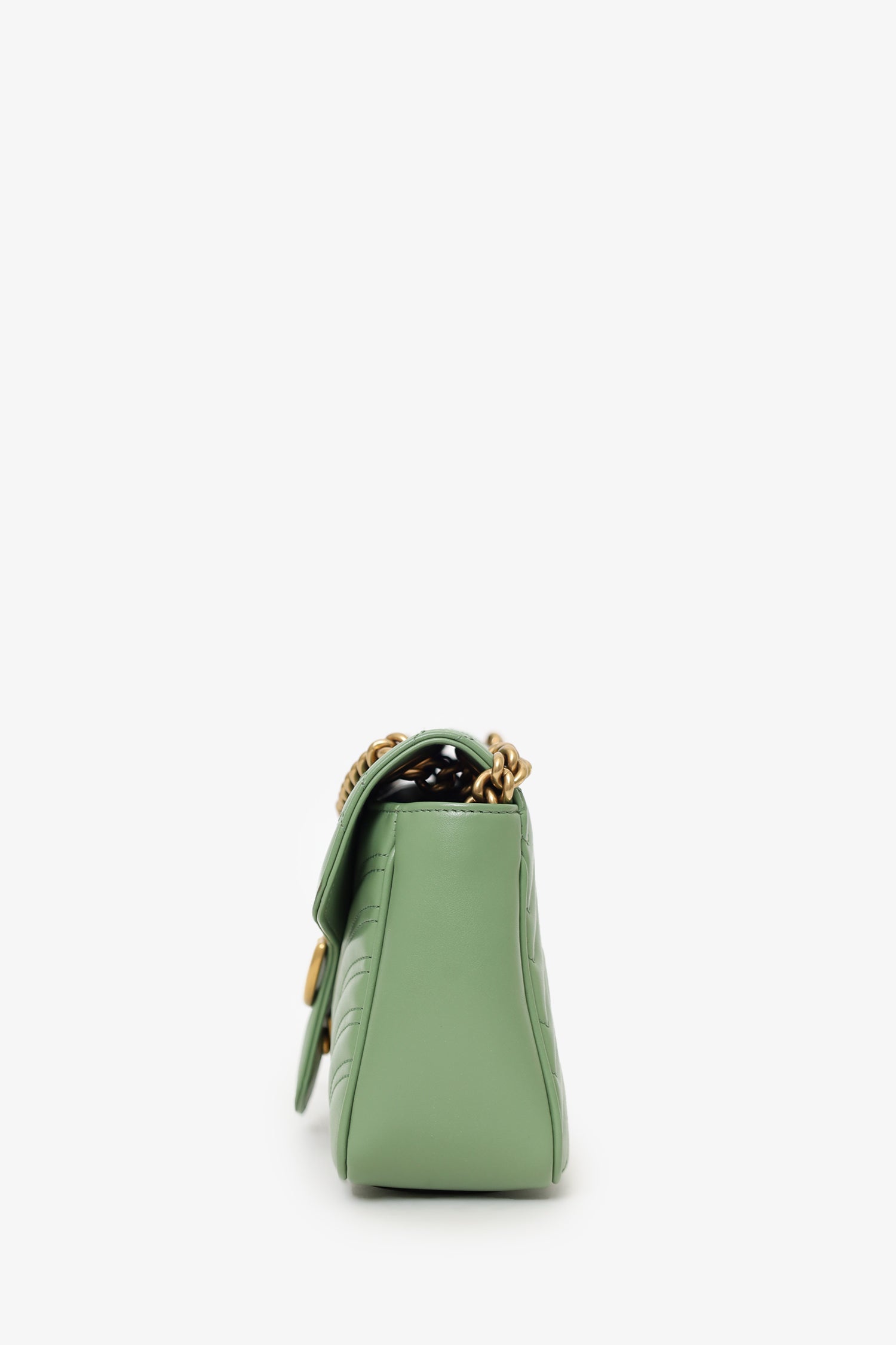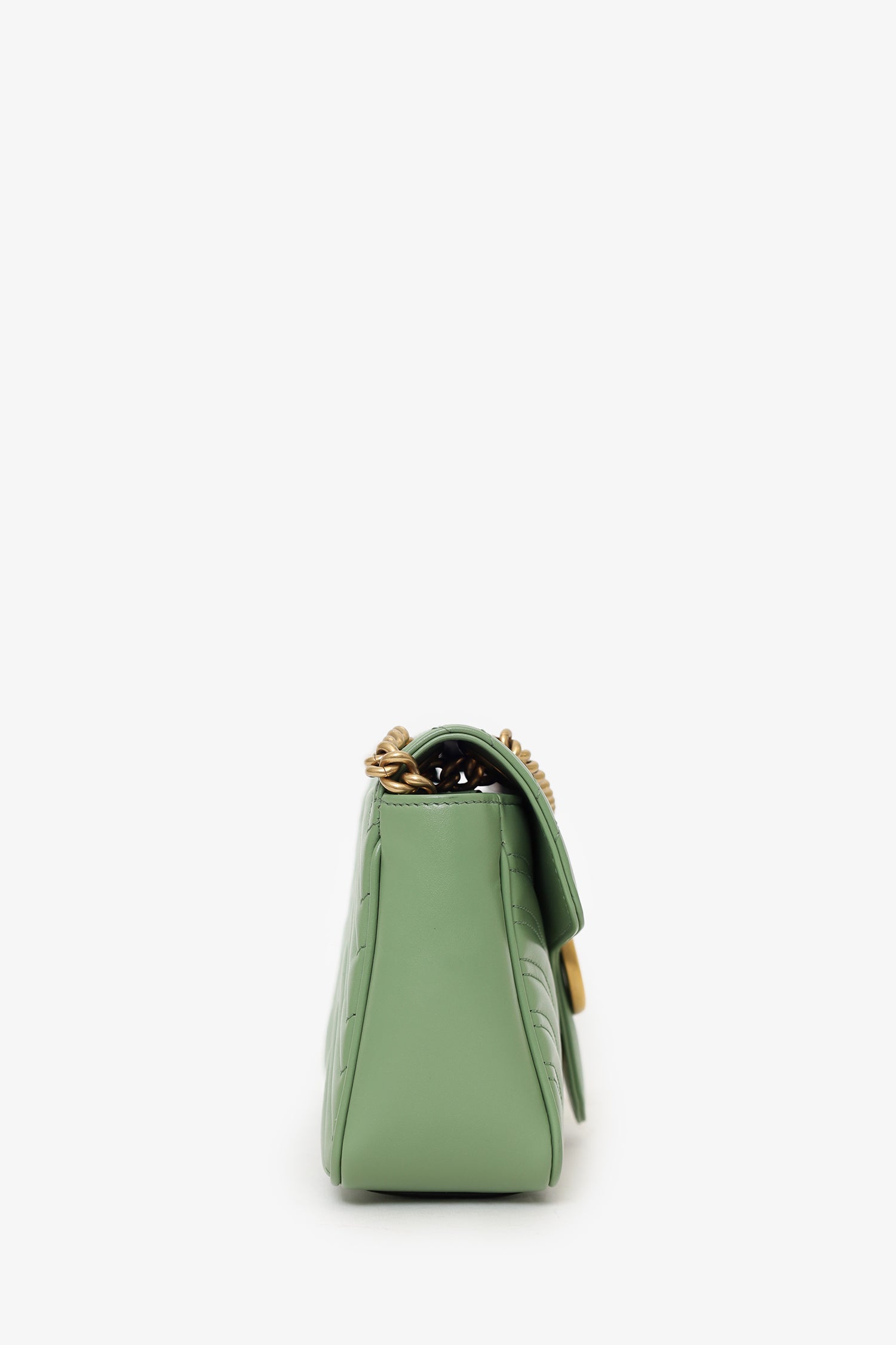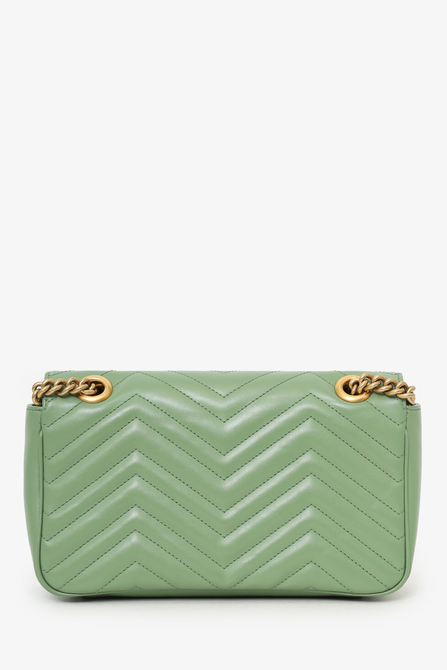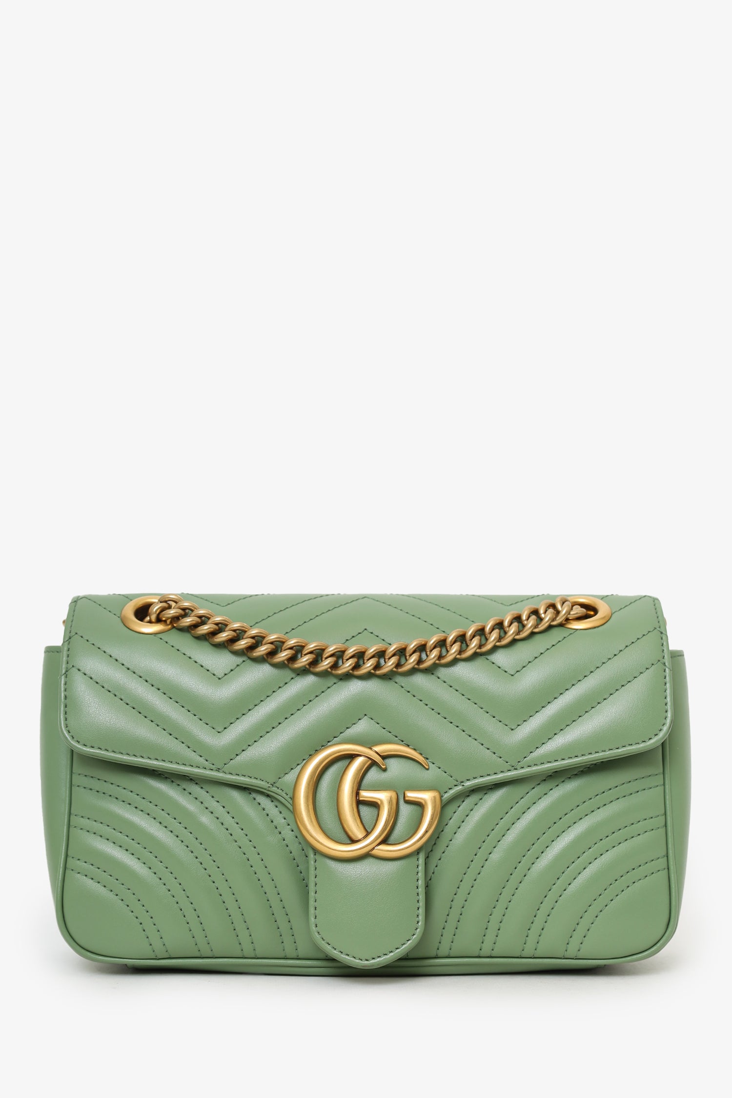 Refresh availabilityGucci Avocado Green GG Marmont Matelasse Small Shoulder Bag. Front fold-over flap with pinch-lock closure. Twin chainlink strap that can be pulled into one long strap. Suede-lined interior. Single interior zip pocket. Gold-tone hardware. Tonal stitching.