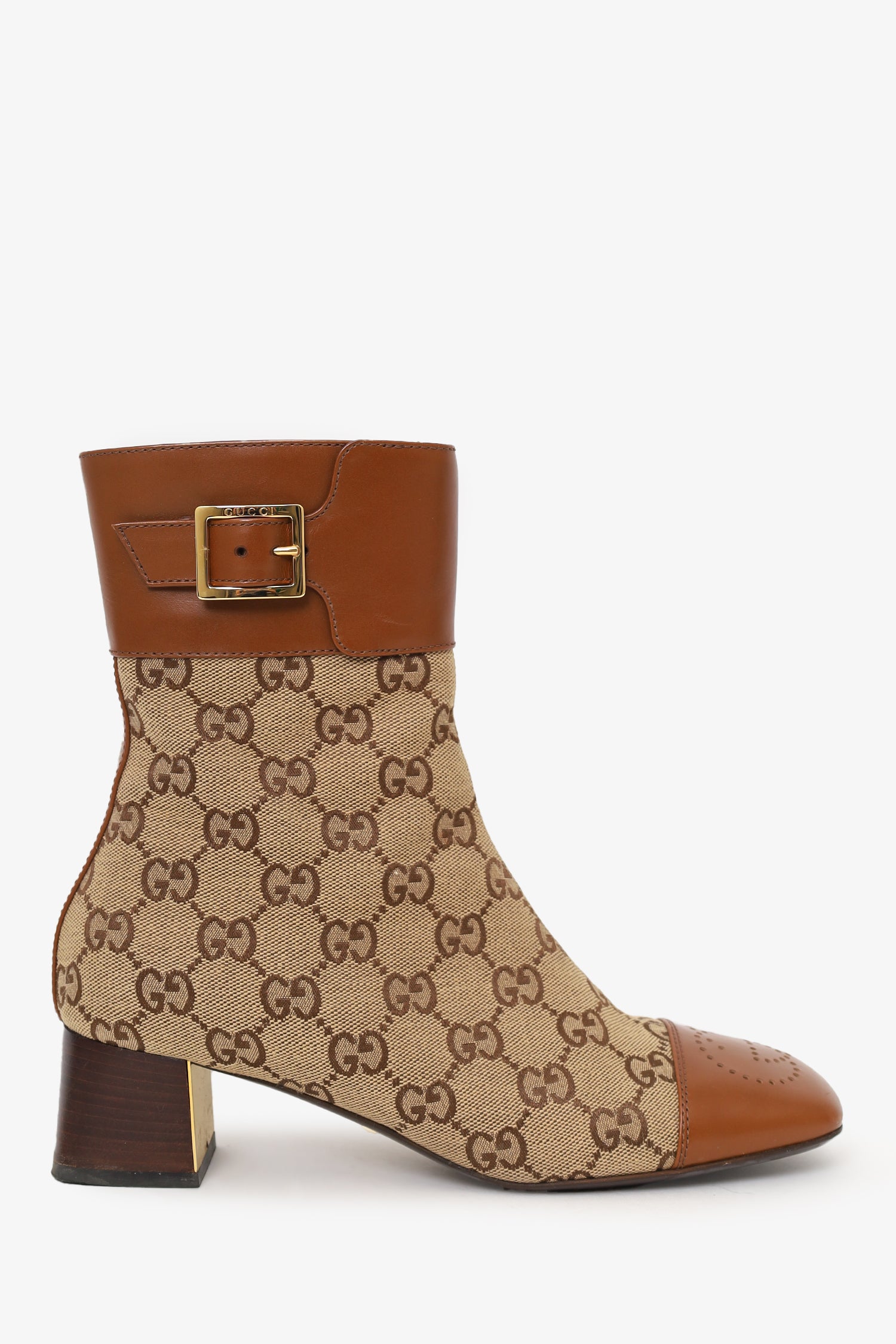 Refresh availabilityGucci Beige/Brown Ellis GG-Logo Ankle Boots. Pull-on. Squared-toe. Inner side zip closure. Buckle closure on outer side exterior. Leather-lined interior. Gold-tone hardware. Tonal stitching.