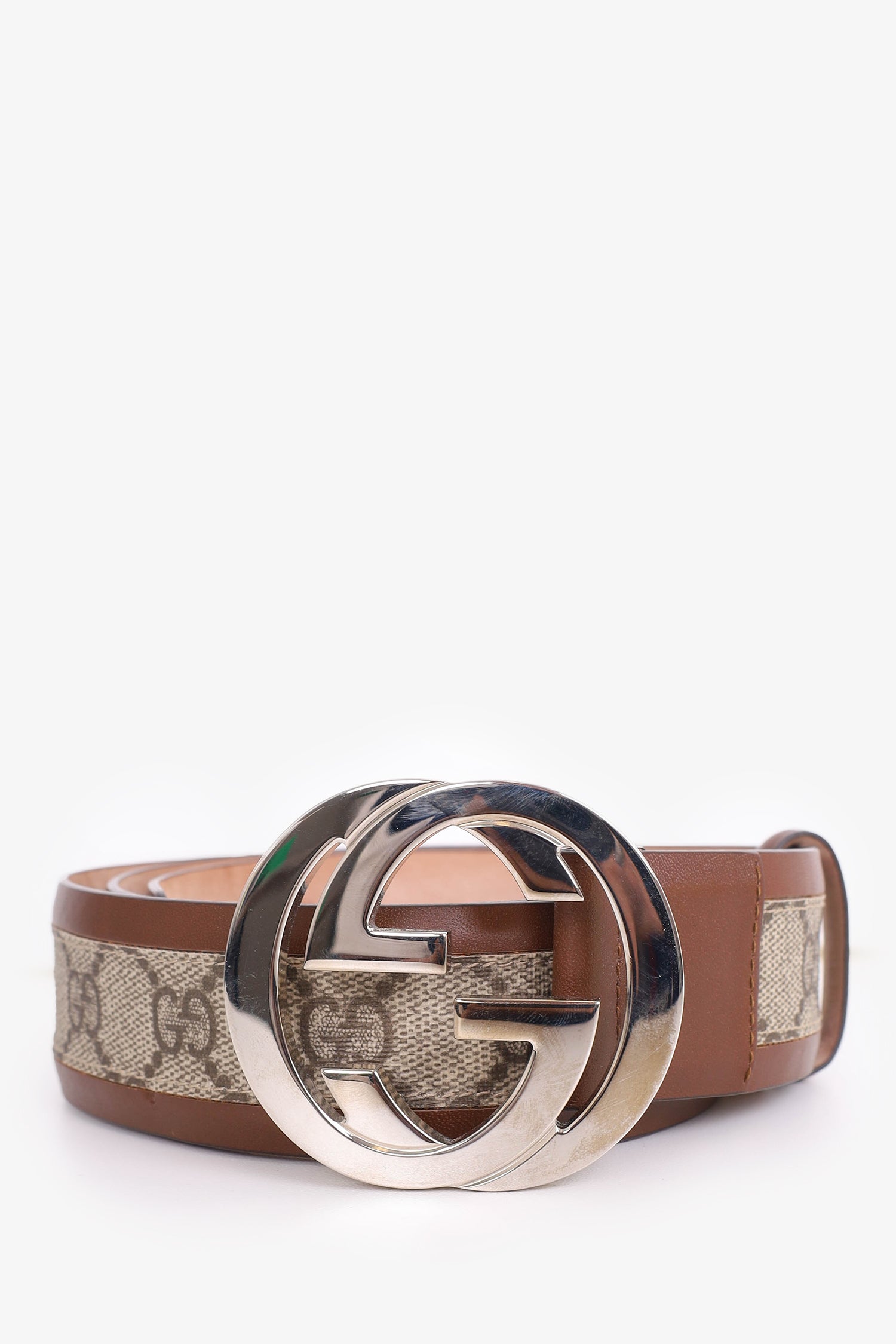Refresh availabilityGucci Beige/Brown GG Canvas GG Buckle Belt. Adjustable pull throughout buckle closure. Silver-tone hardware.