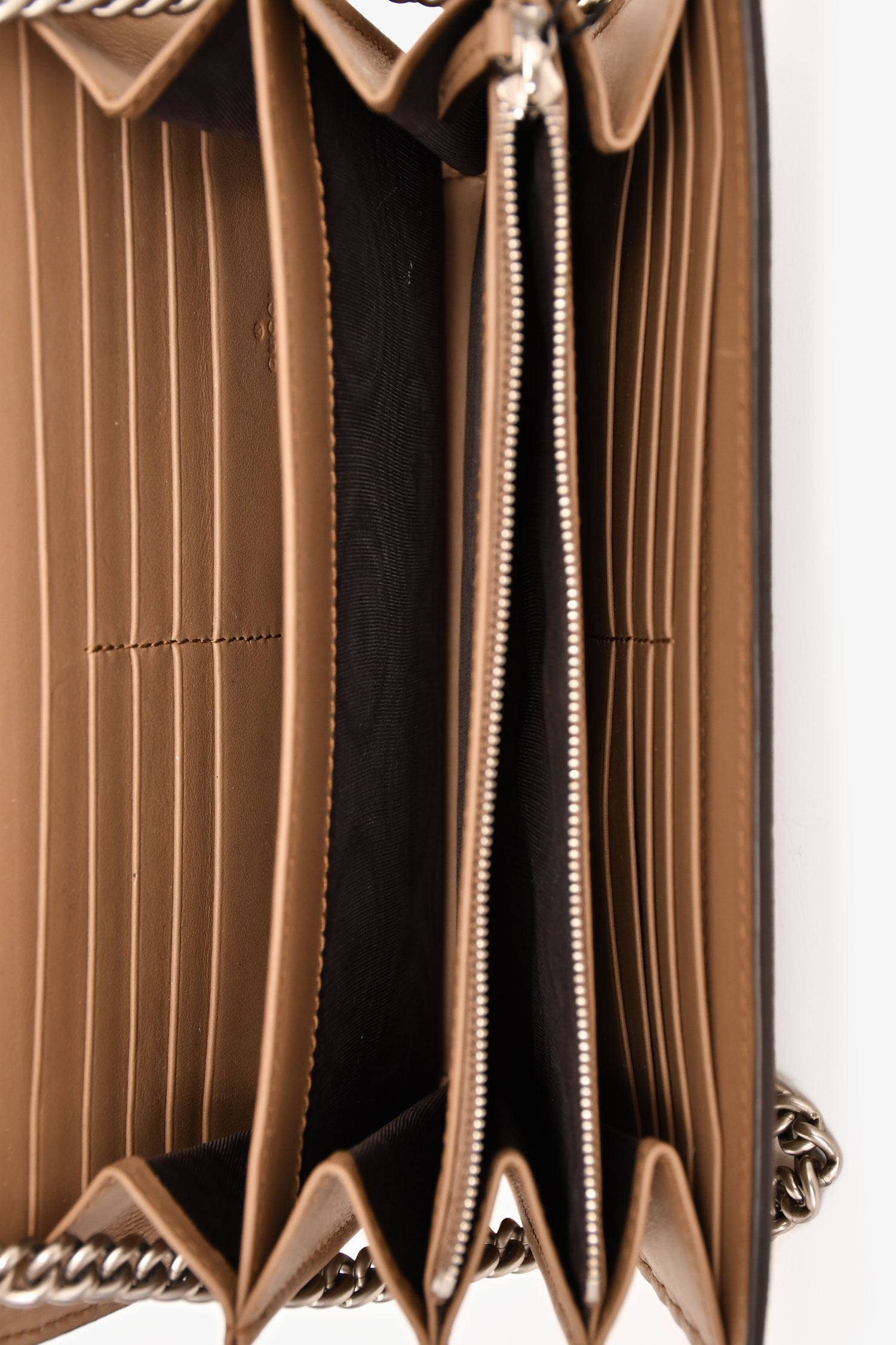 Refresh availabilityGucci Beige Canvas Dionysus Wallet on Chain. Top flap with snap-on button closure. 6 interior compartments. 16 card slots. Silver-tone hardware. Tonal stitching.