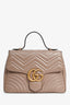 Refresh availabilityGucci Beige Chevron Marmont Large Top Handle. Antiqued gold-tone hardware. Fold-over flap with a push-open closure. Single flat top handle. Chain-link and leather shoulder strap. Suede lined interior with a zipped compartment and 2 slip pockets. Tonal stitching.