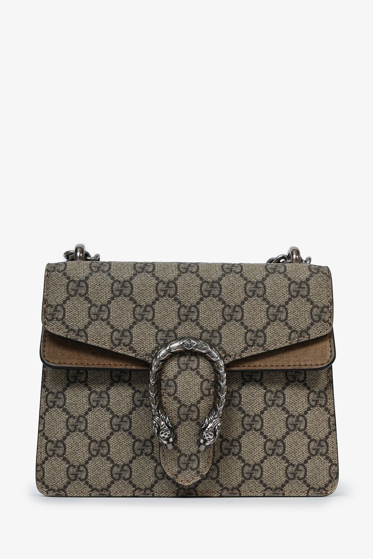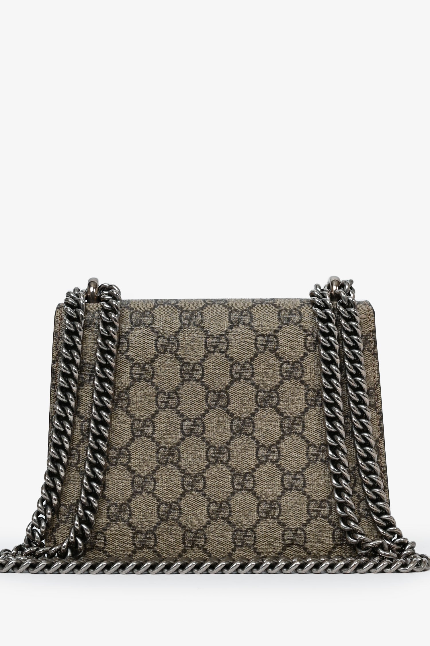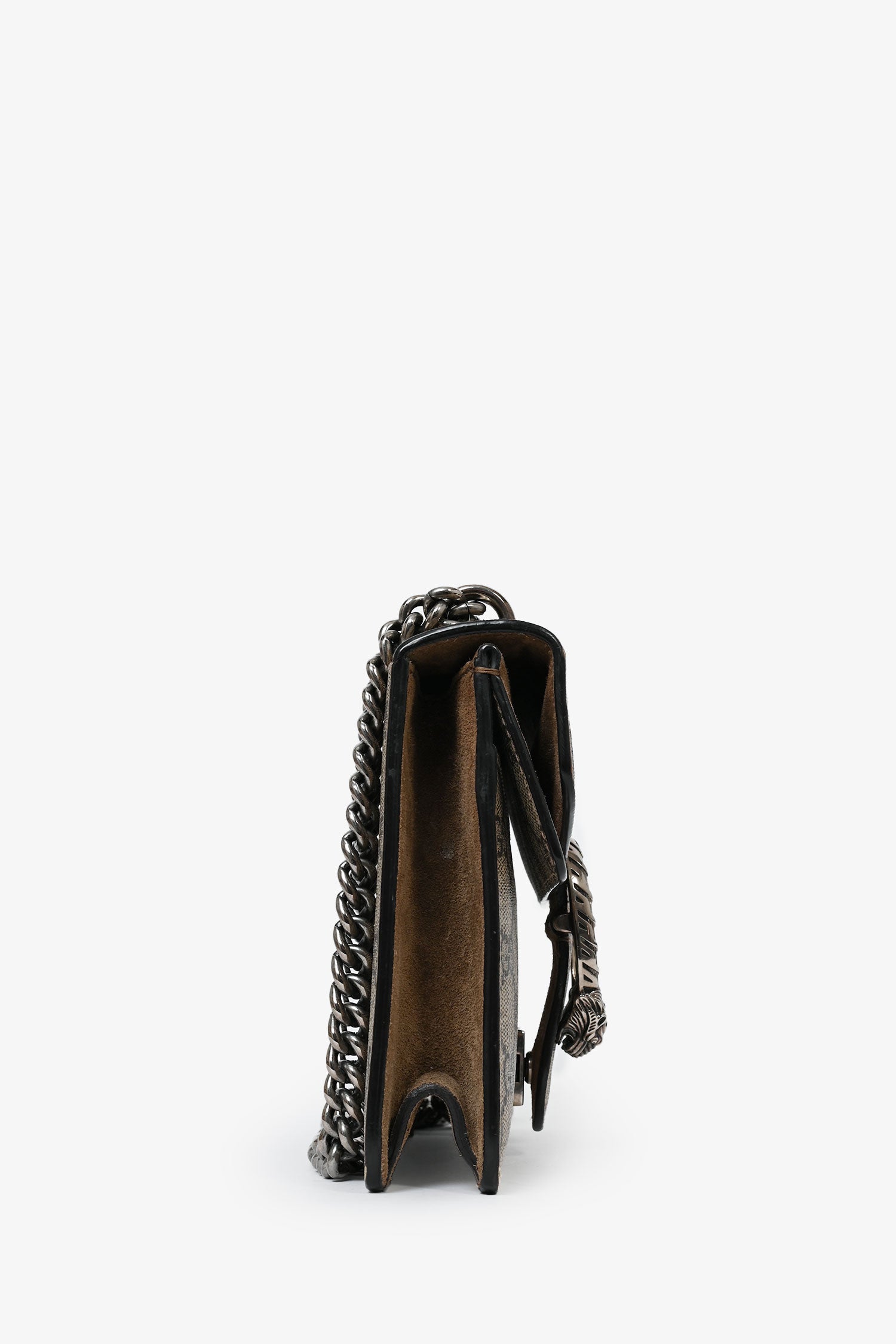 Refresh availabilityGucci Beige Coated Canvas Dionysus Shoulder Bag. Antiqued silver-tone hardware. Fold-over flap with a push-lock closure. Suede lined interior. Coated trimming. Chain-link shoulder strap. 2 interior compartments. Tonal stitching.