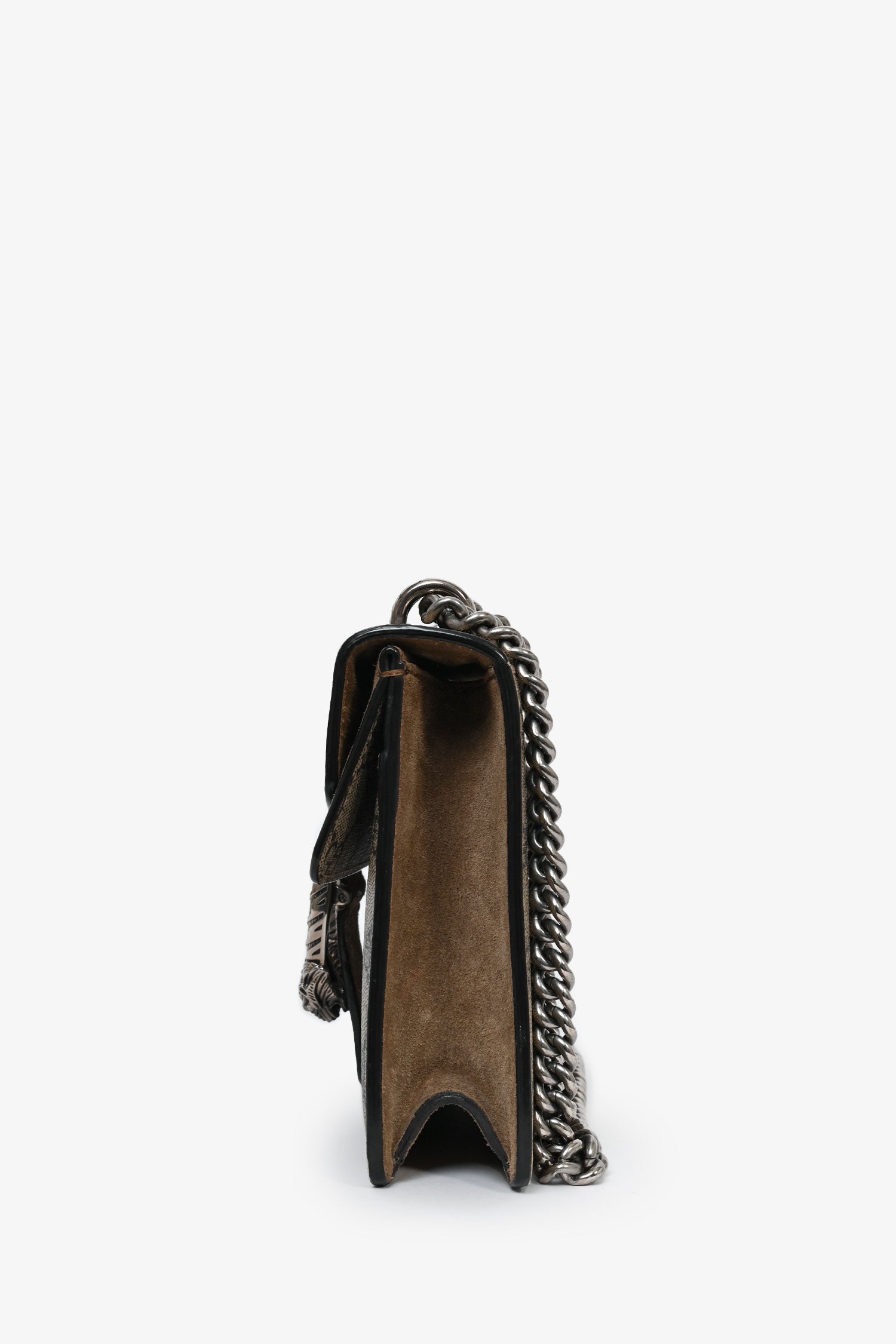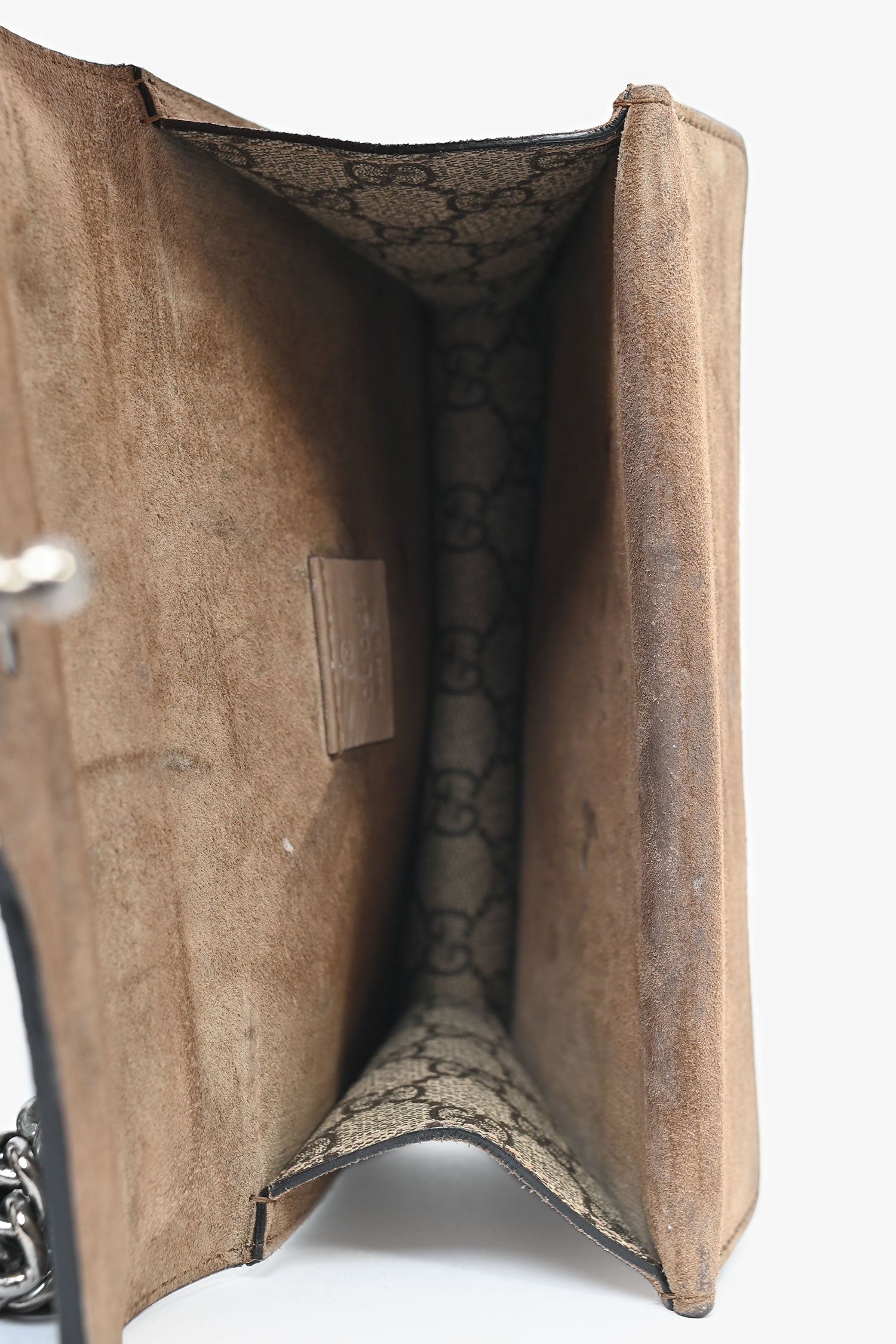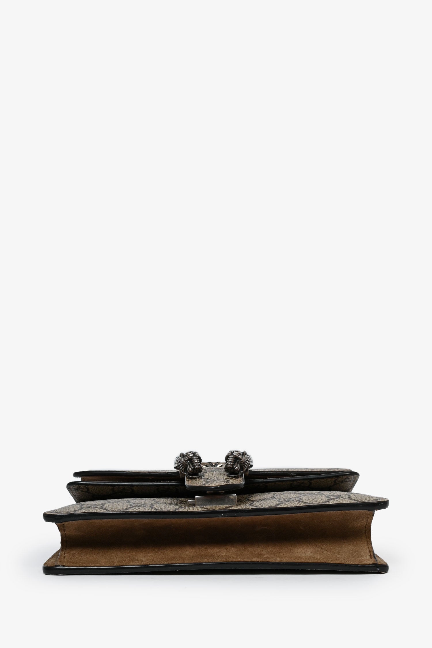 Refresh availabilityGucci Beige Coated Canvas Dionysus Shoulder Bag. Antiqued silver-tone hardware. Fold-over flap with a push-lock closure. Suede lined interior. Coated trimming. Chain-link shoulder strap. 2 interior compartments. Tonal stitching.