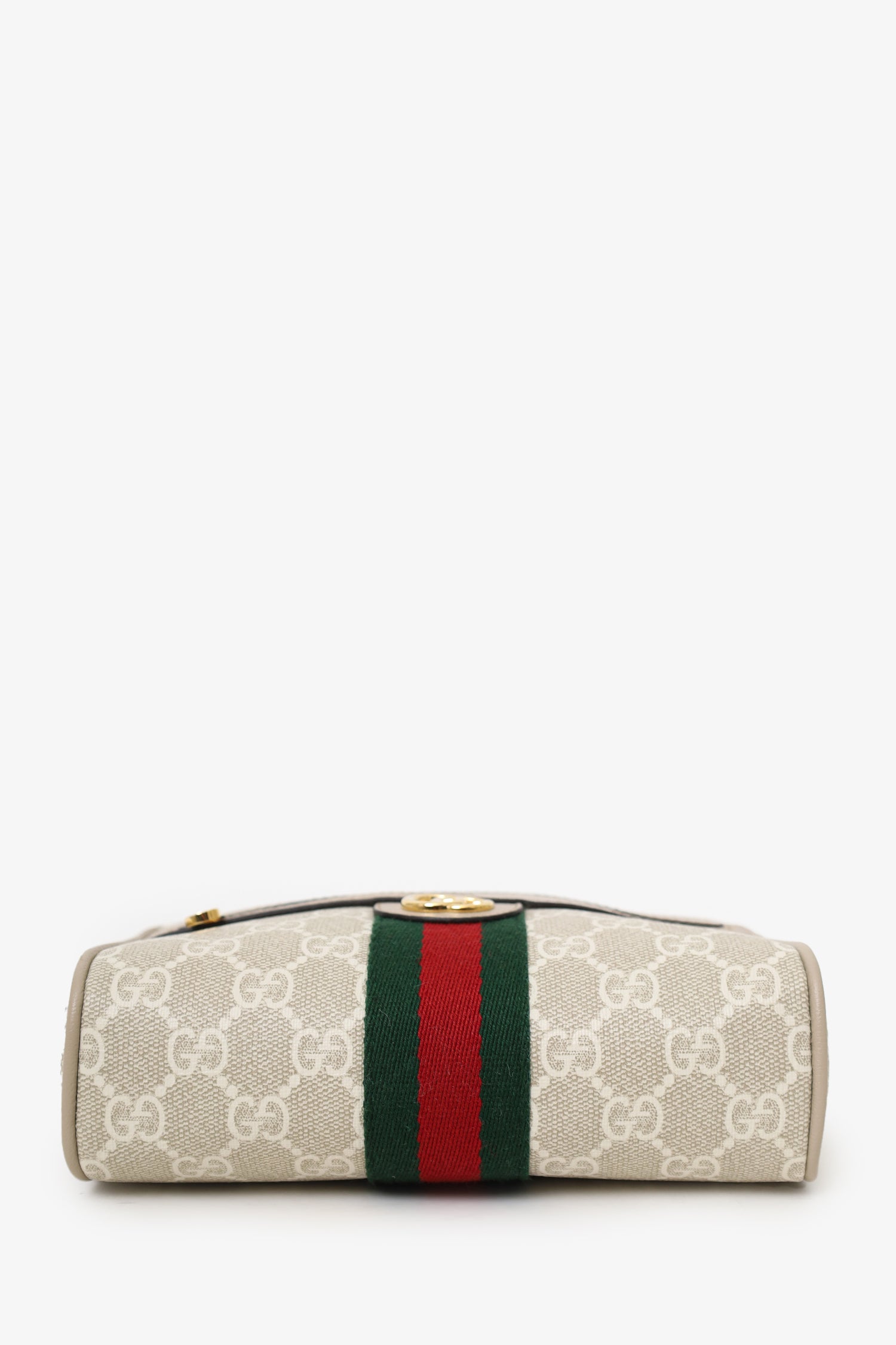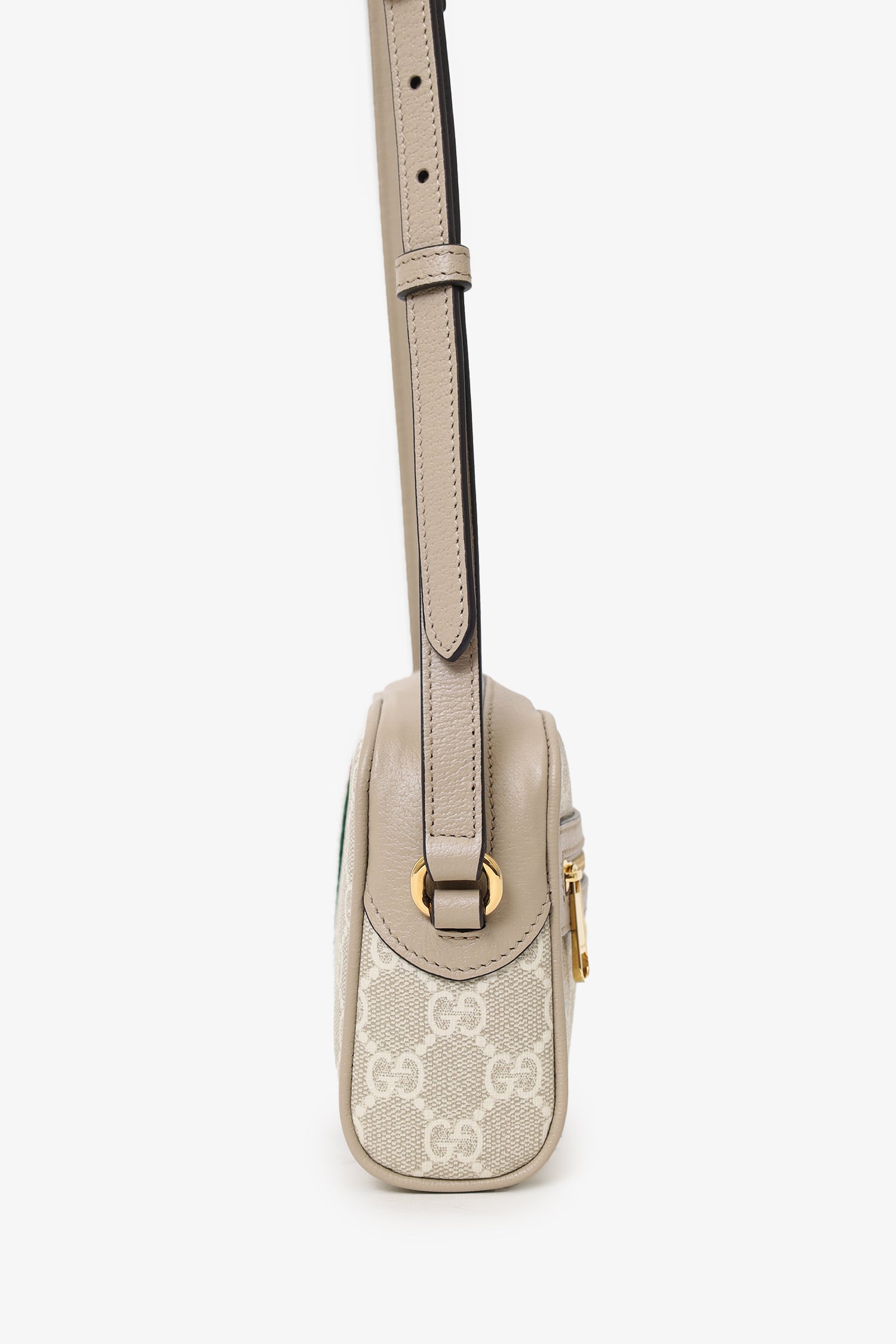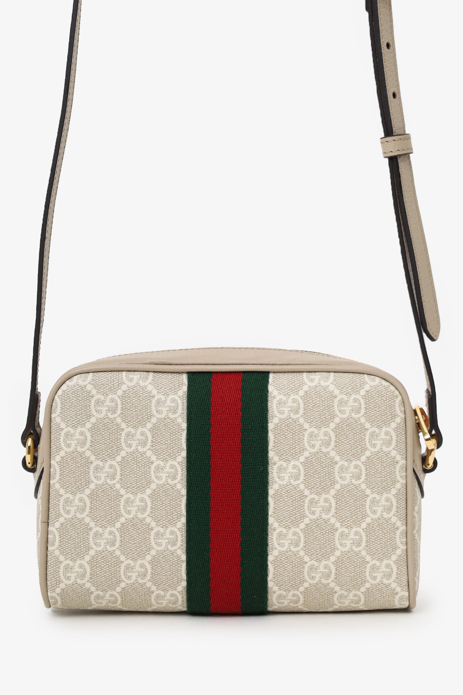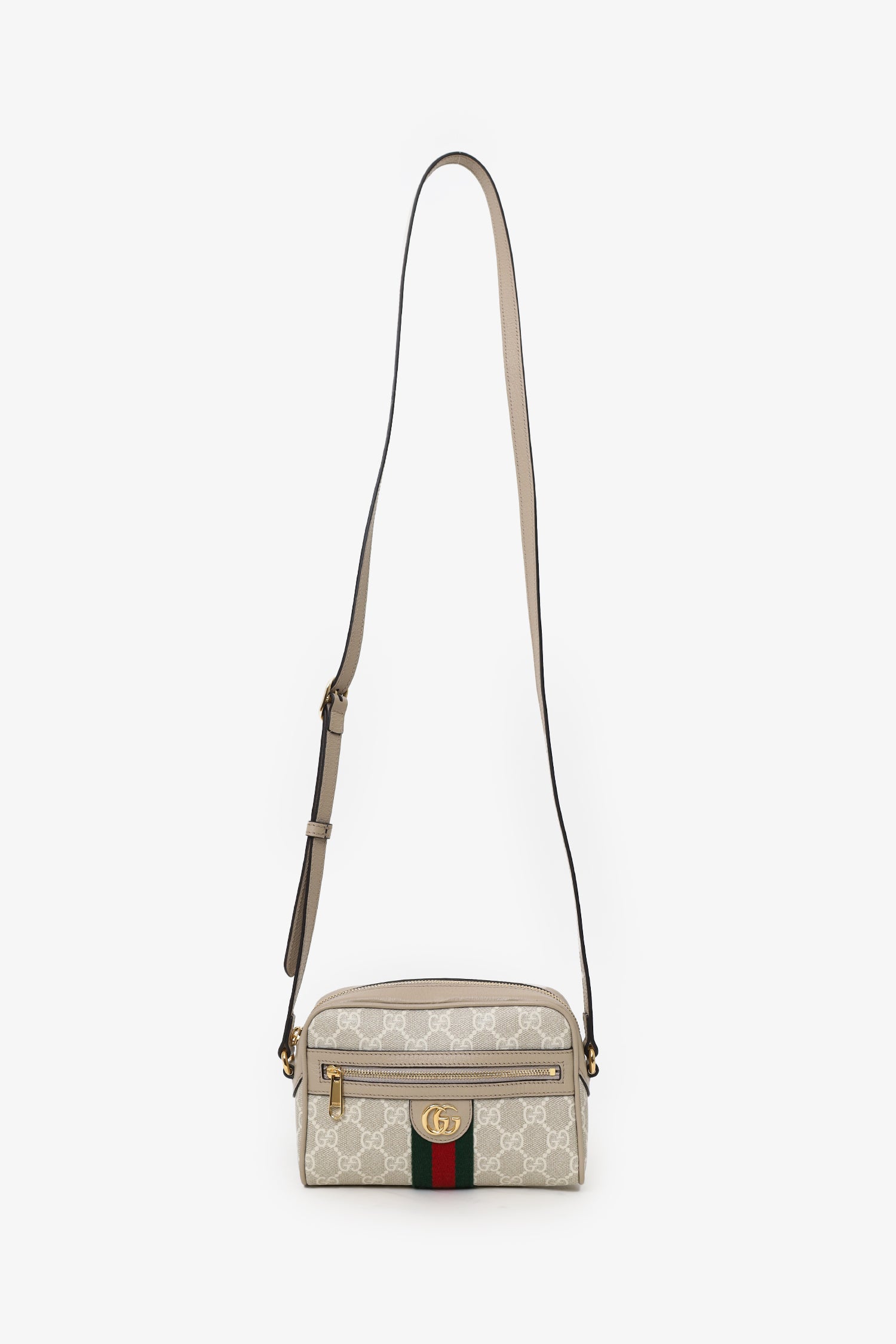 Refresh availabilityGucci Beige GG Supreme Monogram Web Mini Ophidia Crossbody. Top zip closure. Crossbody strap with adjustable buckle closure. Front exterior zip pocket. Canvas-lined interior. Single interior slip pocket. Gold-tone hardware. Tonal stitching.