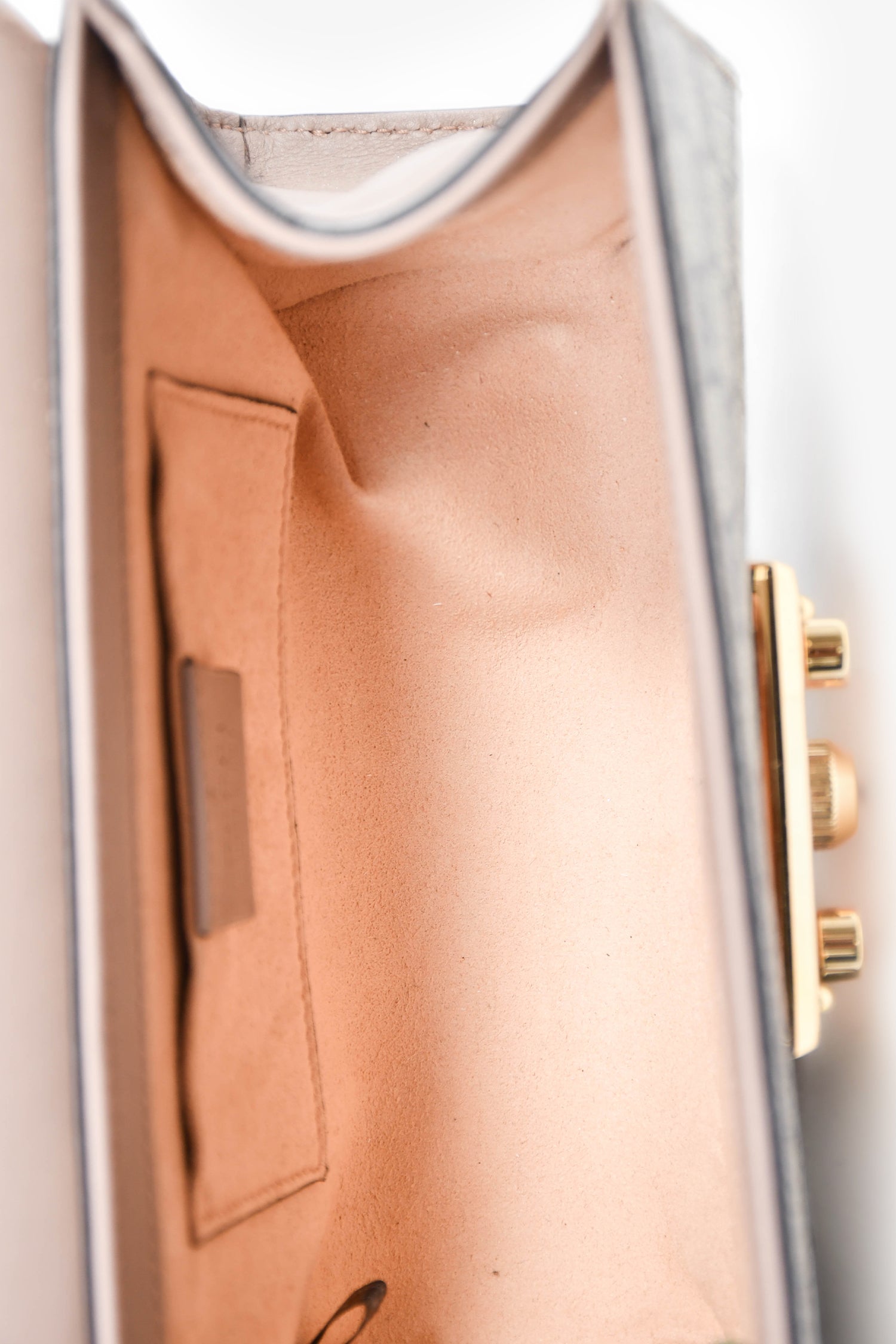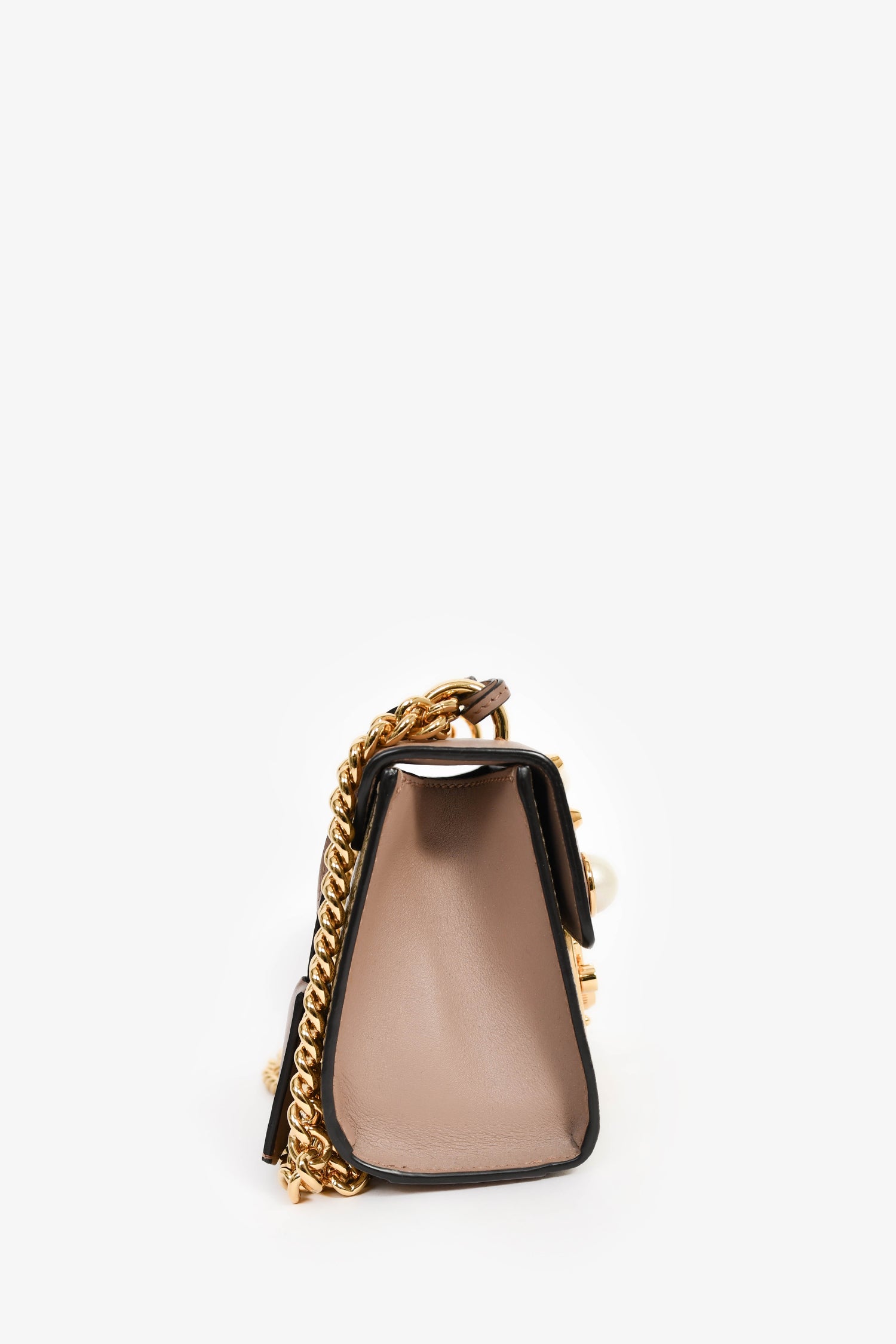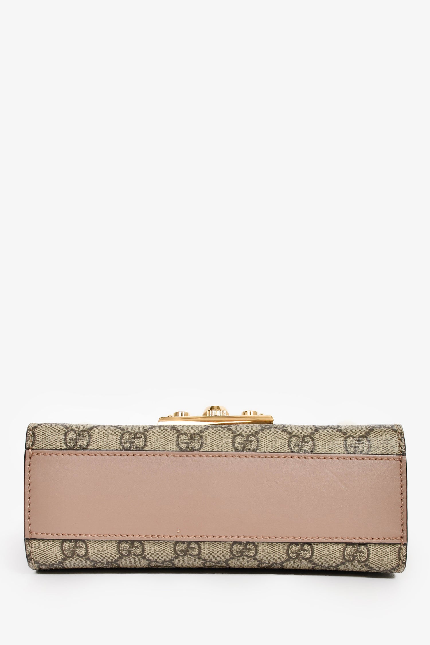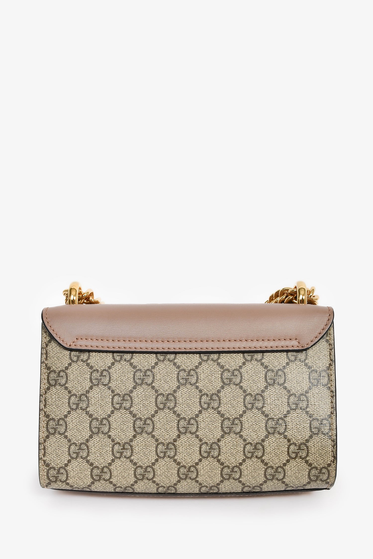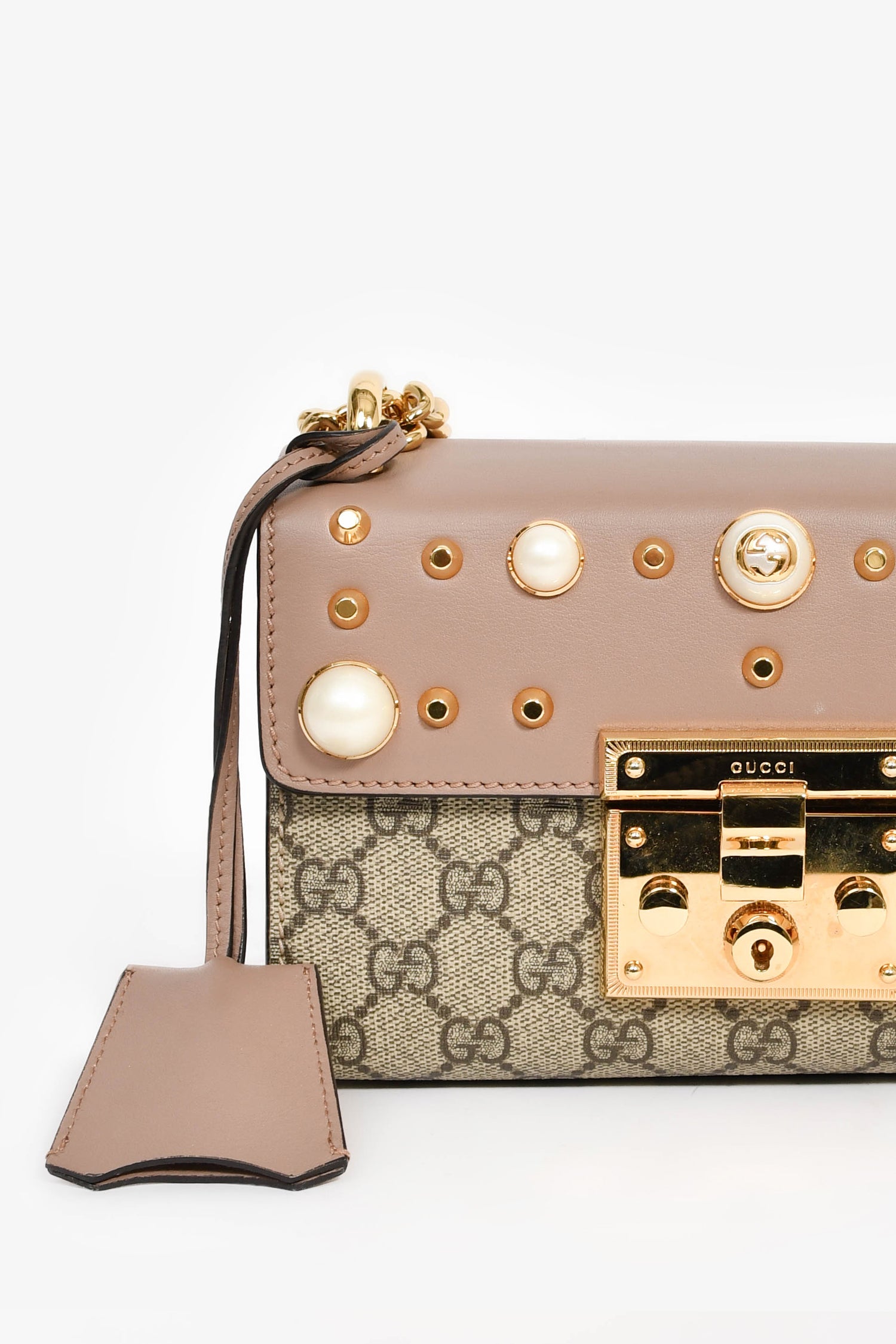 Refresh availabilityGucci Beige GG Supreme Pearl Small Padlock Chain Shoulder Bag. Front fold-over flap with pinch-lock closure. Slide-around chain strap. Suede-lined interior. Single interior wall slip pocket. Detachable clochette. Gold-tone hardware. Tonal stitching.