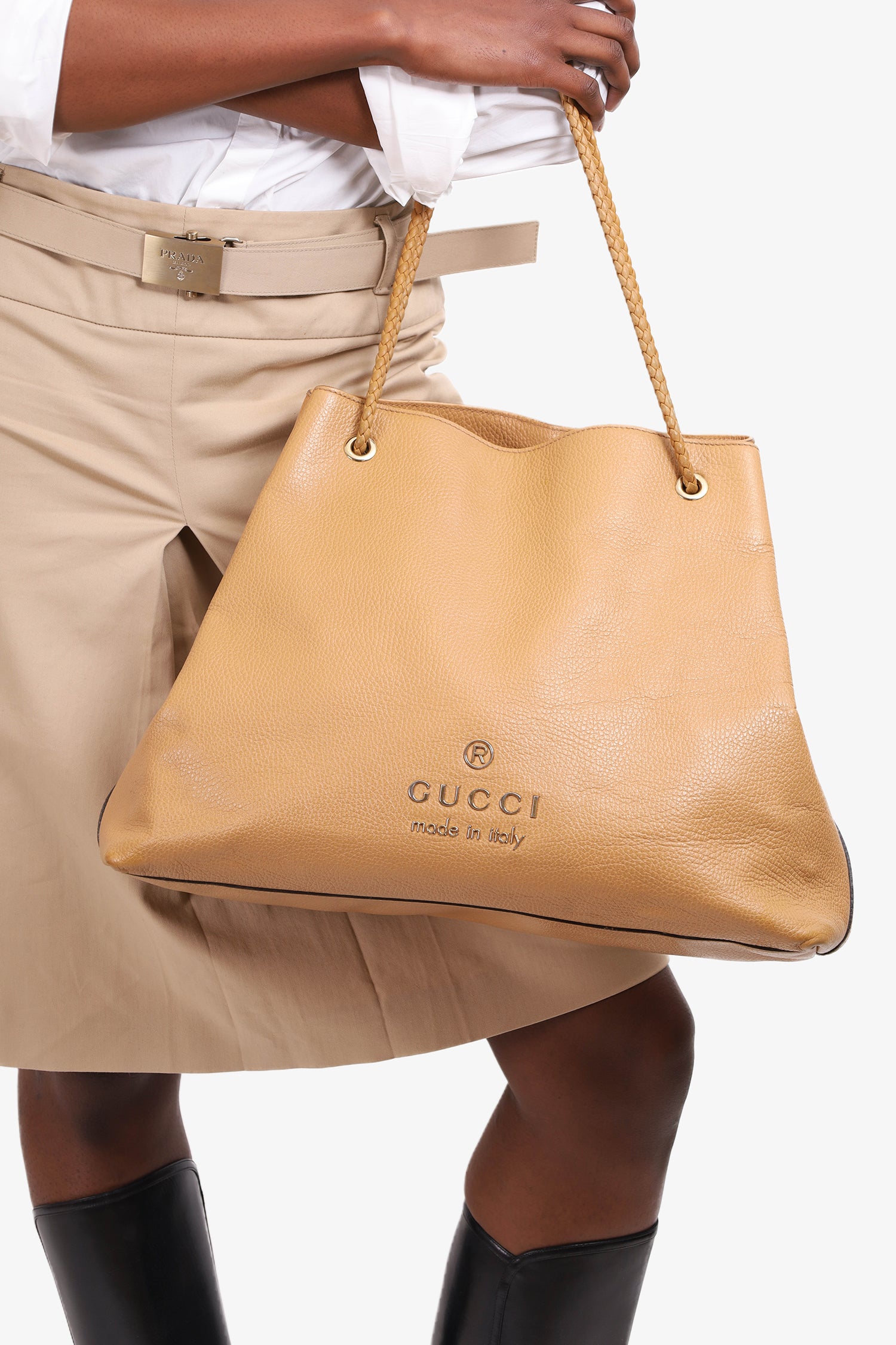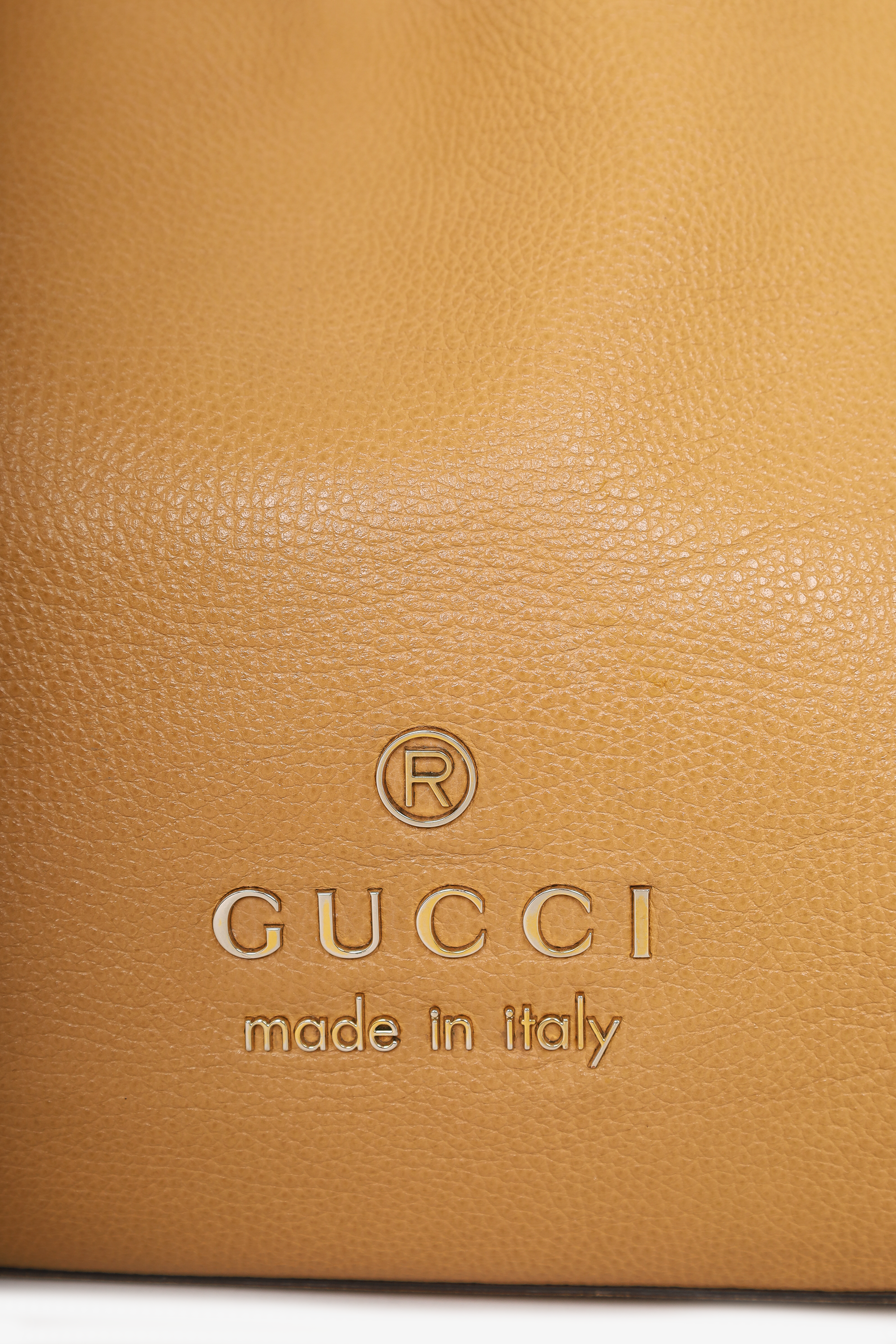 Refresh availabilityGucci Beige Grained Leather Gifford Tote Bag. Open compartment. Leather rope style handle. 1 interior zip pocket. Tonal stitching.