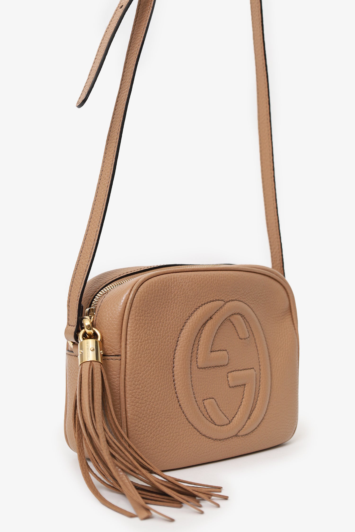 Refresh availabilityGucci Beige Grained Leather Small Soho Disco Crossbody Bag. Top zip closure. Crossbody strap with adjustable buckle closure. Attached tassel charm. Canvas-lined interior. 2 interior slip pockets. Gold-tone hardware. Tonal stitching.