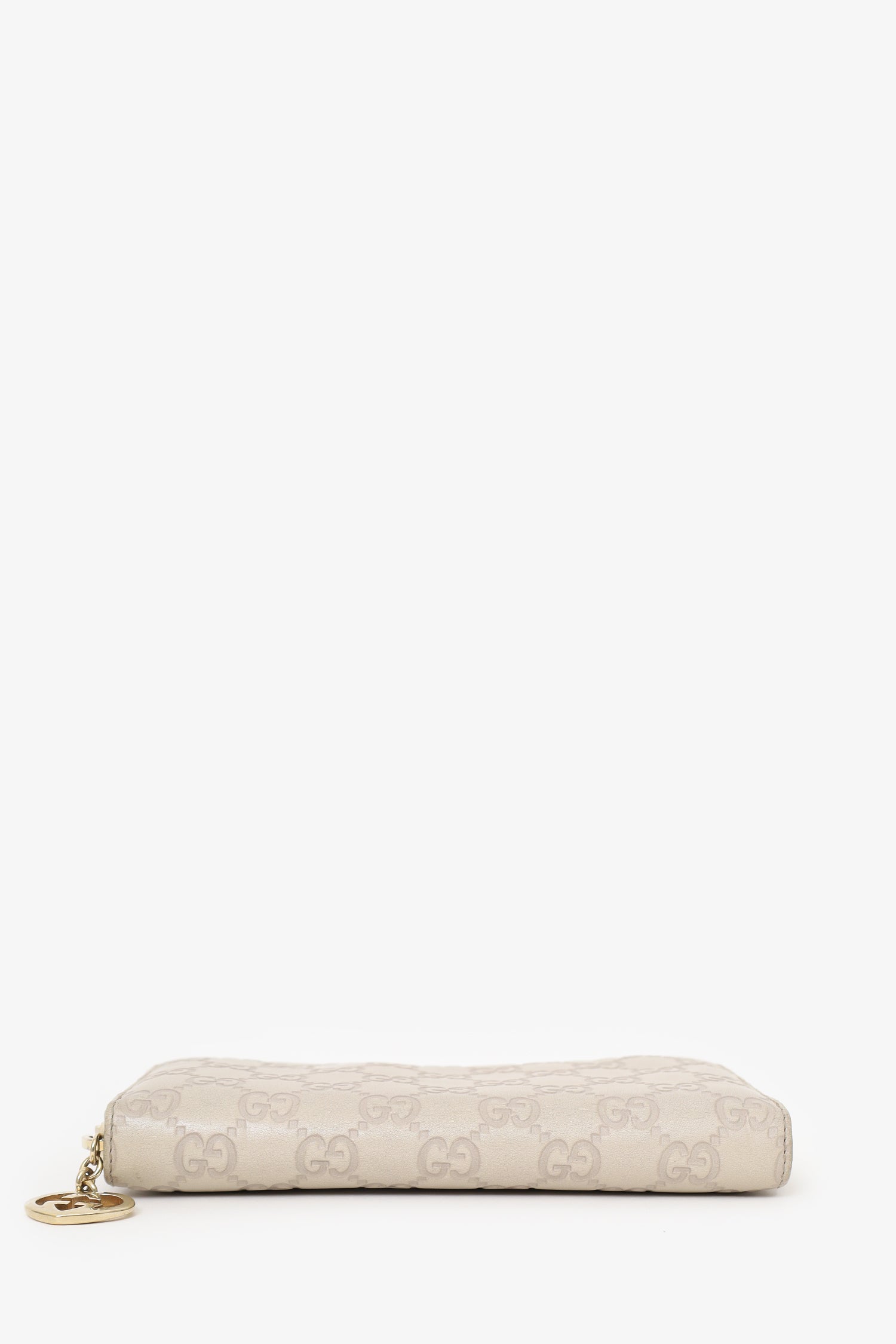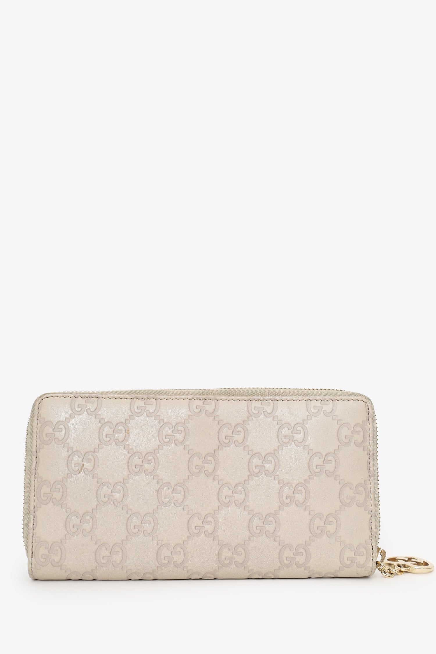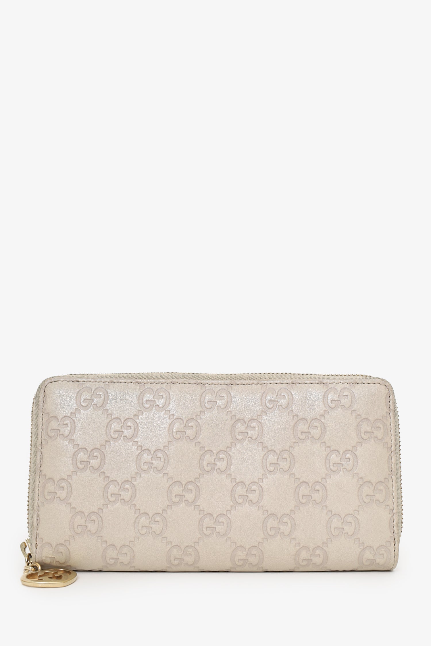 Refresh availabilityGucci Beige Guccissima Leather Zip Around Wallet. Top-zip closure. Signature Gucci monogram embossed exterior. Leather lined interior. 3 interior compartments; 1 middle zip pocket and 2 side slip pockets. 2 interior compartments with 6 card slots in each. Gold-tone hardware. Tonal stitching.