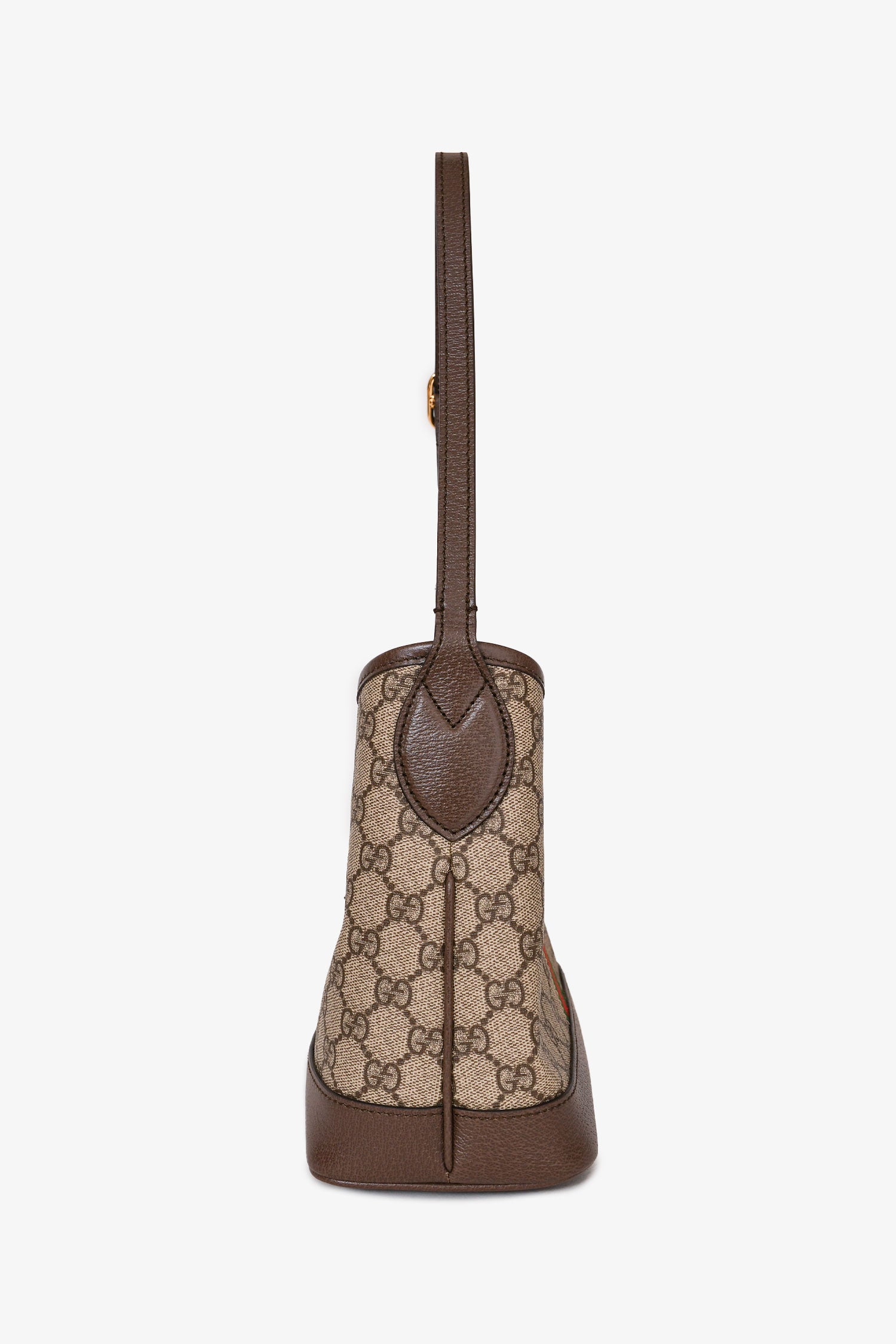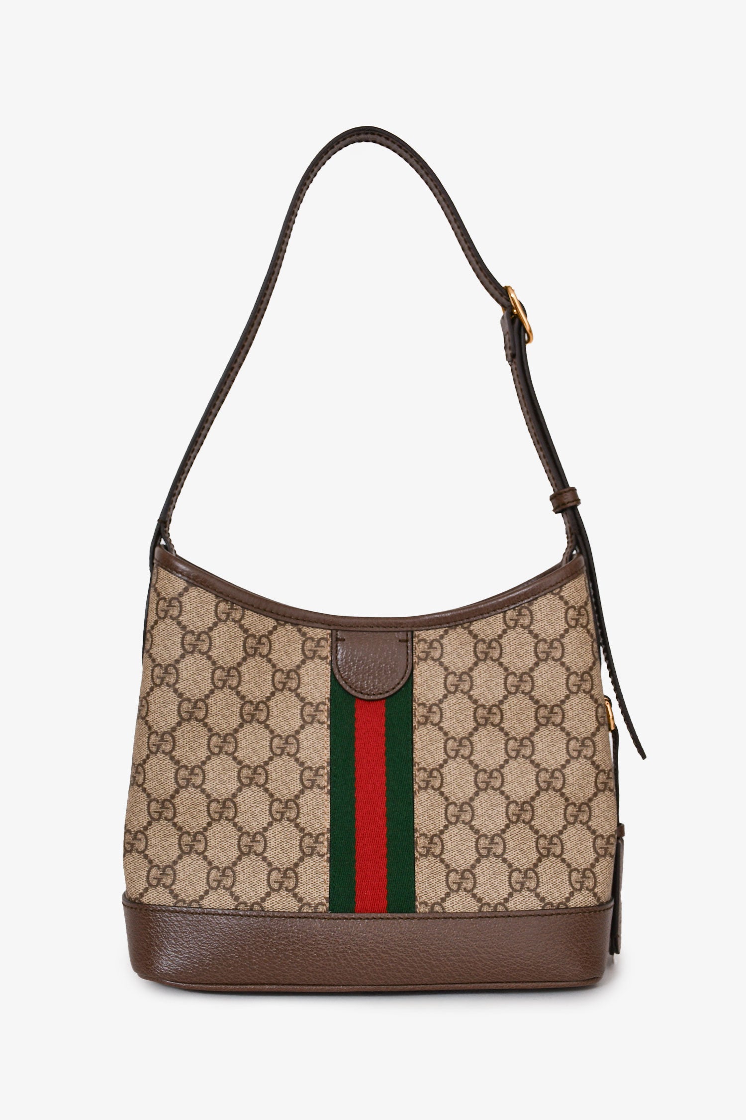 Refresh availabilityGucci Beige Leather Coated Canvas GG Supreme Striped Small 'Ophidia' Shoulder Bag. Adjustable shoulder strap. Gold-tone hardware. Leather trimming. Coated canvas. Concealed snap closure. Tonal stitching.