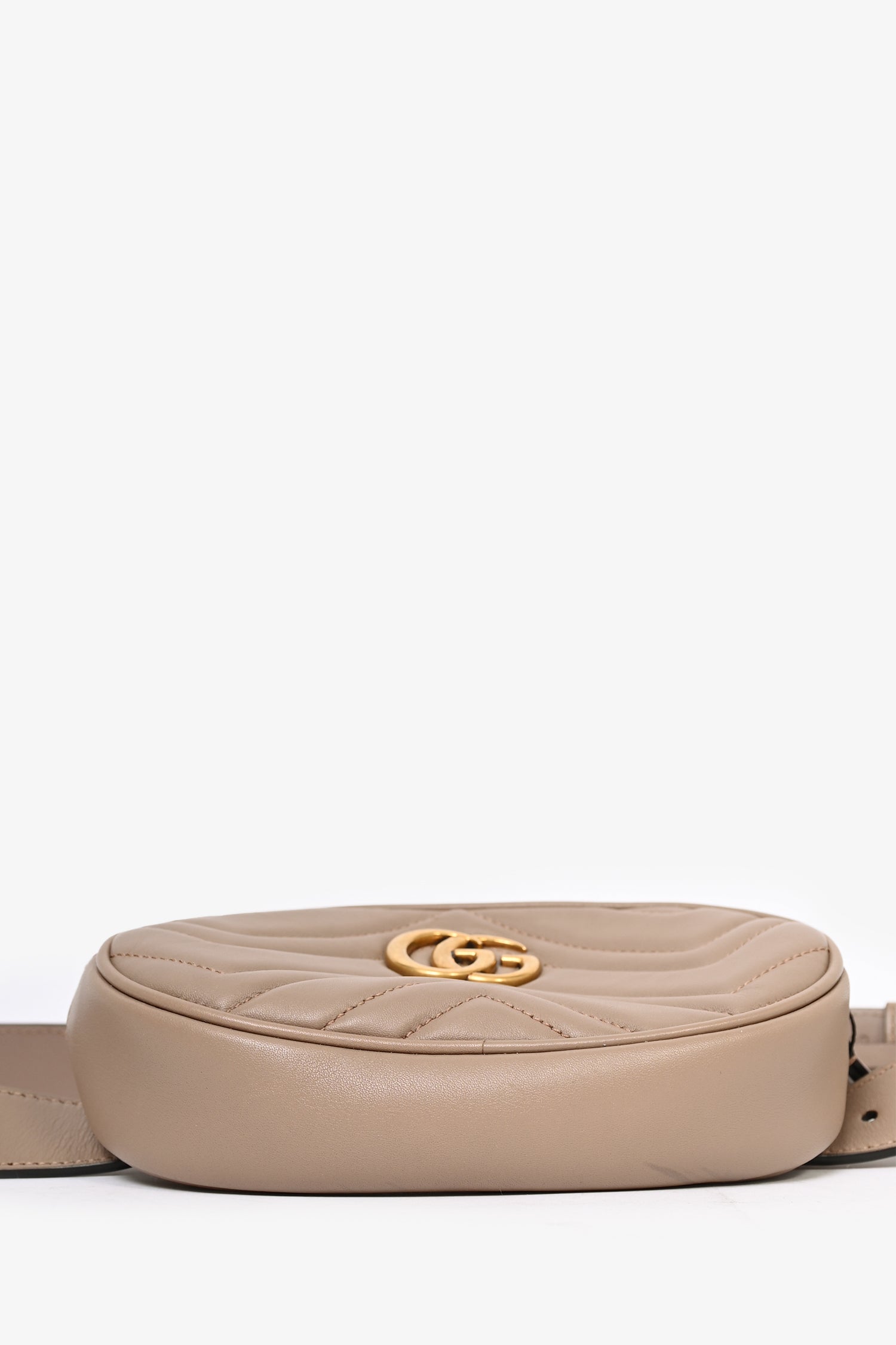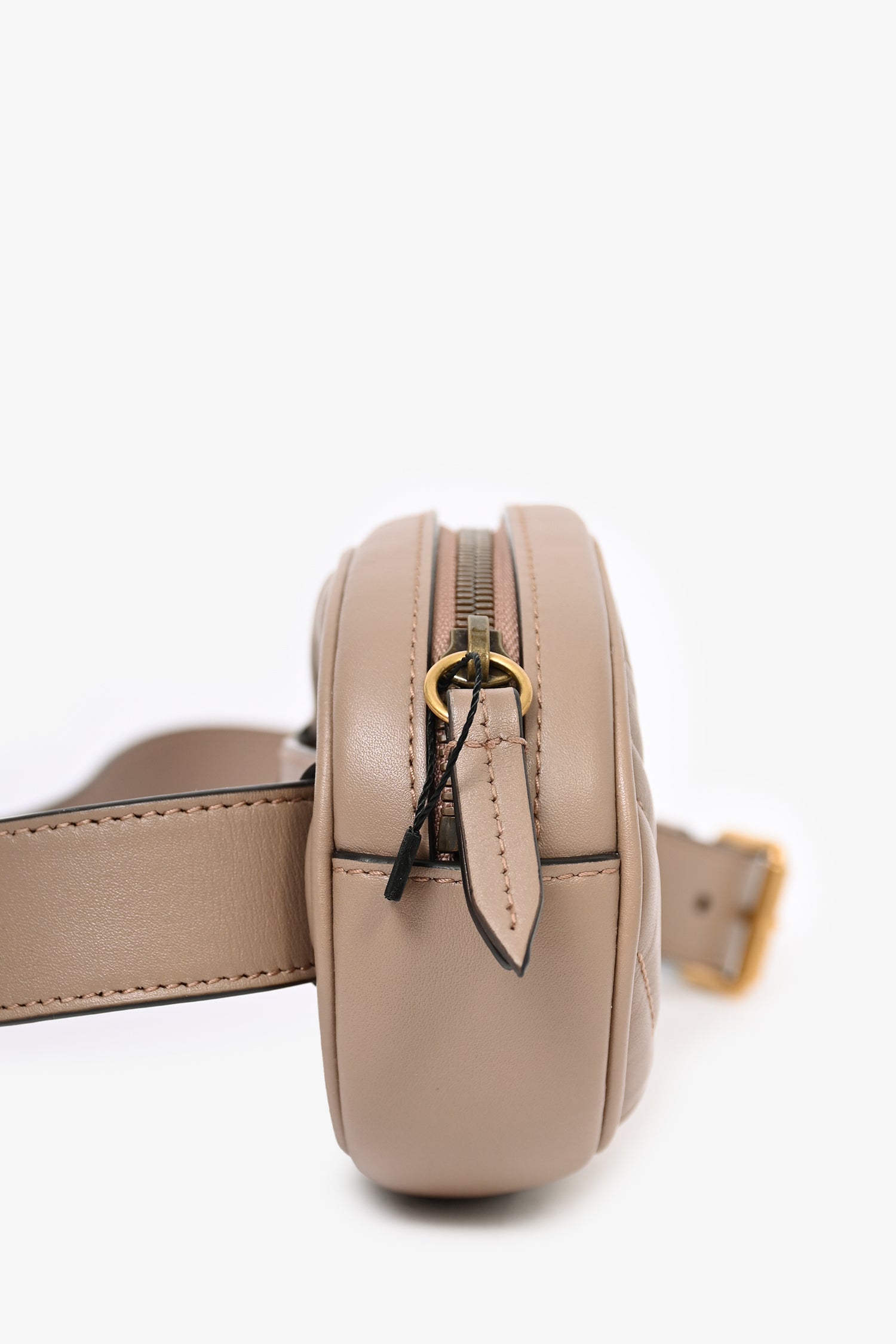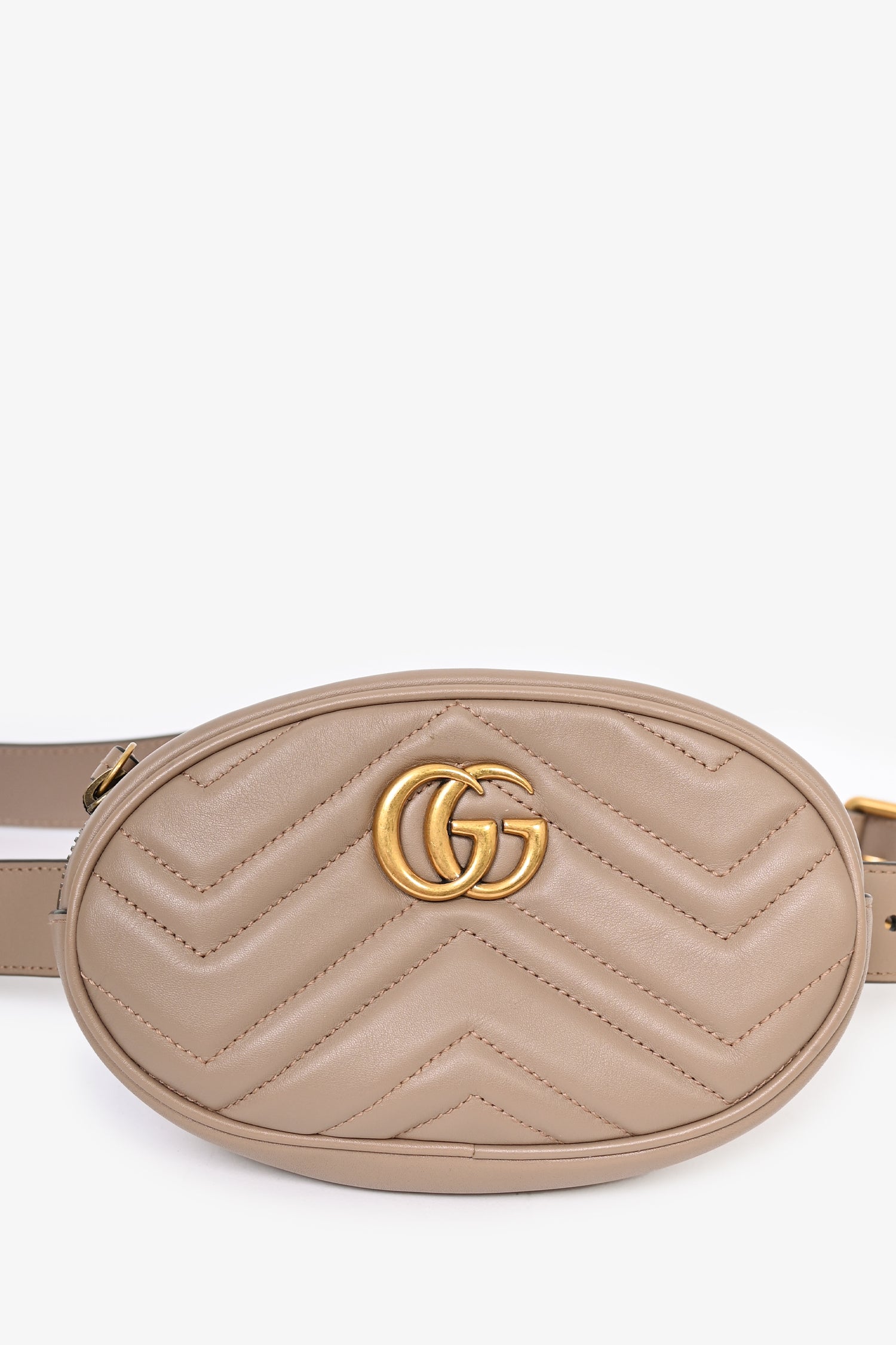 Refresh availabilityGucci Beige Leather 'GG' Marmont Matelassé Belt Bag. Tonal stitching. Antiqued gold-tone hardware. Leather trimming. Adjustable belt strap. Suede-lined interior. Single interior pocket.
