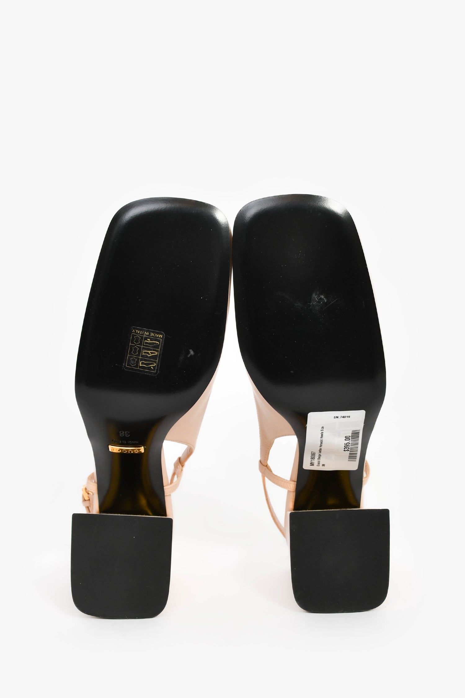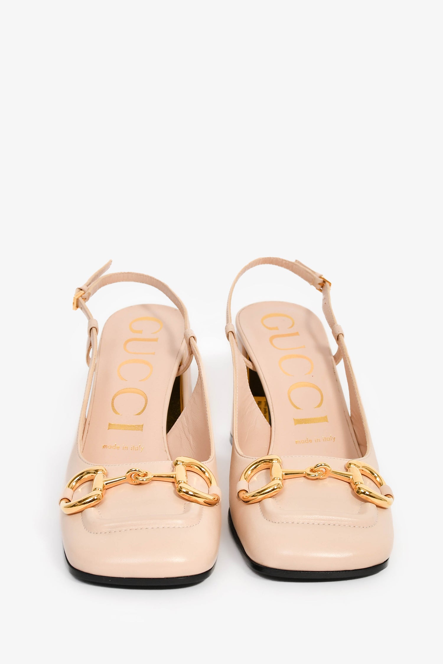 Refresh availabilityGucci Beige Leather Horsebit Heels. Slip-on. Square toe. Block heel. Leather insole. Gold-tone hardware. Tonal stitching.