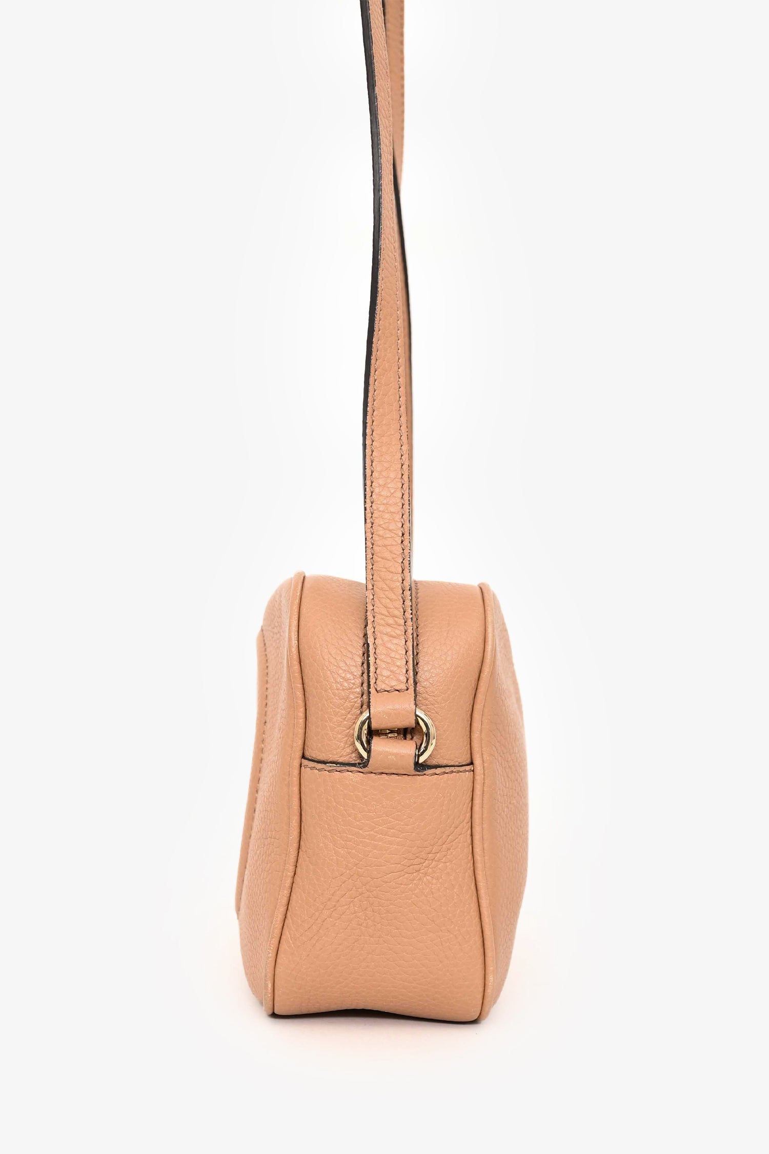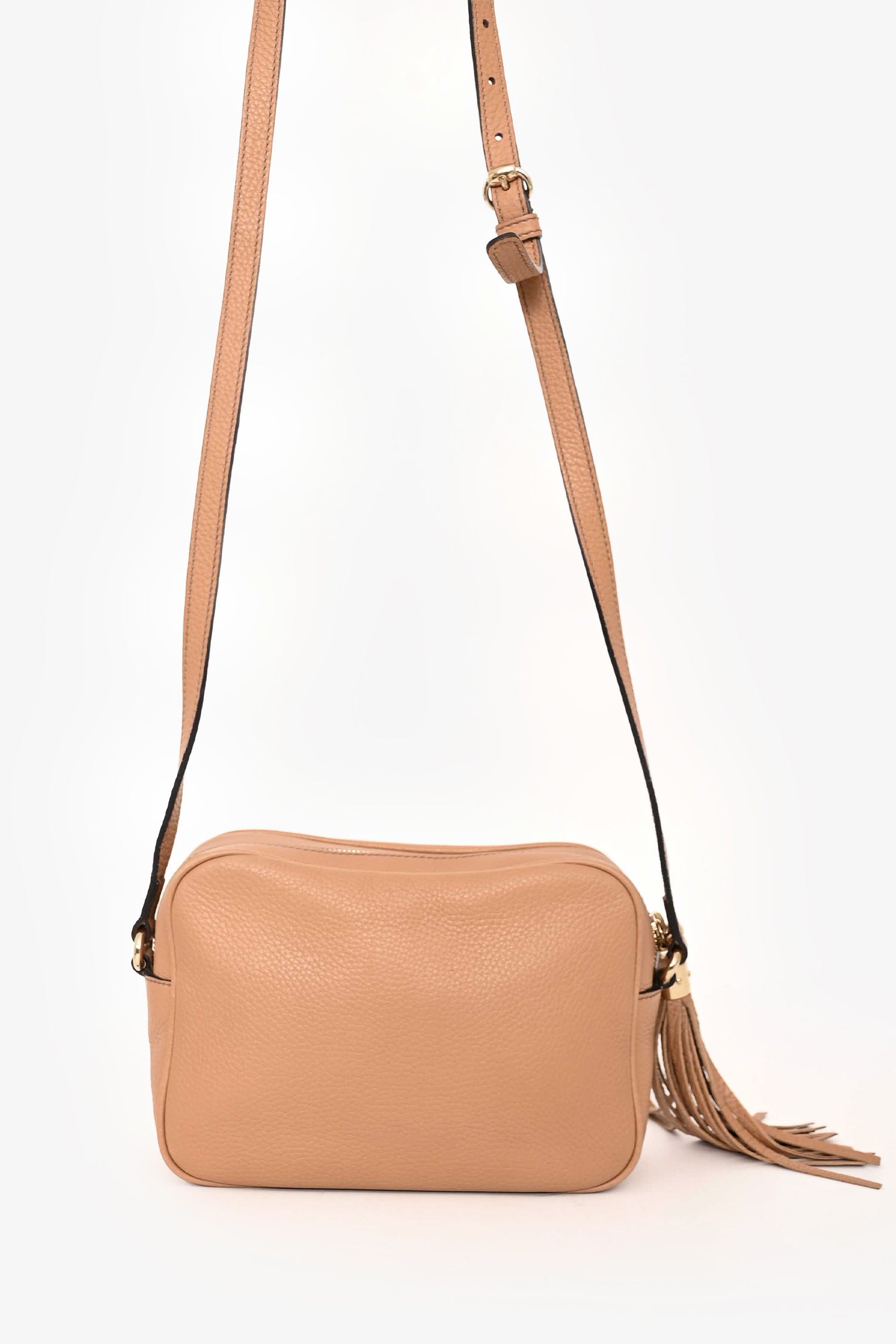 Refresh availabilityGucci Beige Leather Soho Crossbody Bag. Top zip closure with tassel pull. Adjustable leather shoulder strap. 2 interior slip pockets. Gold-tone hardware. Tonal stitching.