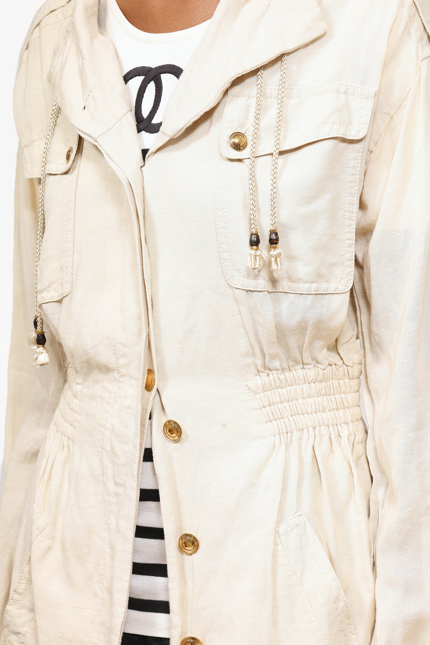 Refresh availabilityGucci Beige Linen Utility Light Jacket. Front button up closure. Cinched neckline with ties. 2 front pockets with fold over flap and button up closure. 2 front slip pockets. Cinched waist. Side slits on either side with button up closure. Gold-tone hardware. Tonal stitching. Unlined.