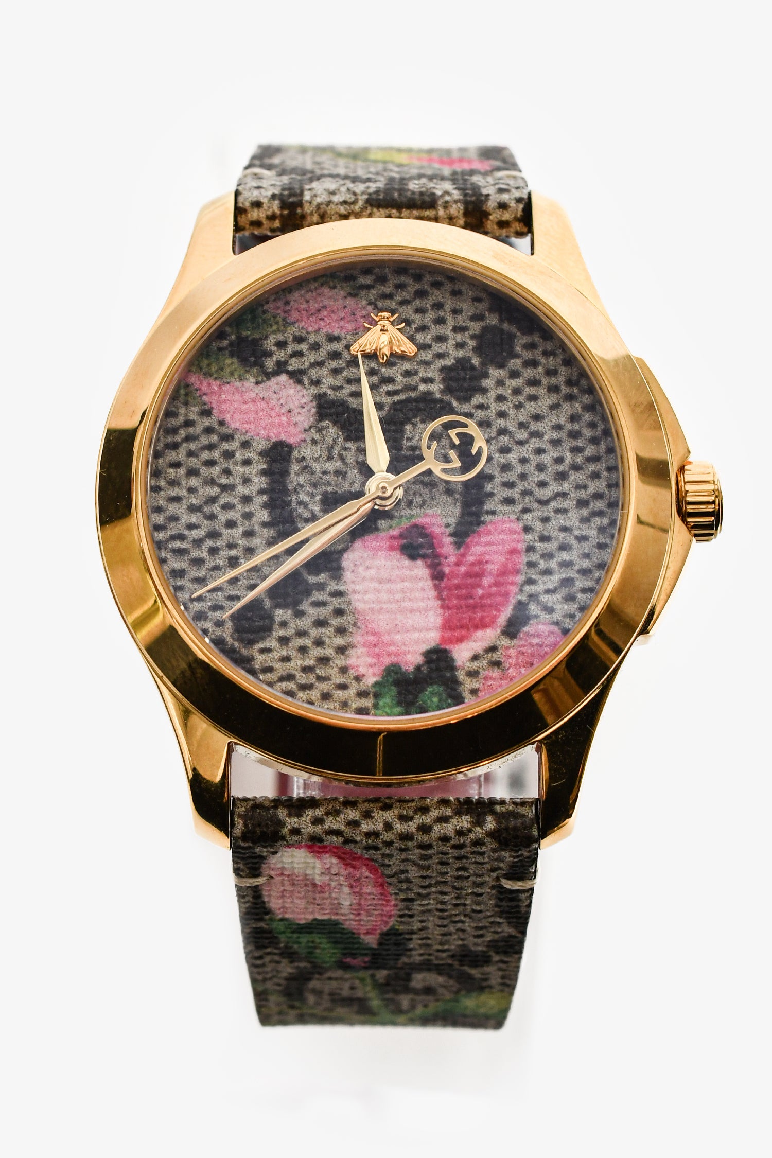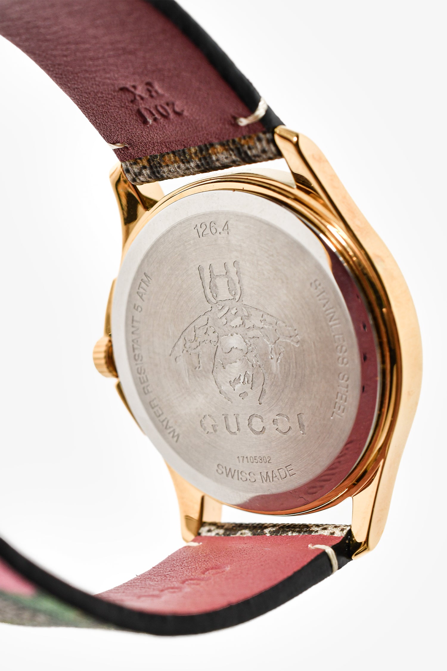 Refresh availabilityGucci Beige Multicolour G-Timeless Watch. Pin buckle closure. Gold-tone hardware. Stainless Steel. Adjustable leather straps. Tonal stitching.