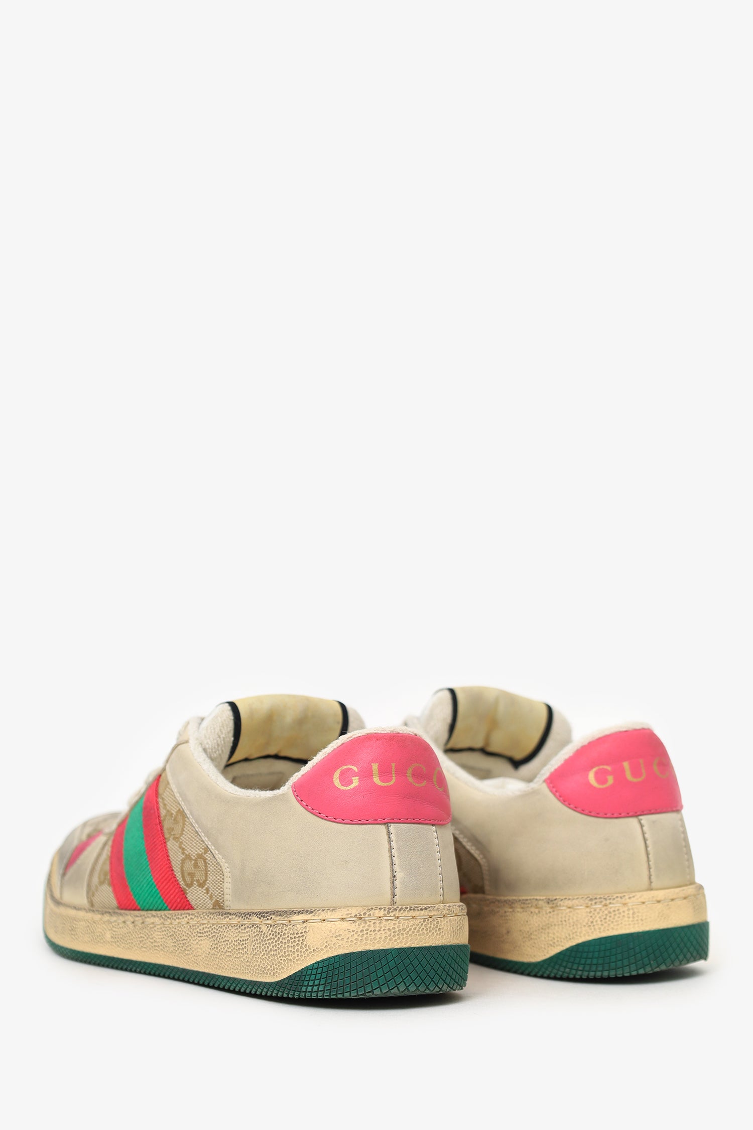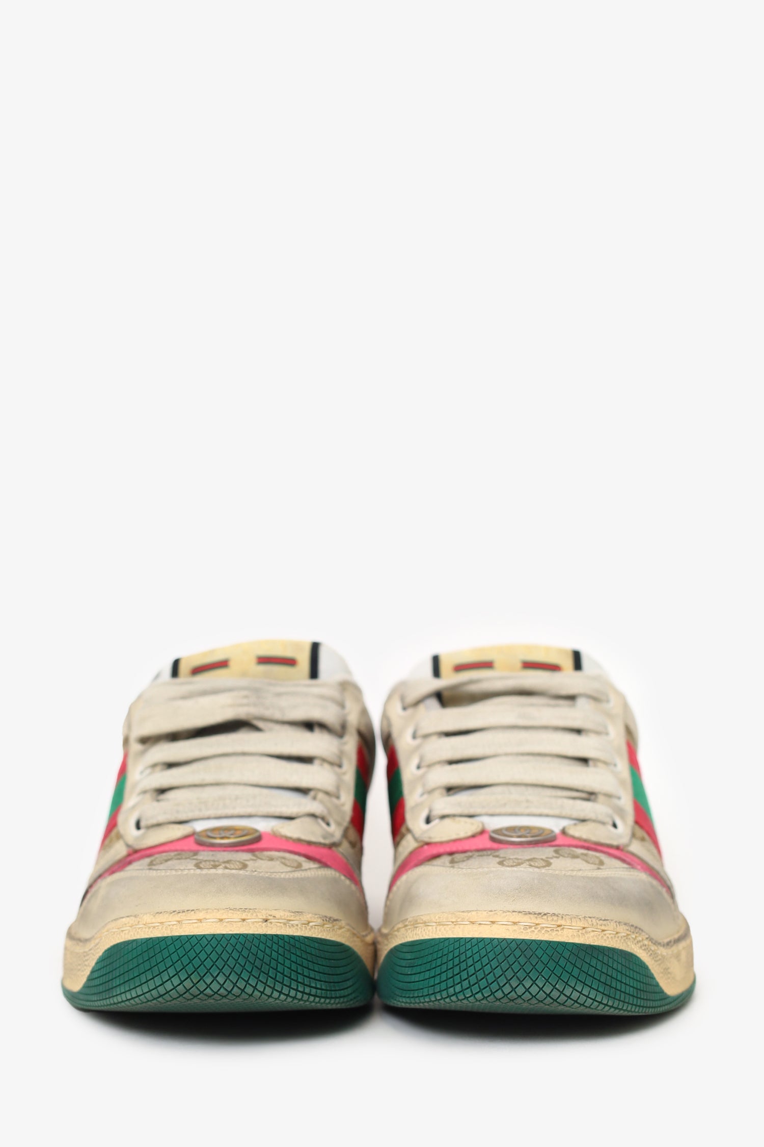 Refresh availabilityGucci Beige/Pink Screener Distressed Sneakers. Slip-on. Lace up closure. Round toe. Tonal stitching.