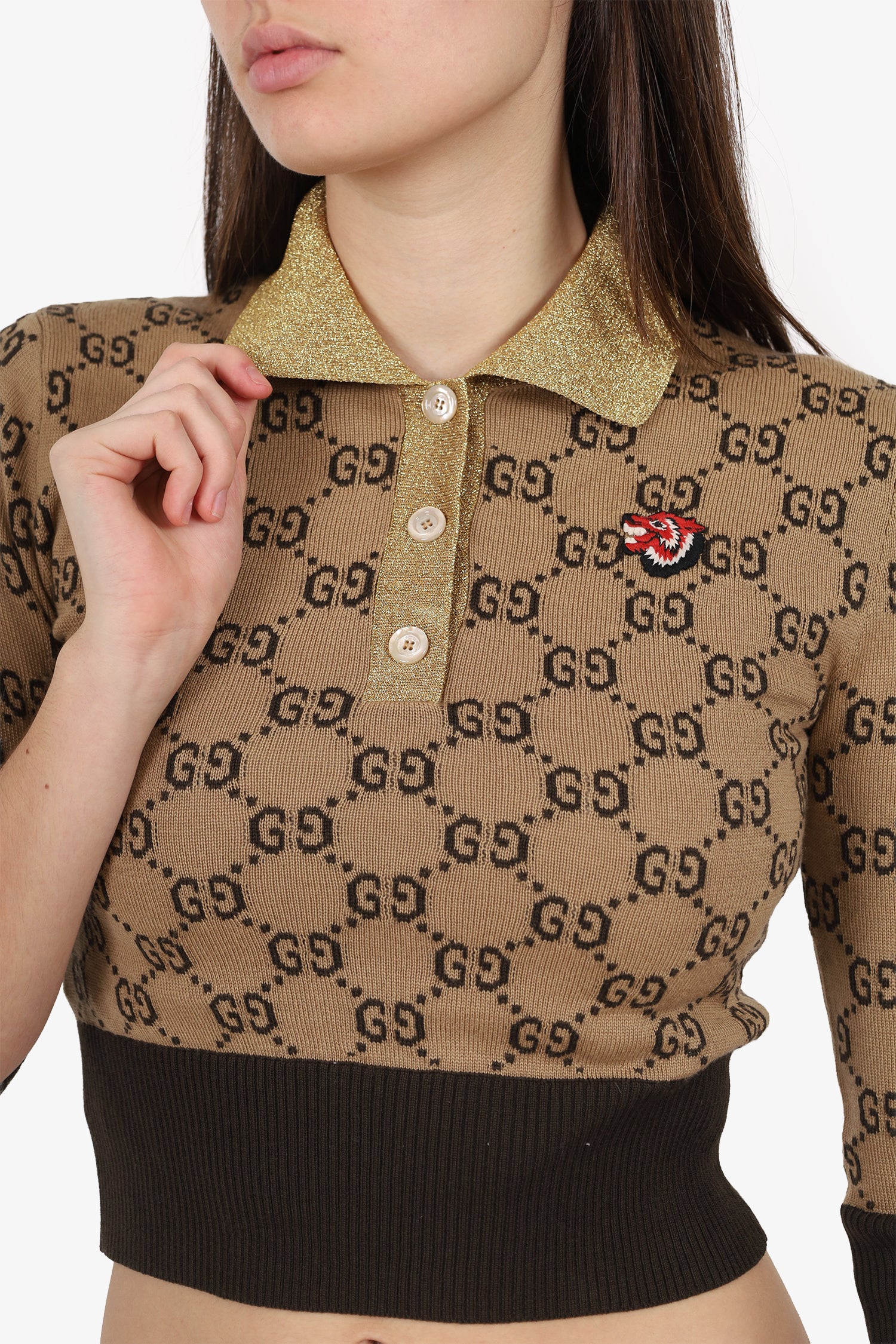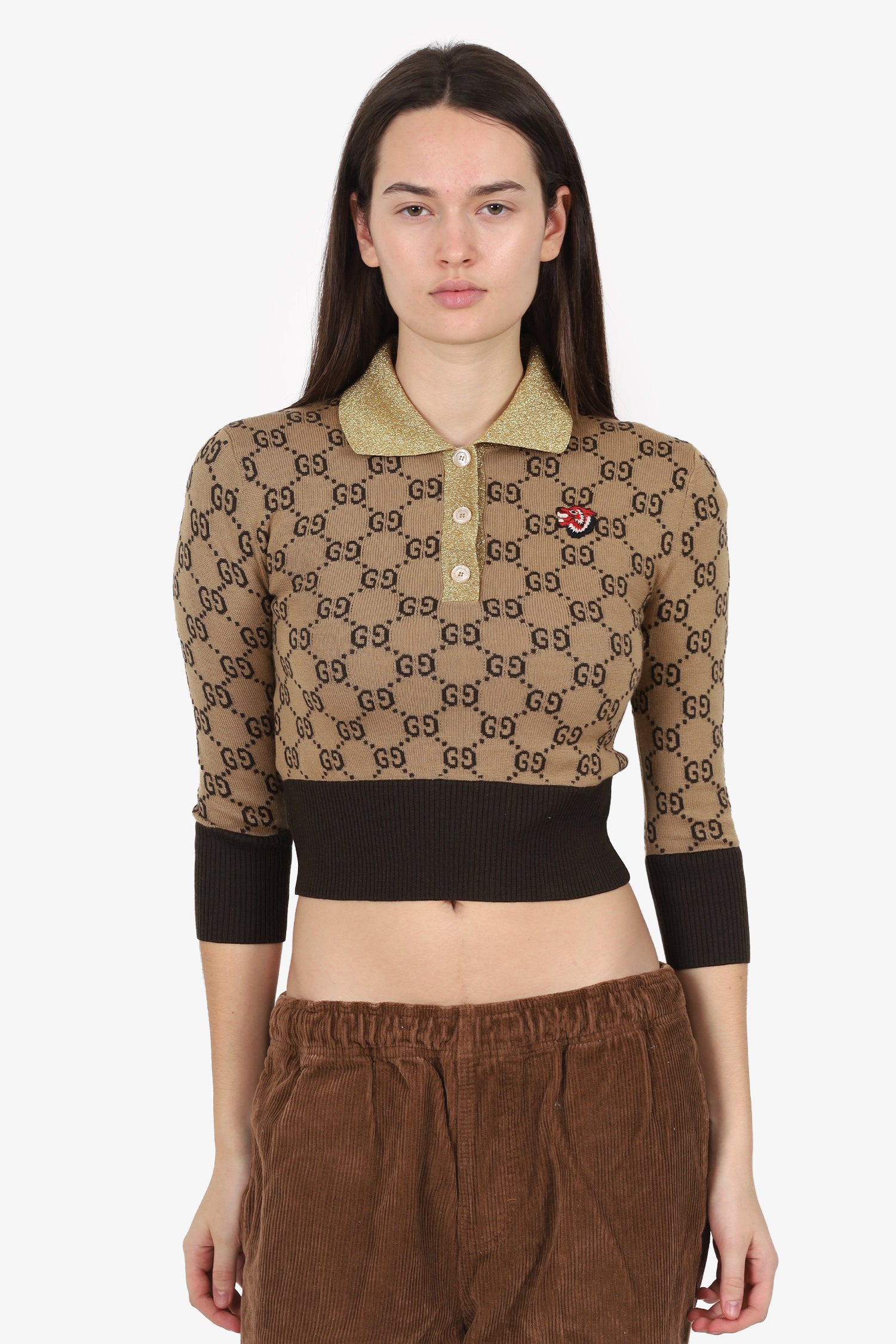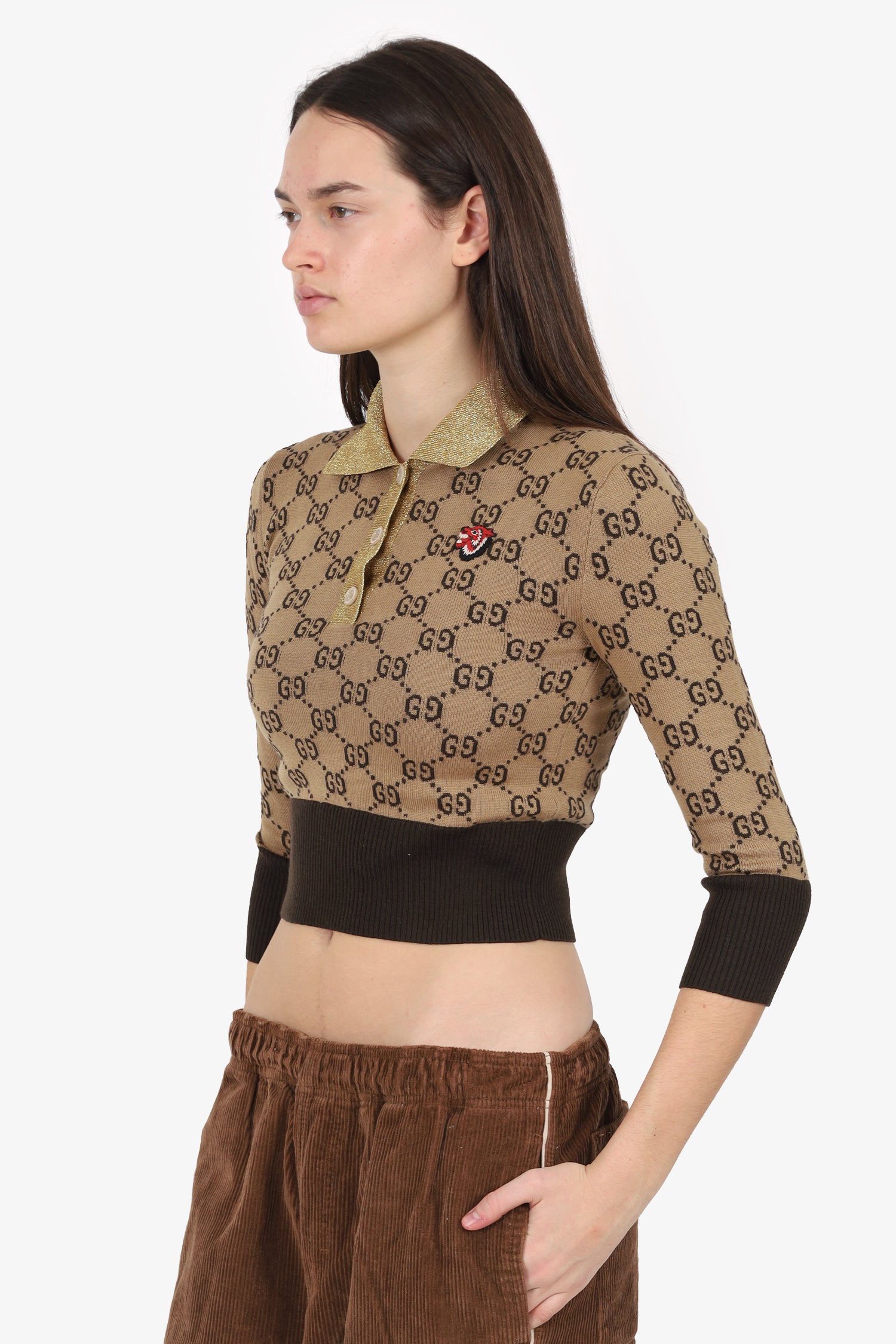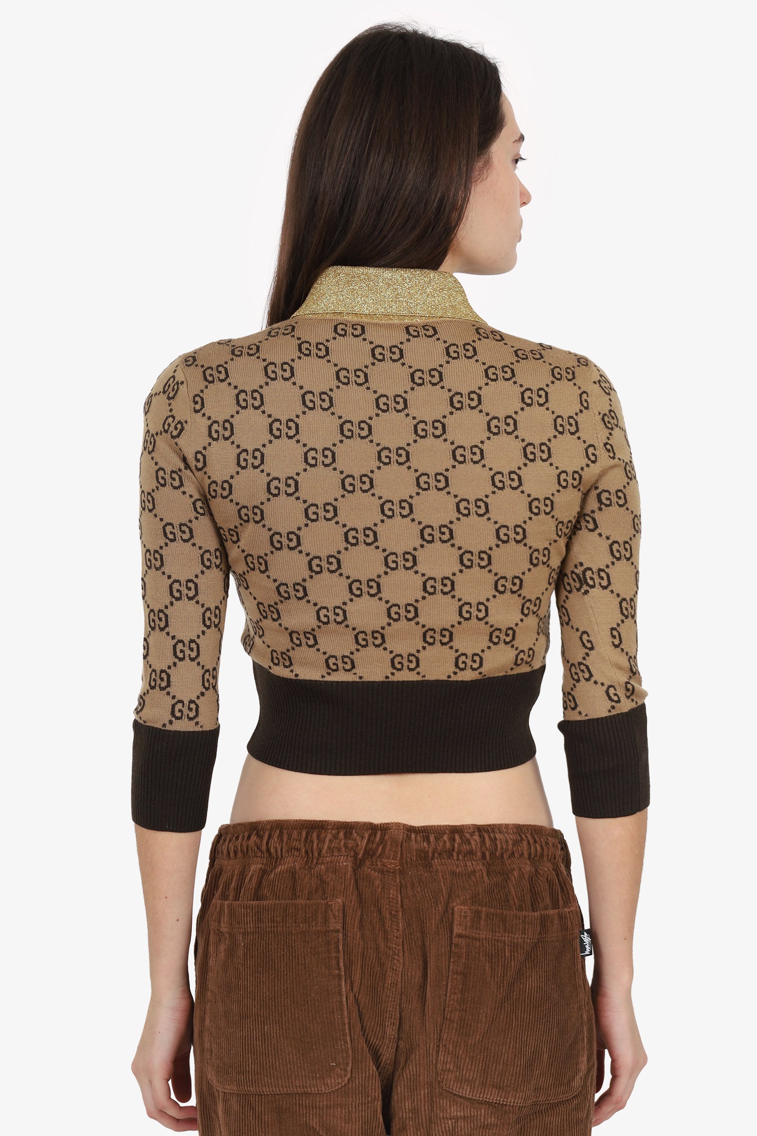 Refresh availabilityGucci Beige/Gold Metallic Knit 'GG' Quarter-length Sleeve Top. Pull-on. Collared-neckline. Front button-up closure. Ribbed sleeve cuffs and bottom hem. Tonal stitching.