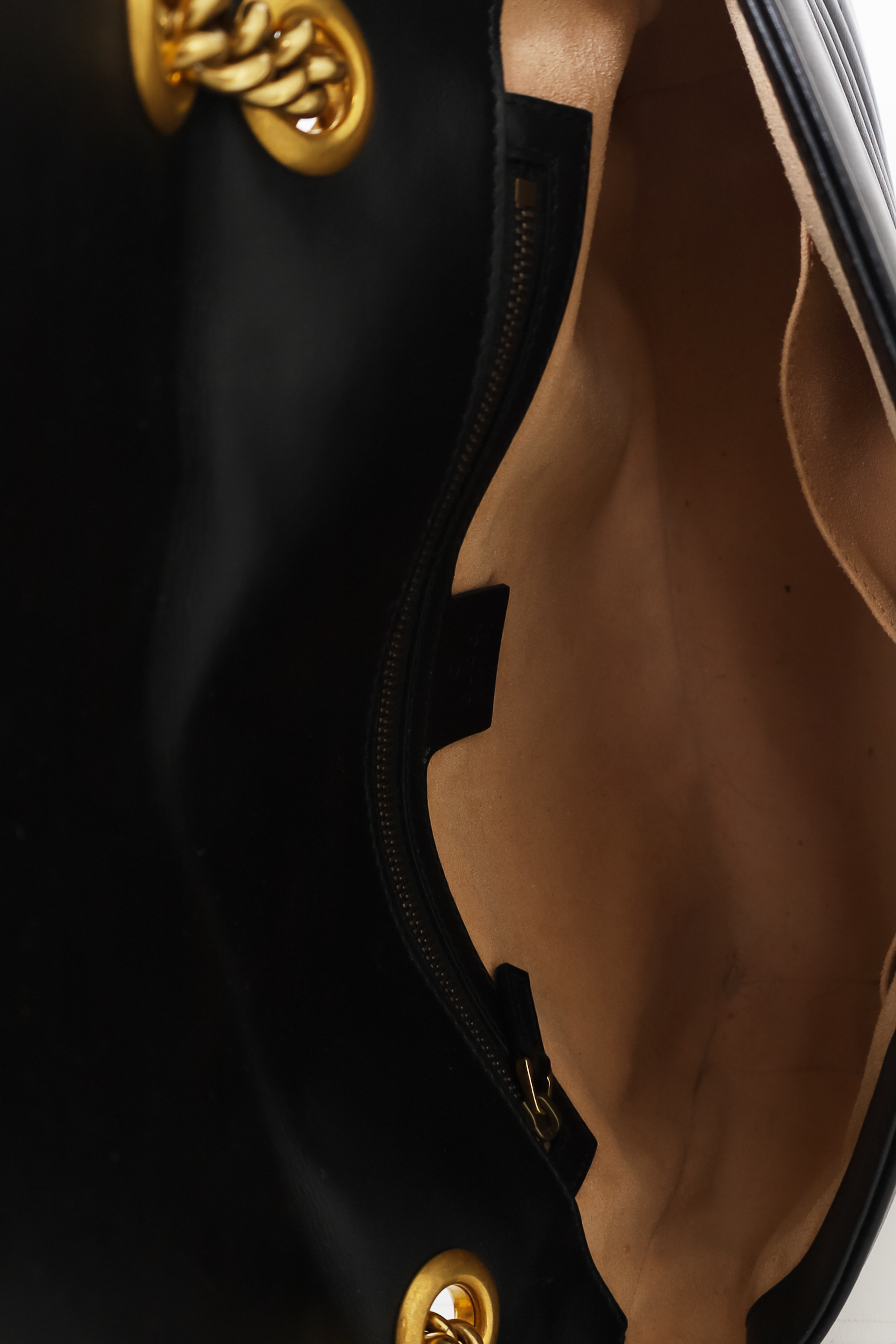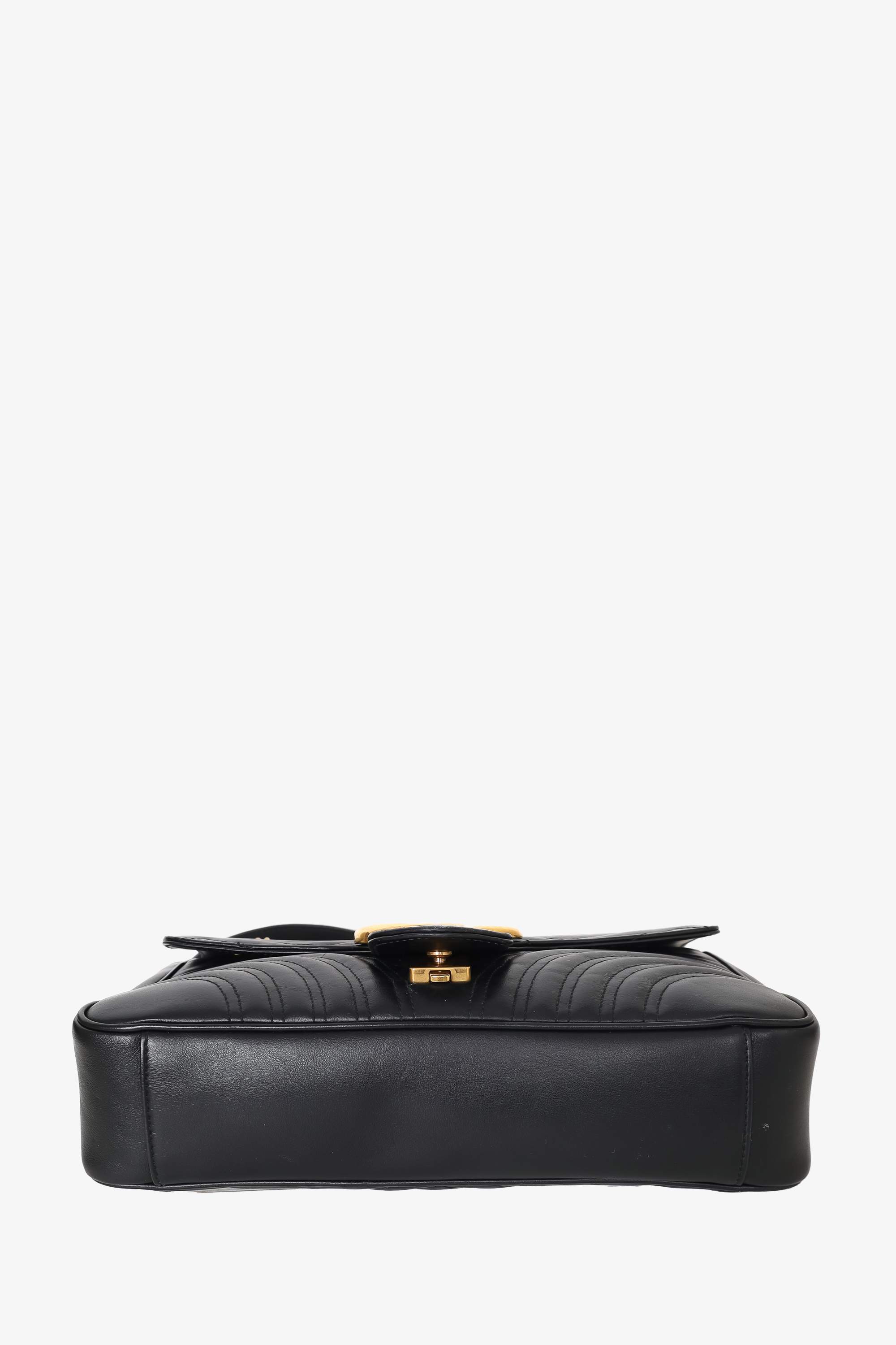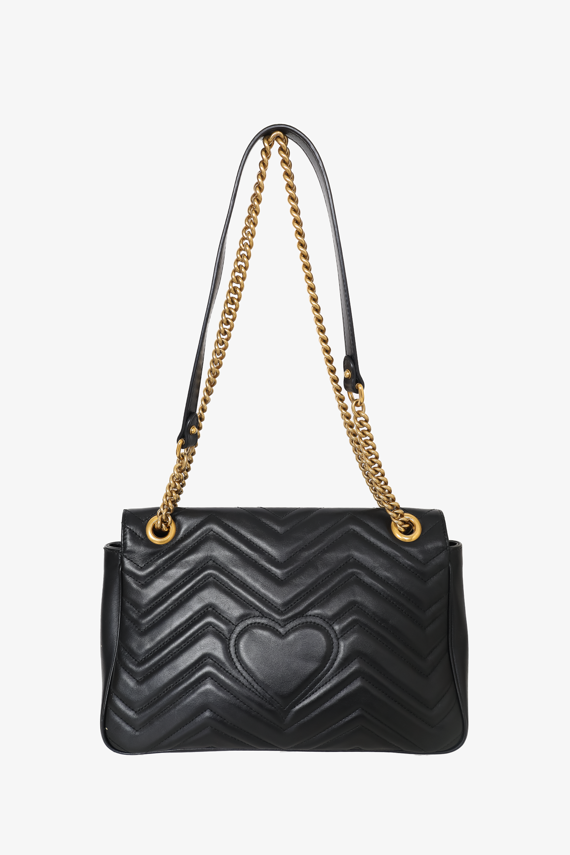 Refresh availabilityGucci Black Calfskin Matelasse Medium GG Marmont Shoulder Bag. Push-lock closure. 2 interior pockets; 1 with zipper closure, 1 with slip. Slide-around chain. Gold-toned hardware. Tonal stitching.