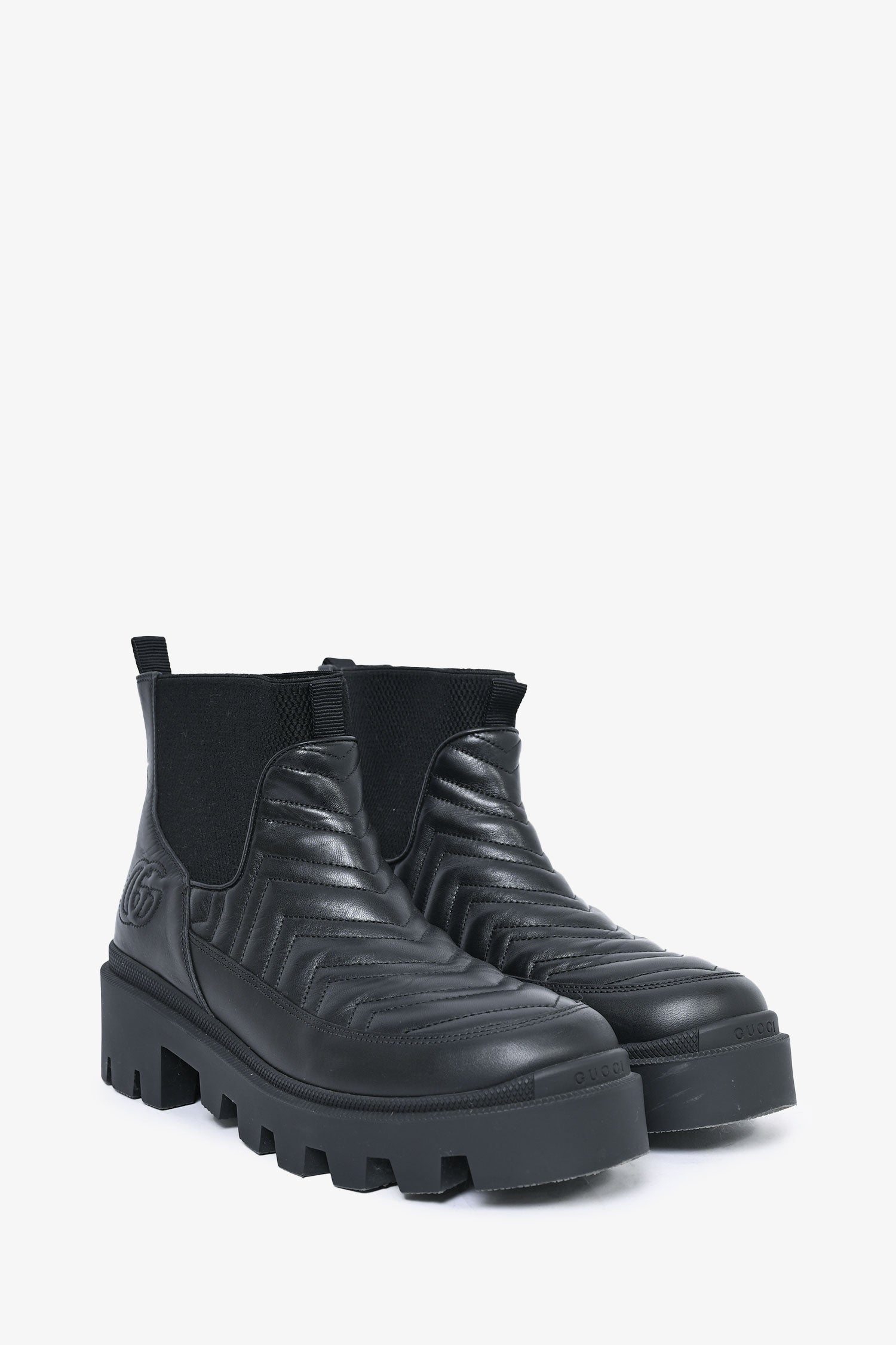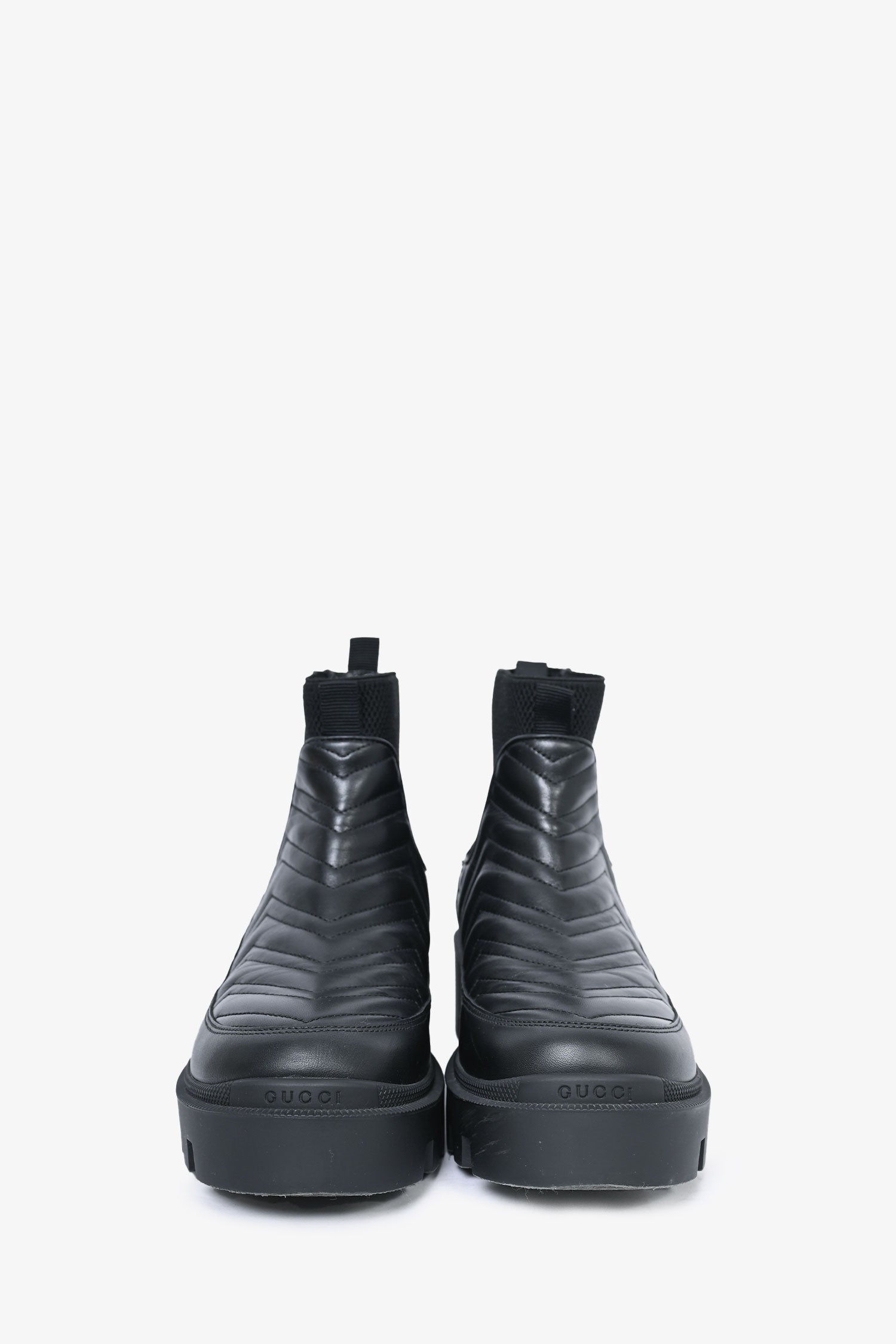 Refresh availabilityGucci Black Chevron Leather 'Kingsnake' Chelsea Boots. Mens. Quilted leather. Elastic around the ankle. Platform style. Snake detailing on the sole. Tonal stitching.