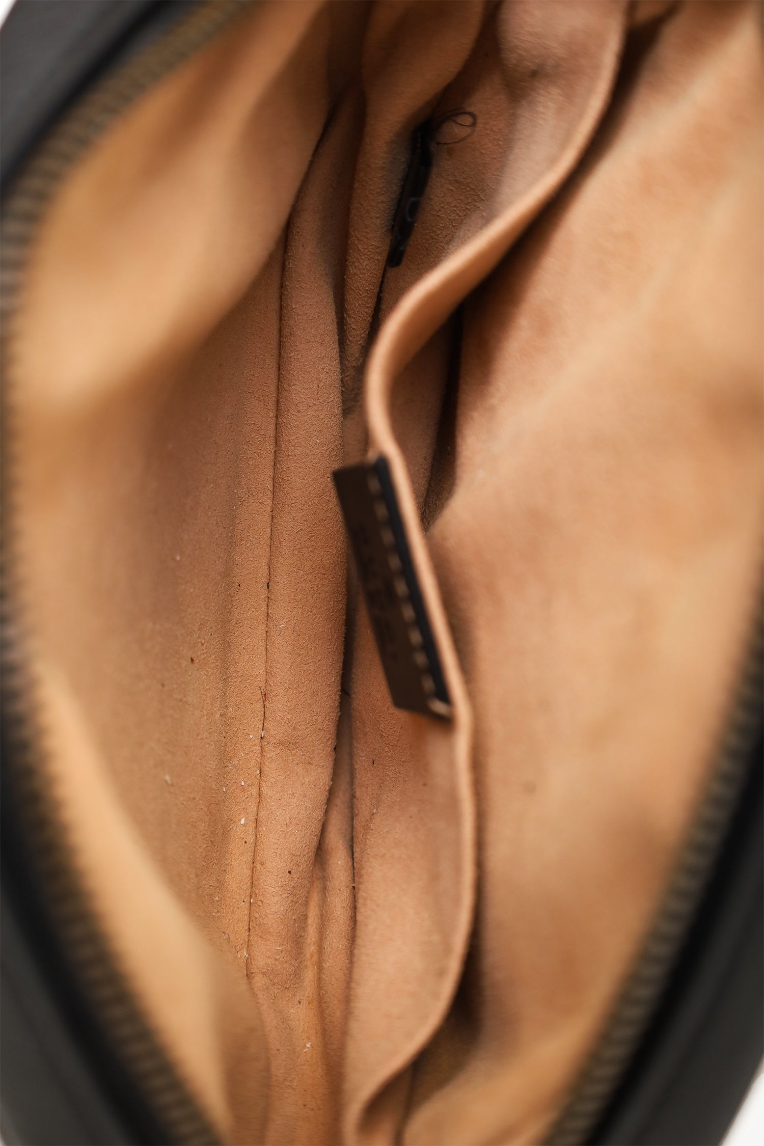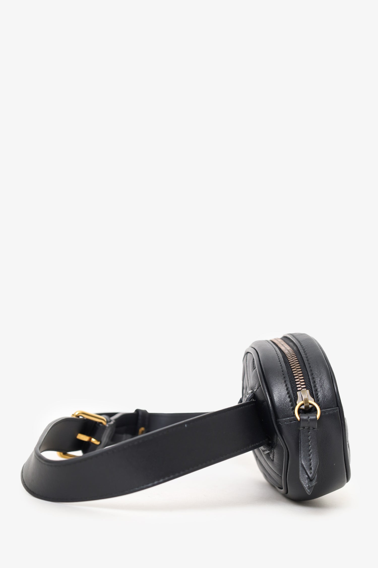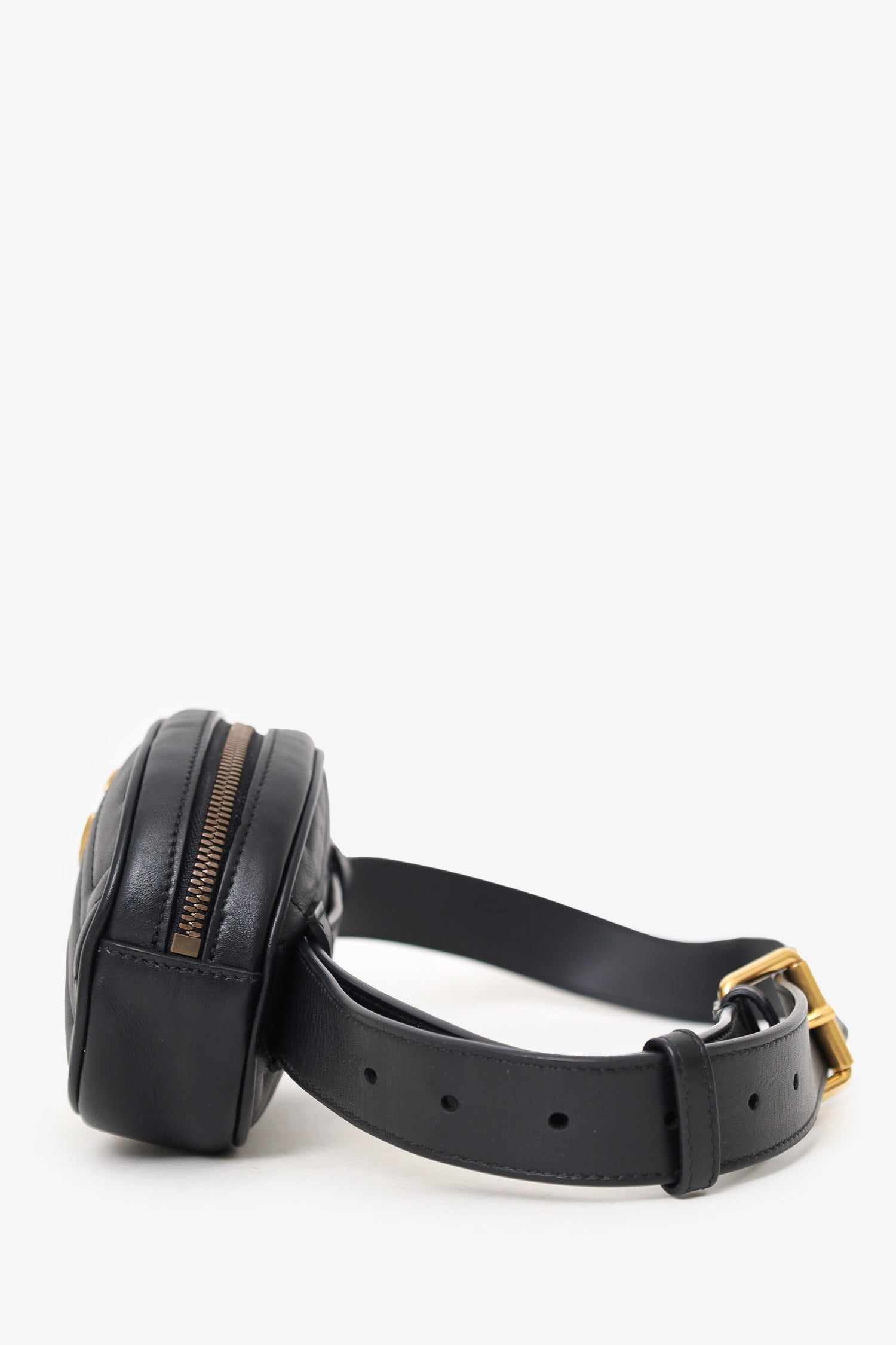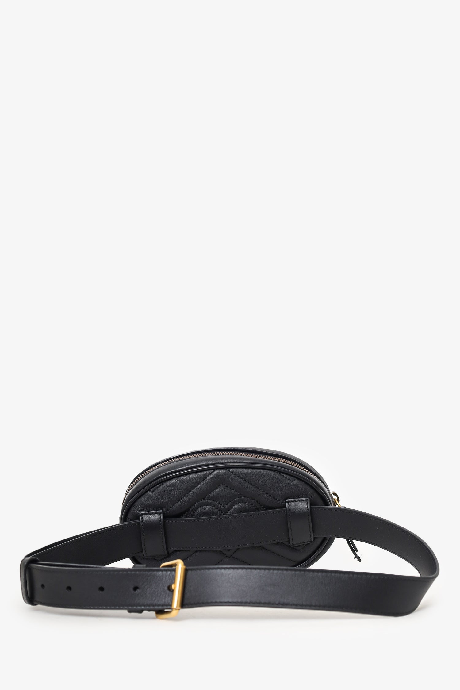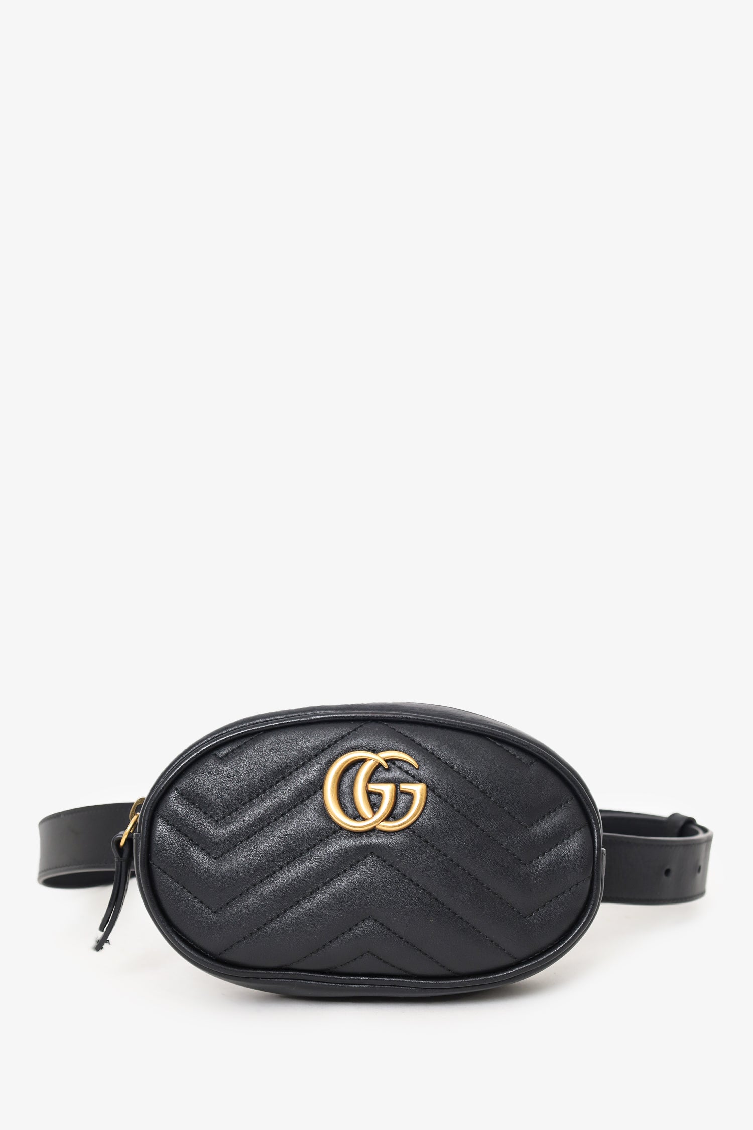 Refresh availabilityGucci Black Chevron Leather Marmont Belt Bag. Top zip closure. Open interior suede interior. Single interior wall slip pocket. Adjustable strap with pull-through buckle closure. Gold-tone hardware. Tonal stitching.
