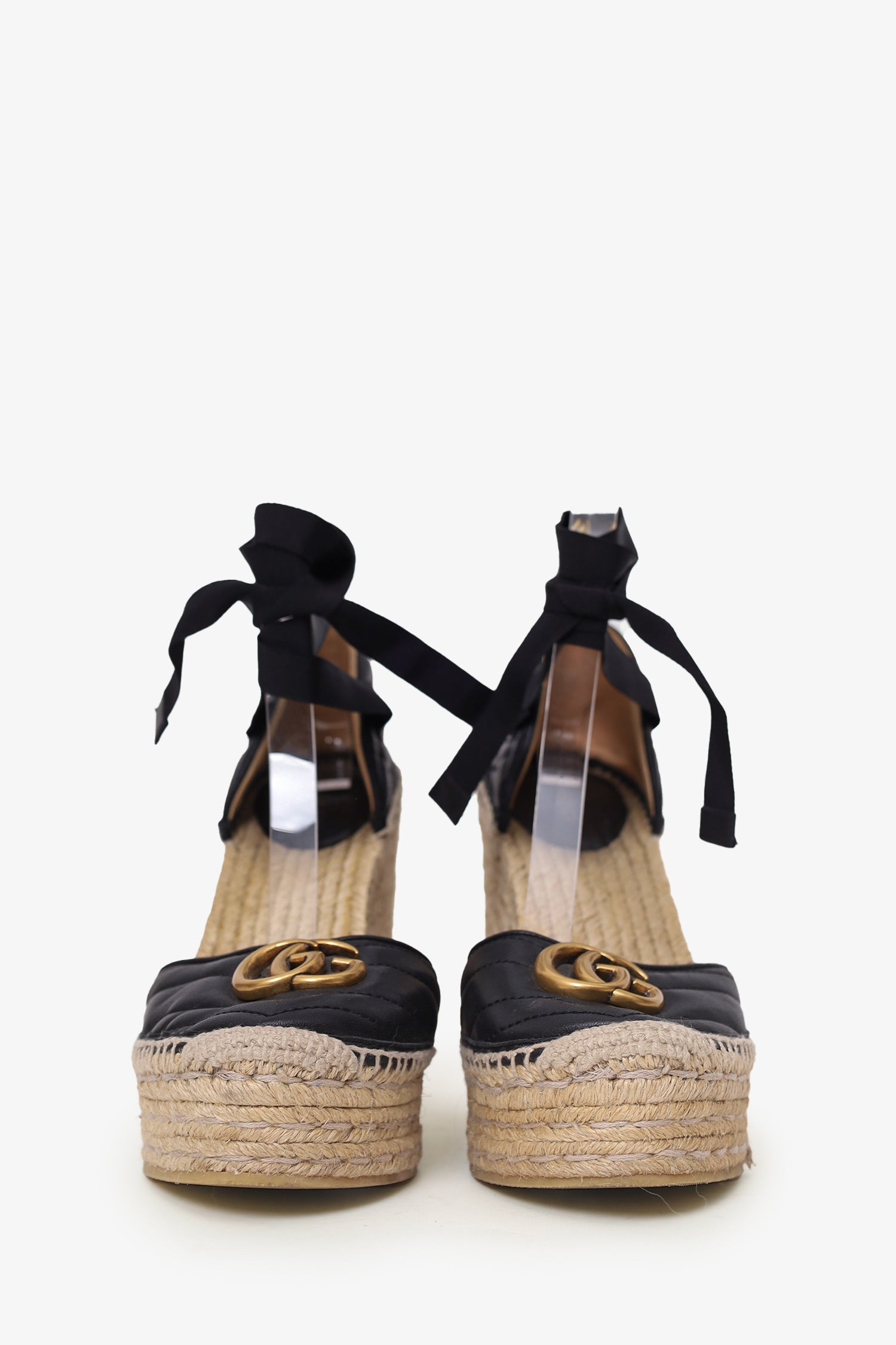 Refresh availabilityGucci Black Chevron Leather Marmont Espadrille Wedges. Slip-on. Tie closure. Rounded point-toe. Tonal and contrast stitching. Gold-tone hardware.