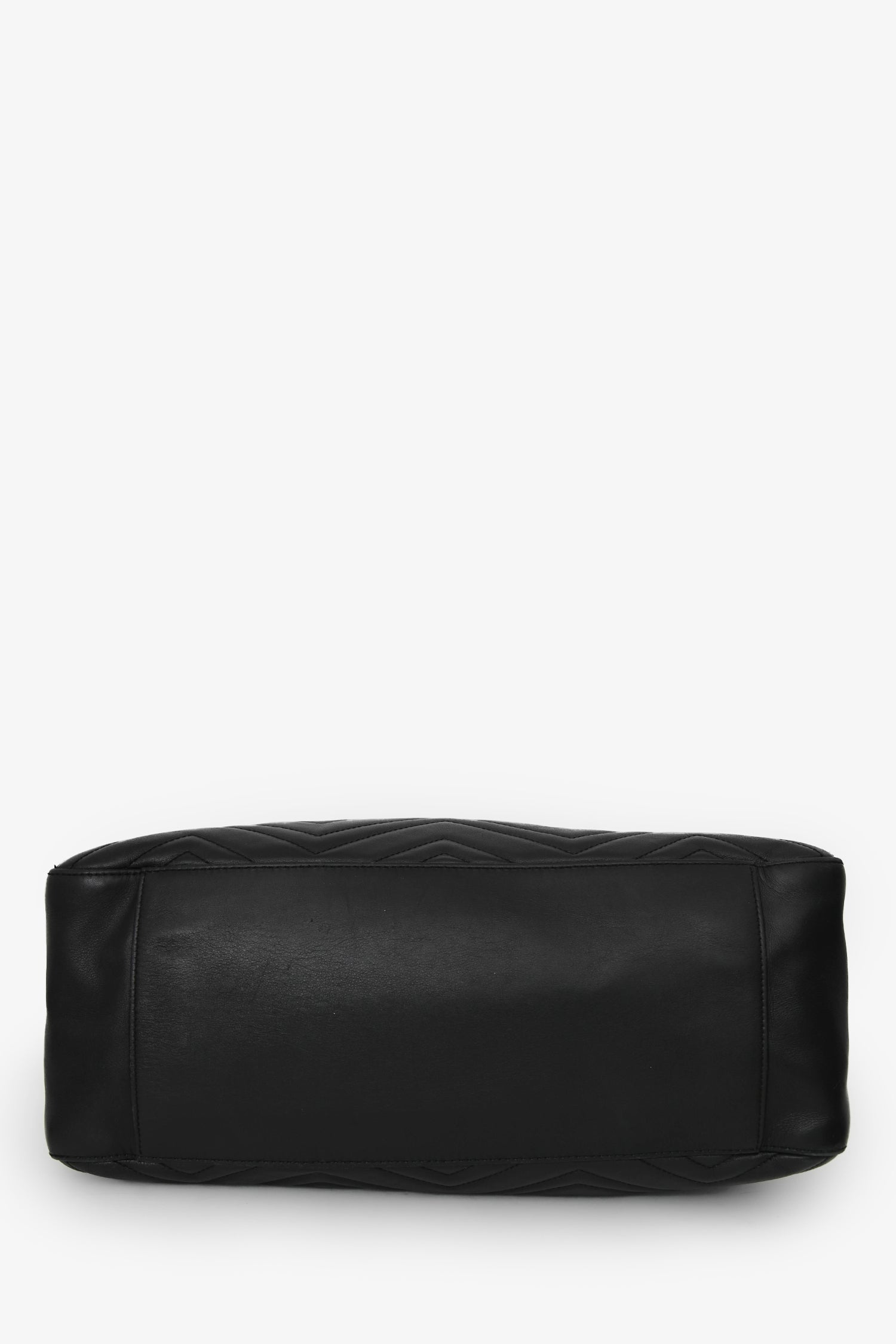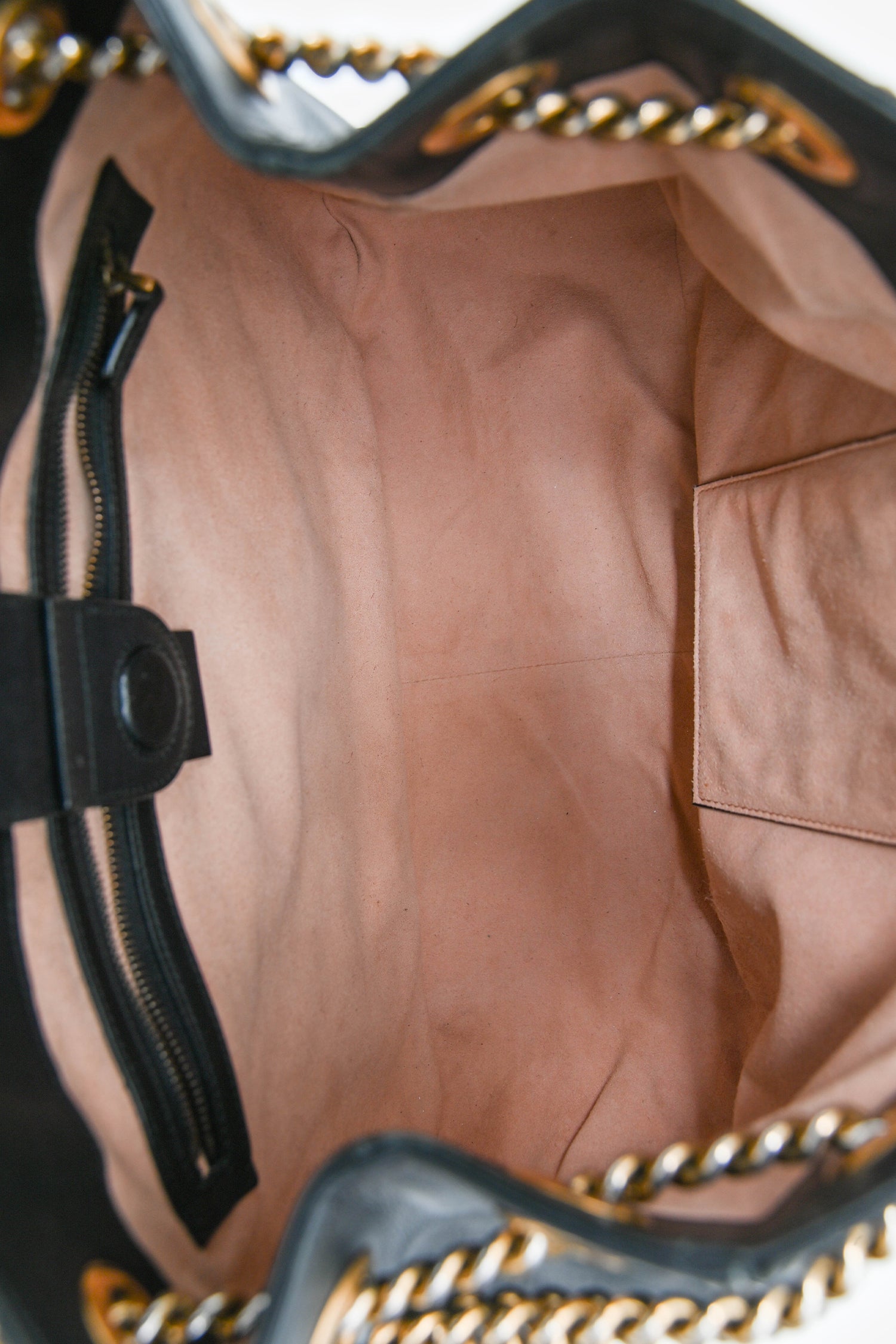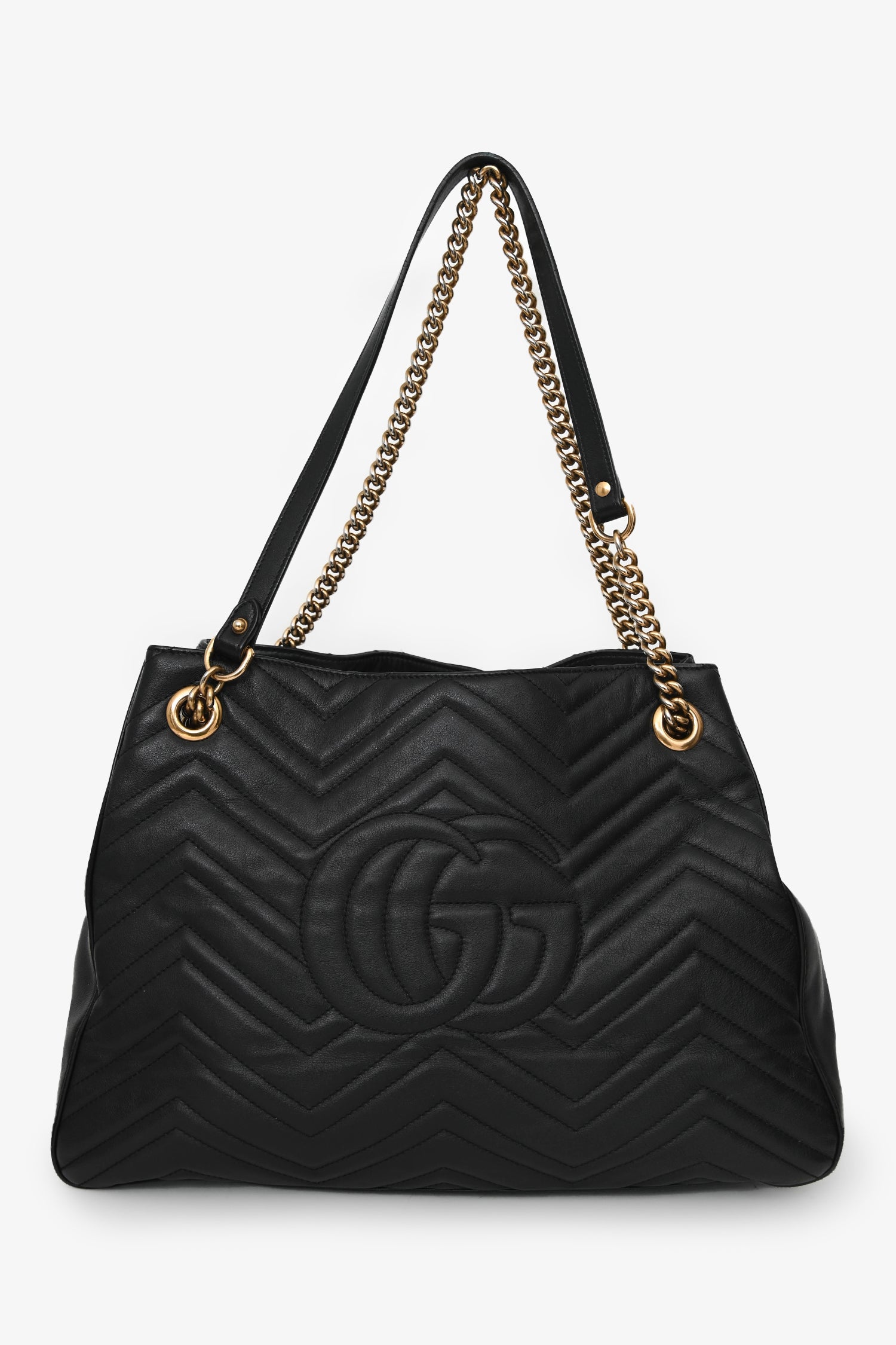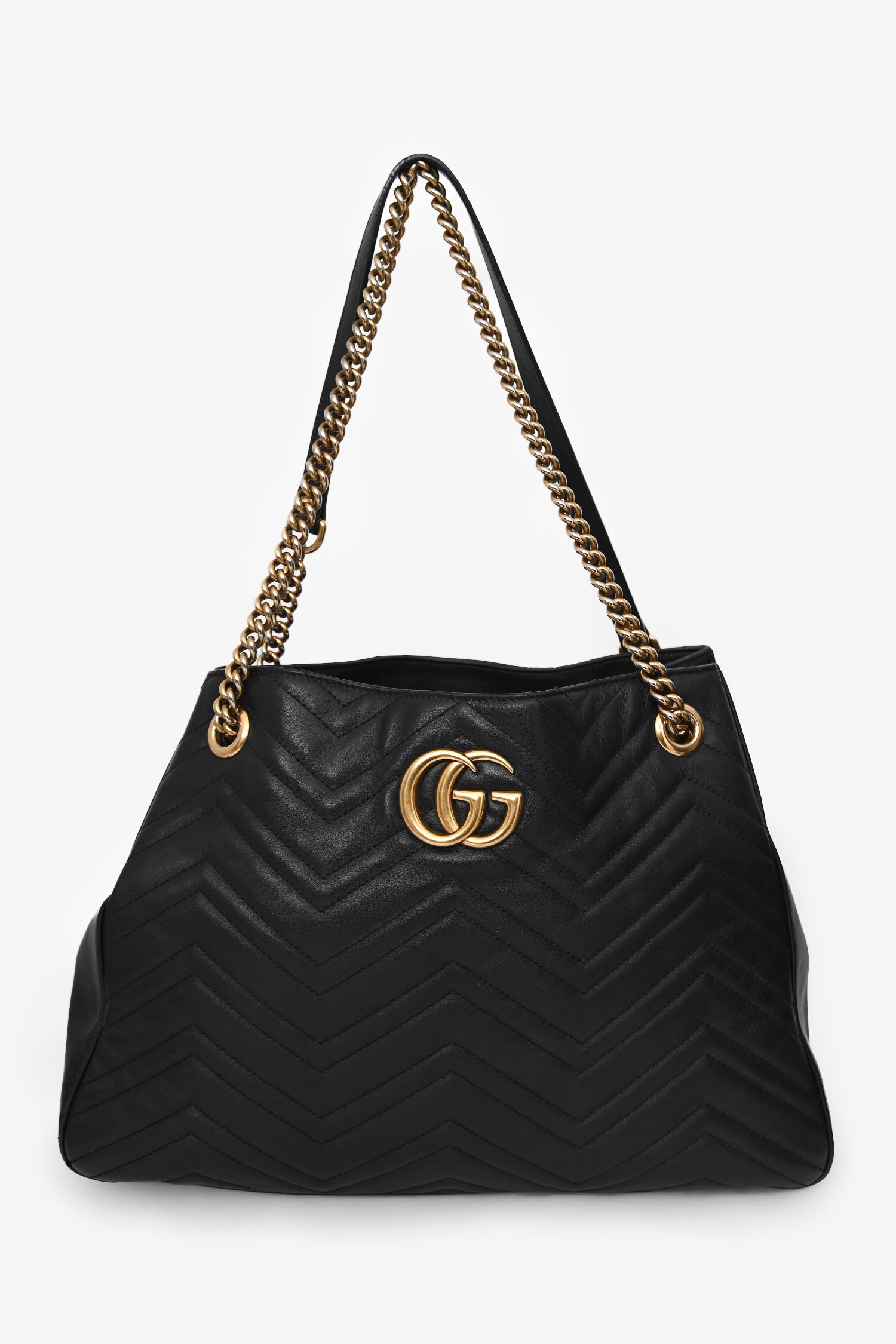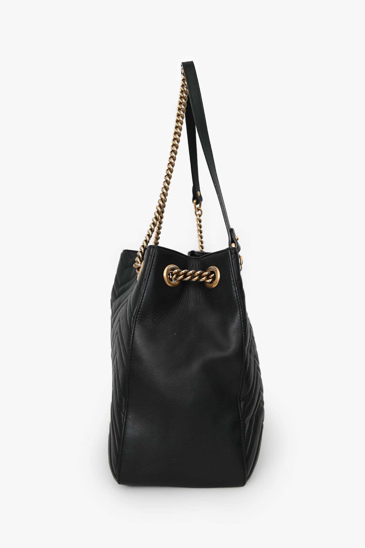 Refresh availabilityGucci Black Chevron Leather Marmont Tote Bag. Open interior with a concealed magnetic strap. Chain-link shoulder straps. Lined suede interior with 1 zip and 2 card slots. Gold-tone hardware. Tonal stitching.