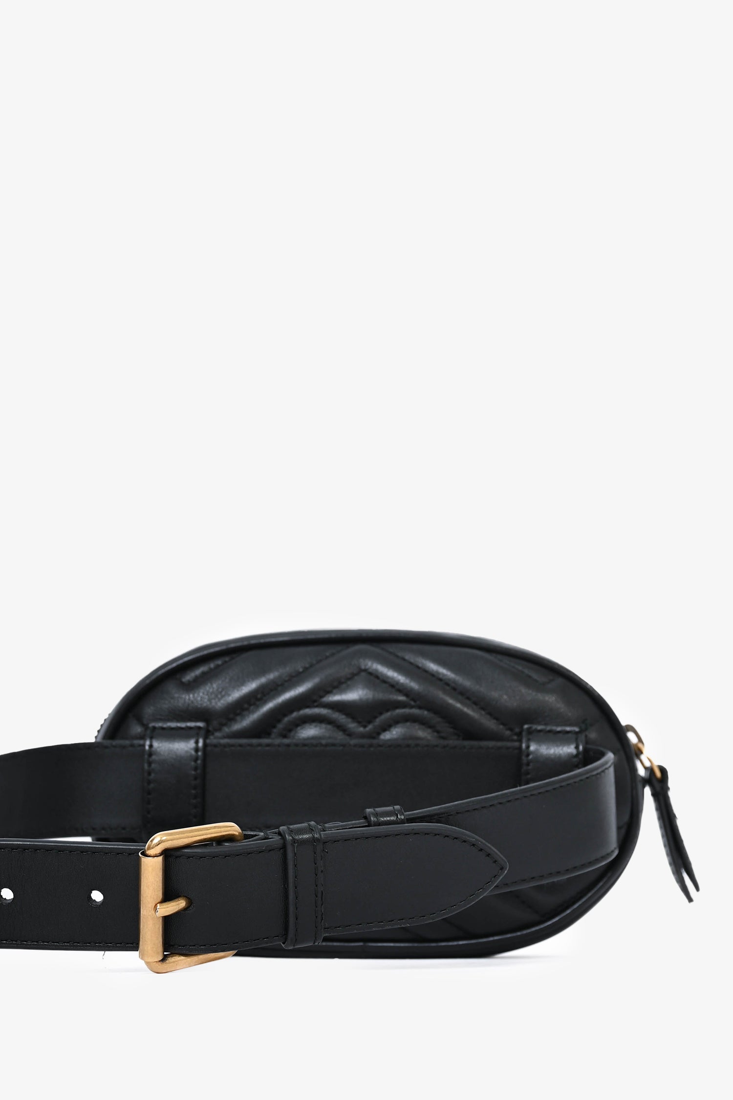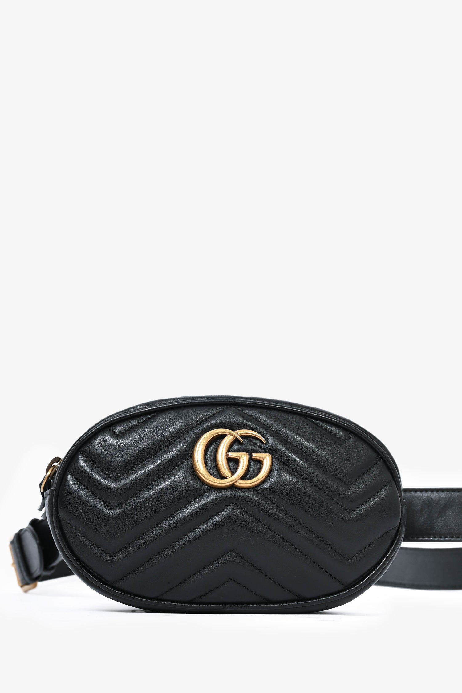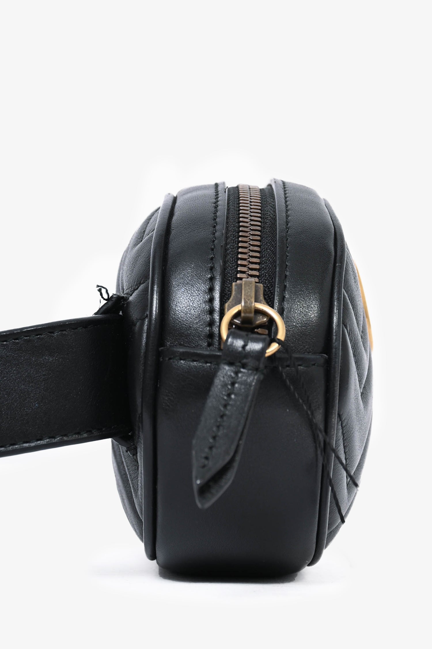 Refresh availabilityGucci Black Chevron Leather Marmont Belt Bag. Tonal stitching. Antiqued gold-toned hardware. Suede lined interior with single compartment. Top zipper. Adjustable belt strap.