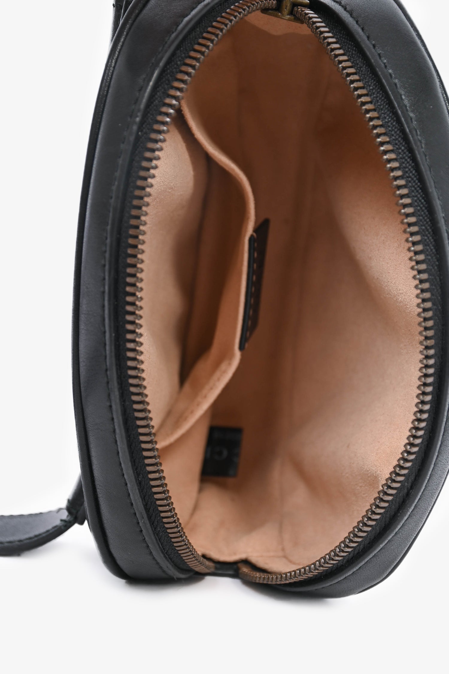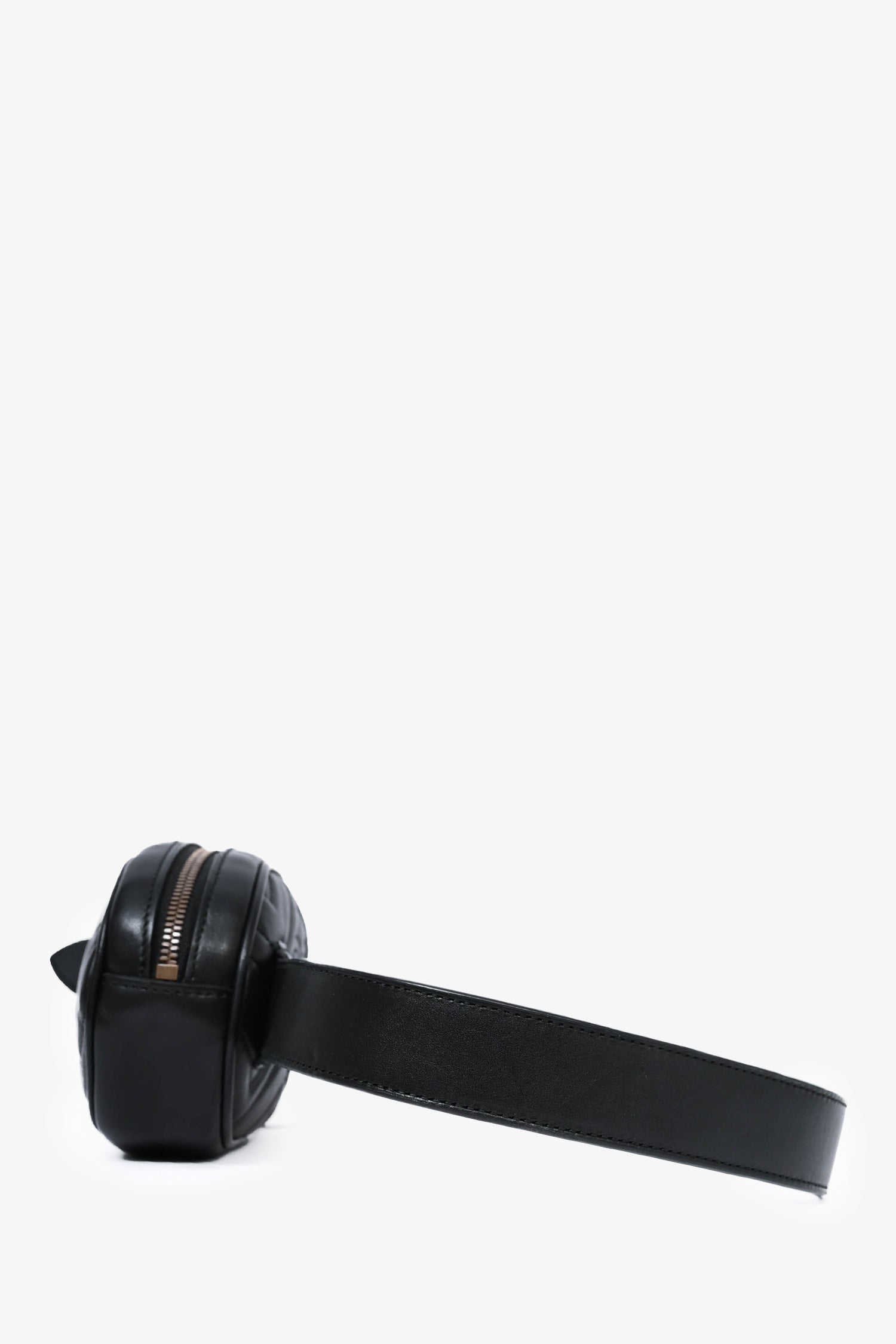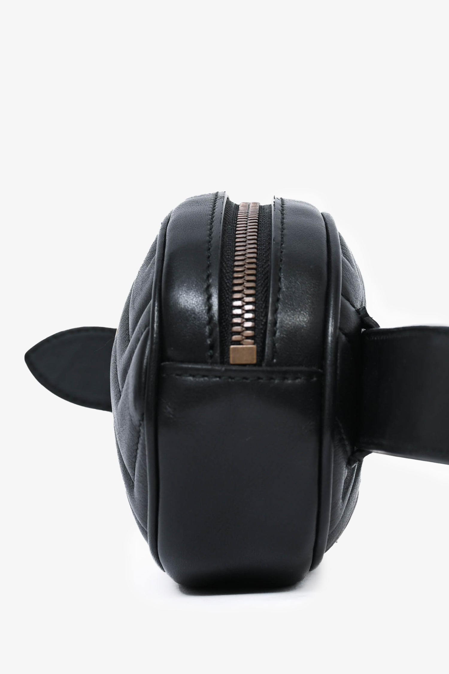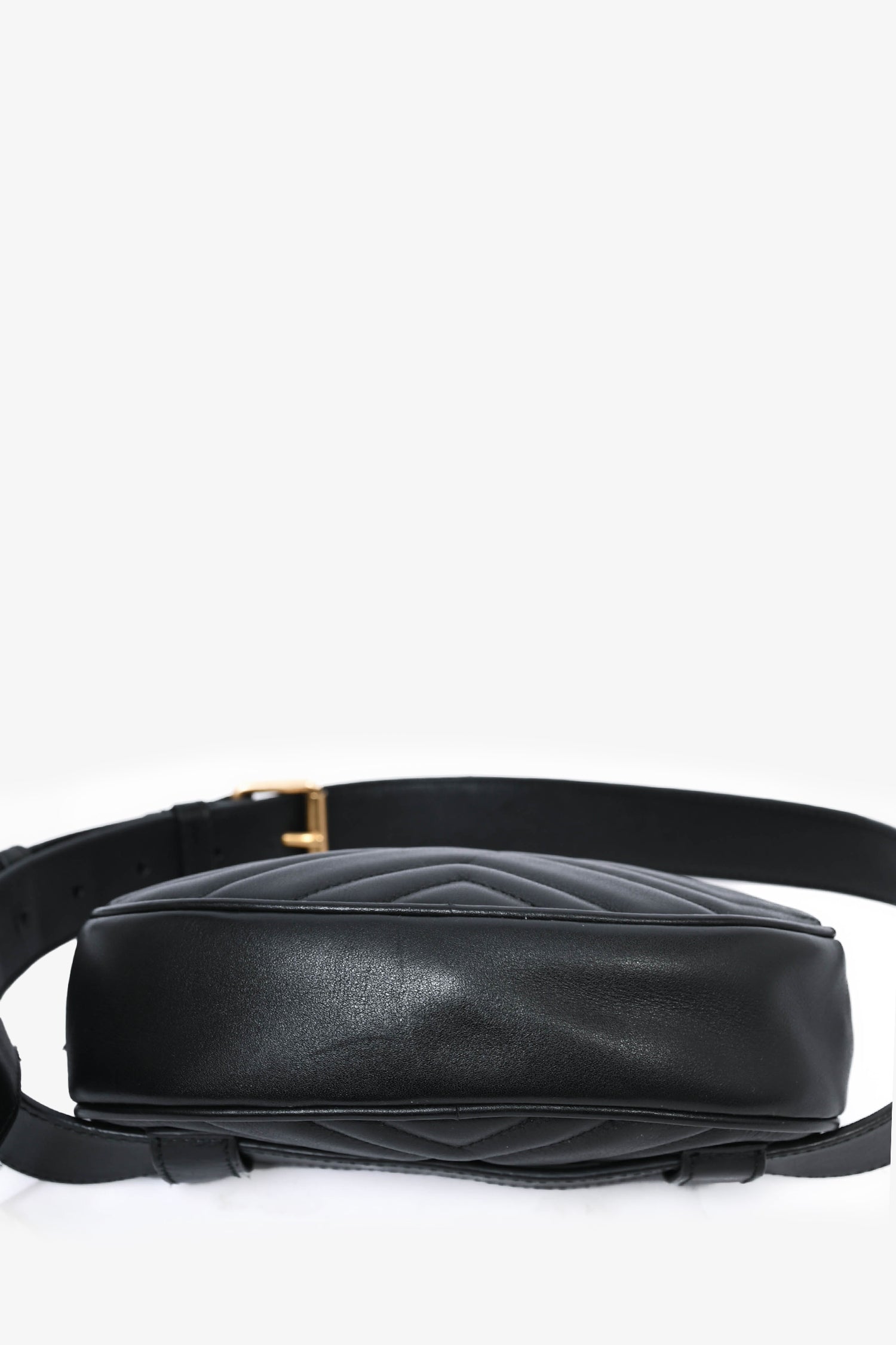 Refresh availabilityGucci Black Chevron Leather Marmont Belt Bag. Tonal stitching. Antiqued gold-toned hardware. Suede lined interior with single compartment. Top zipper. Adjustable belt strap.