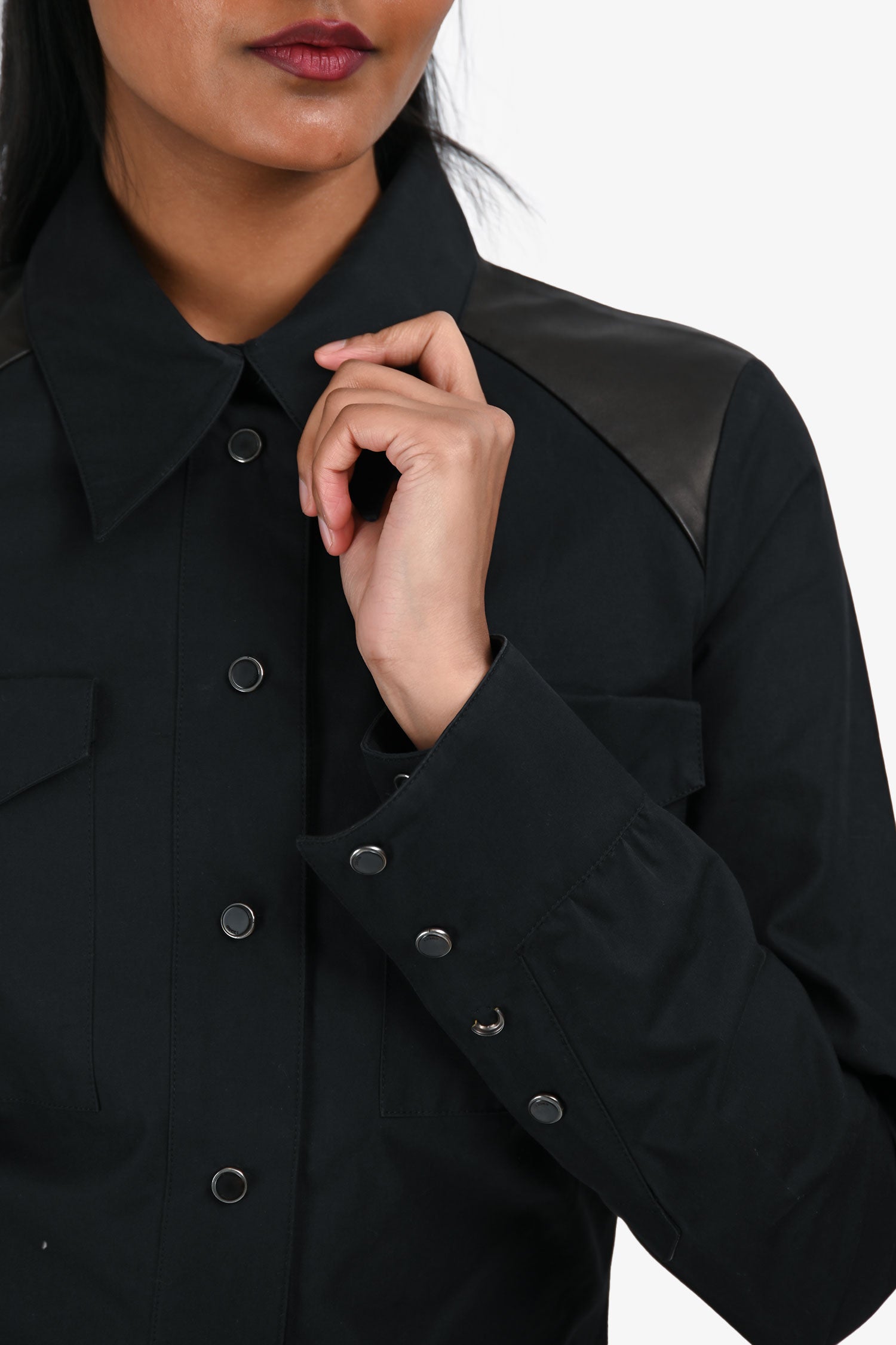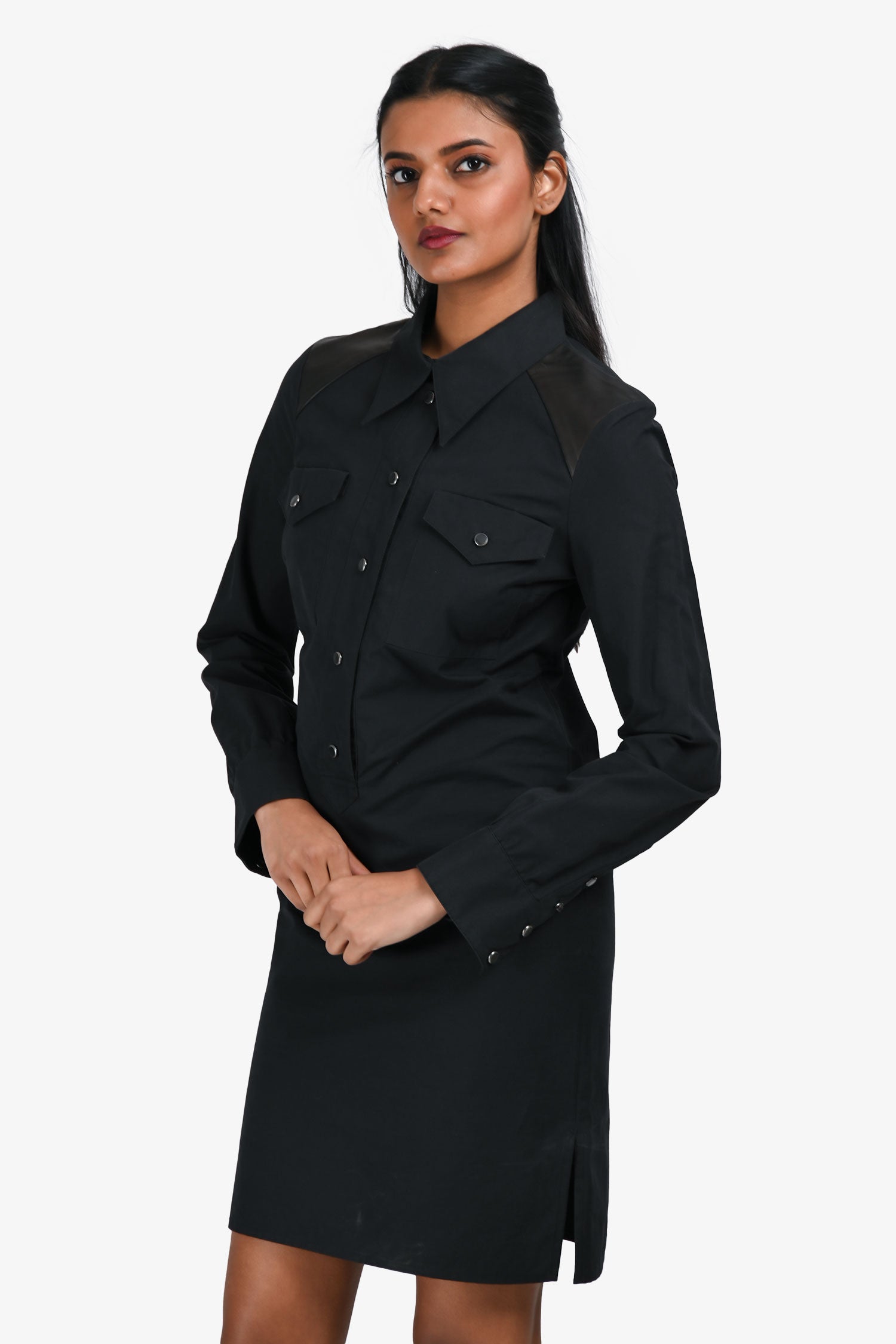 Refresh availabilityGucci Black Cotton Collared Button-Down Dress with Leather Detail. Pointed collar. Front snap button closure. Cuffs with snap button closures. 2 exterior chest pockets with snanp button closures. Silver-tone hardware. Tonal stitching.