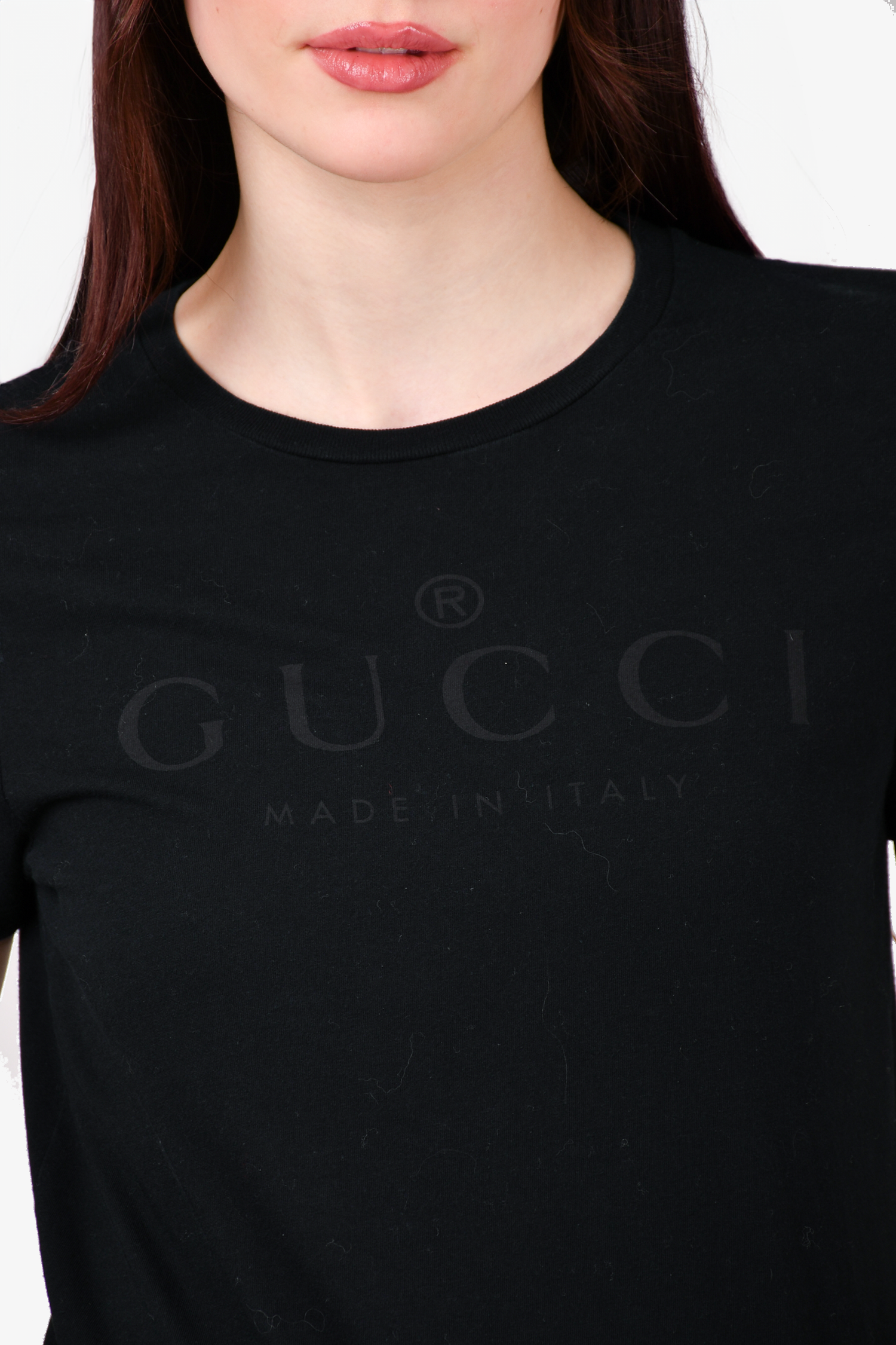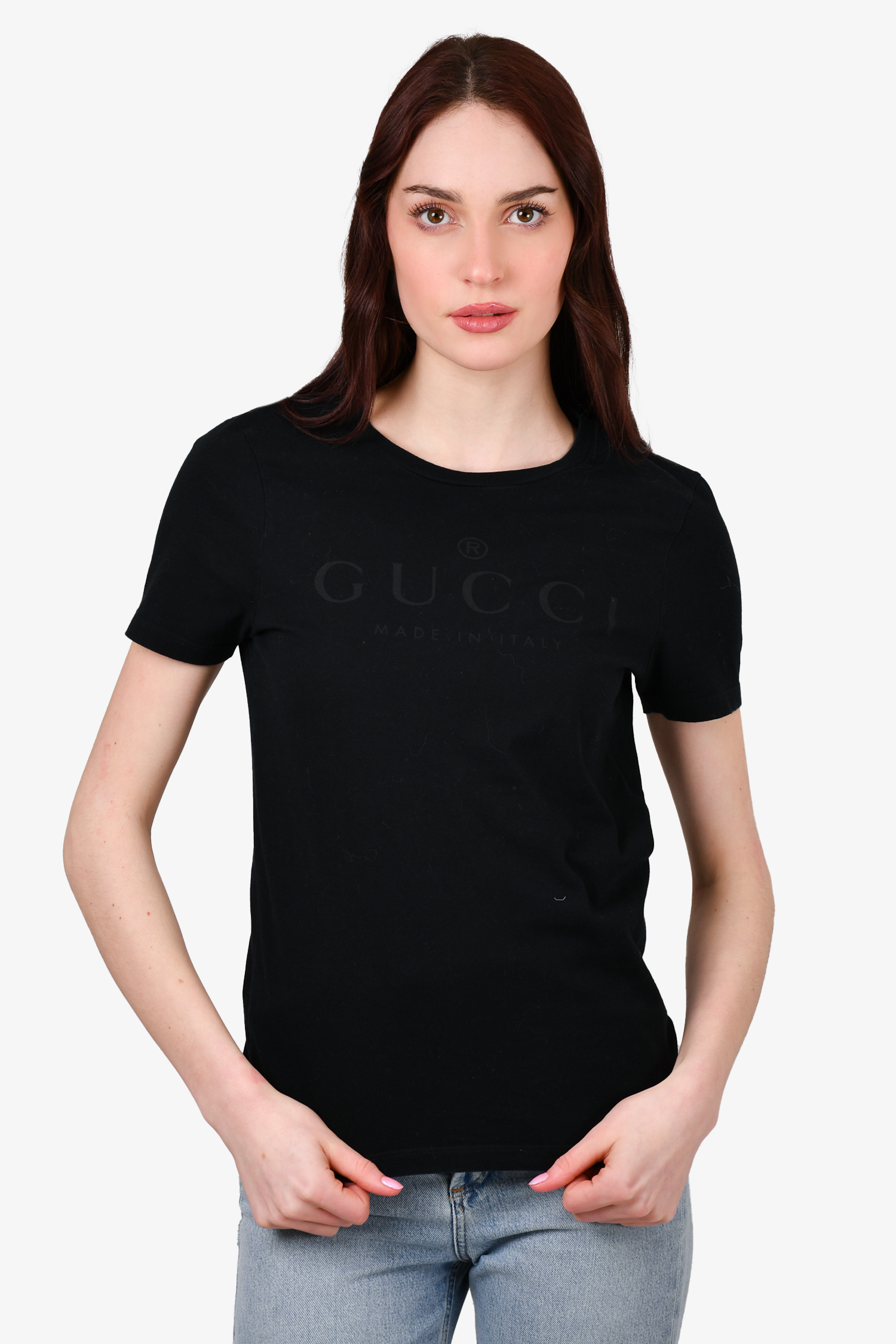 Refresh availabilityGucci Black Cotton Logo T-Shirt. Round neck. Pull-on. Tonal stitching.